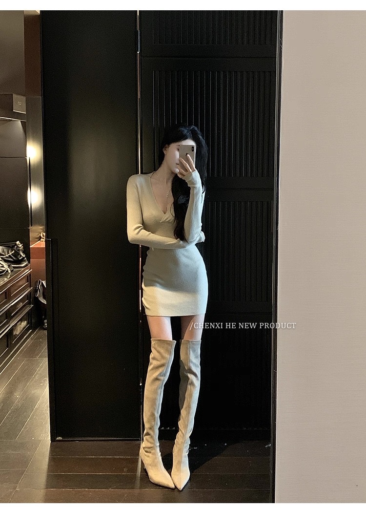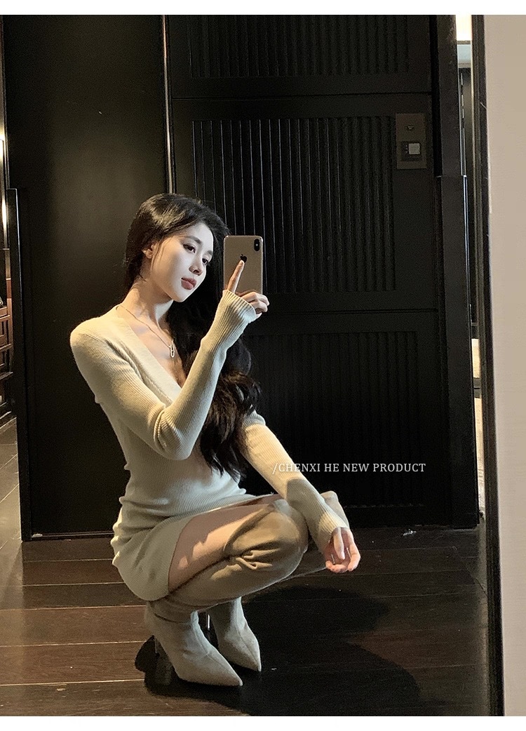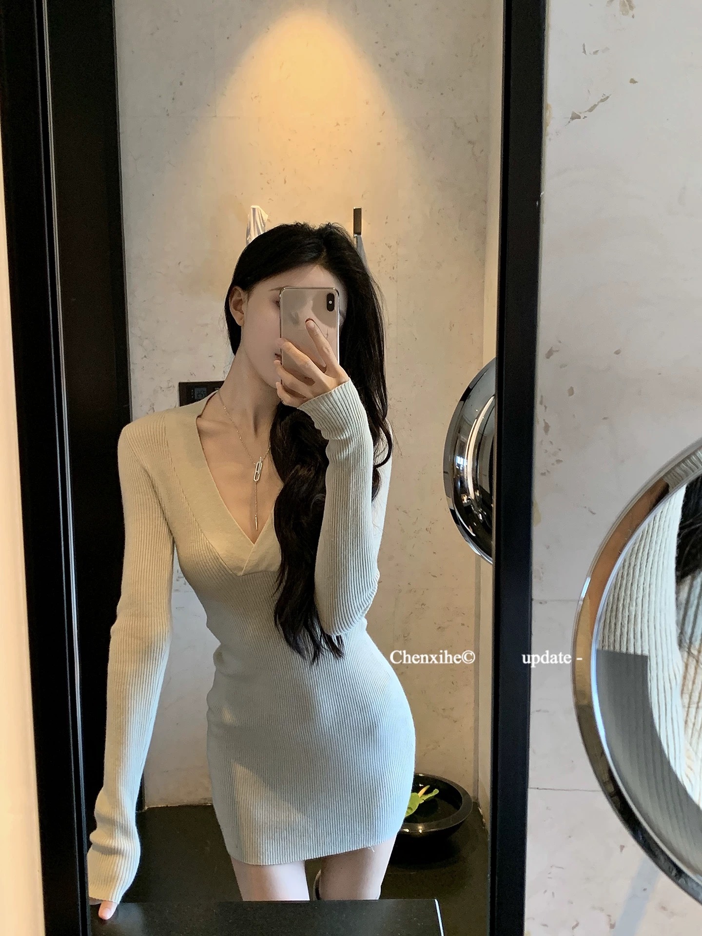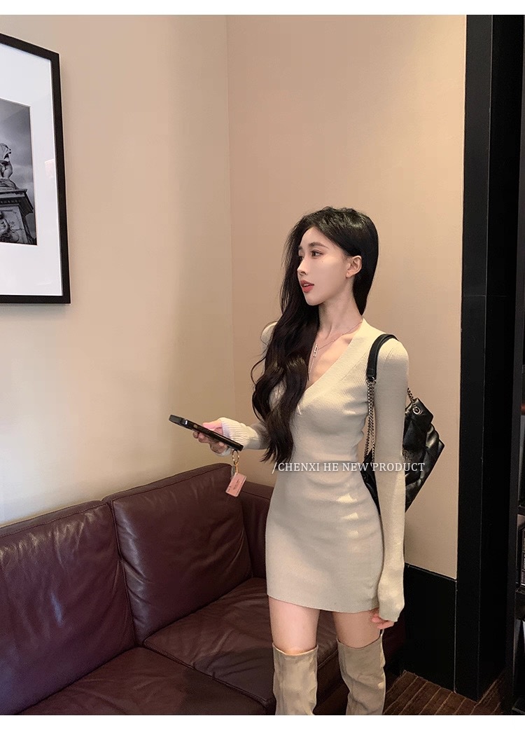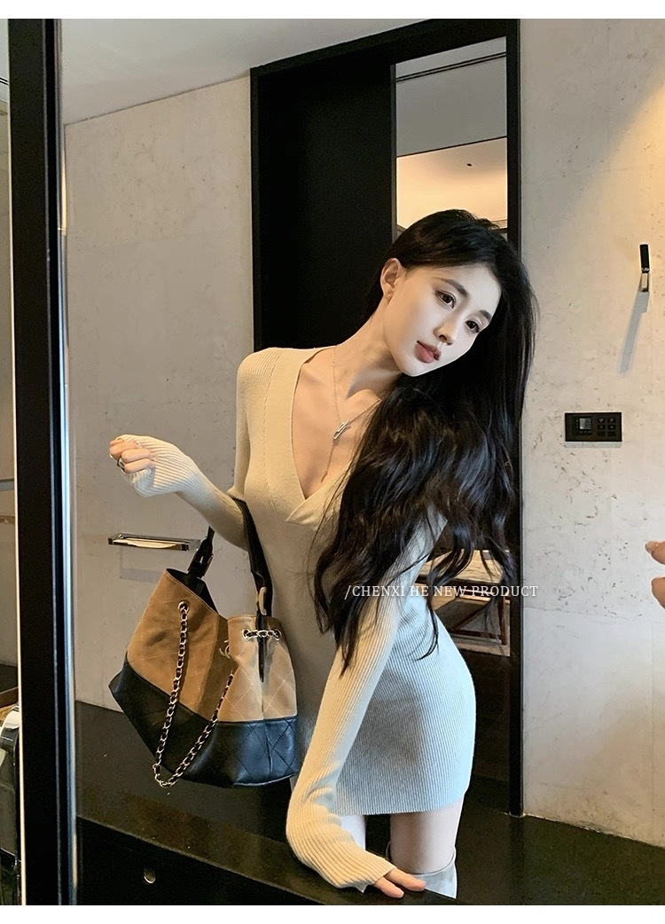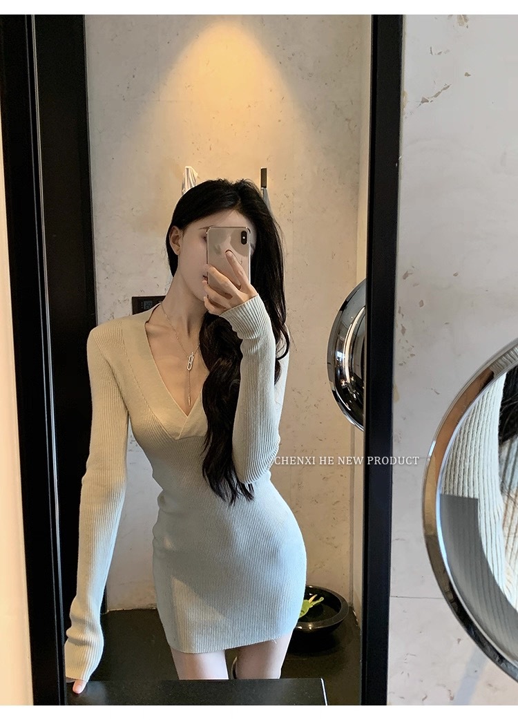 【纯欲娇媚】深V领长袖收腰修身短款针织连衣裙