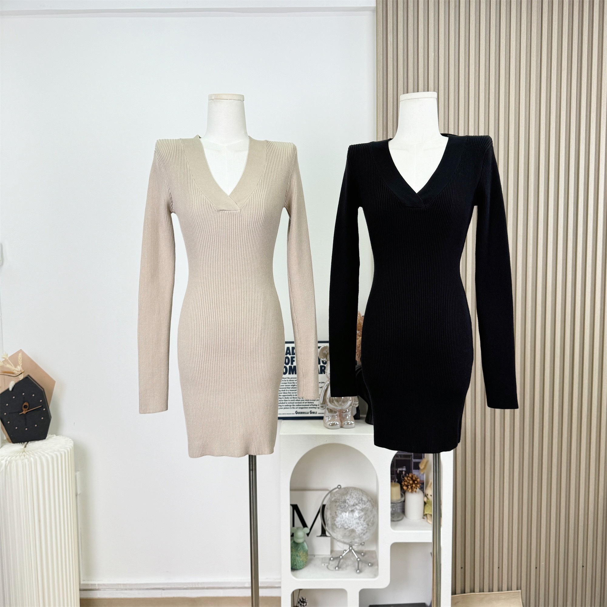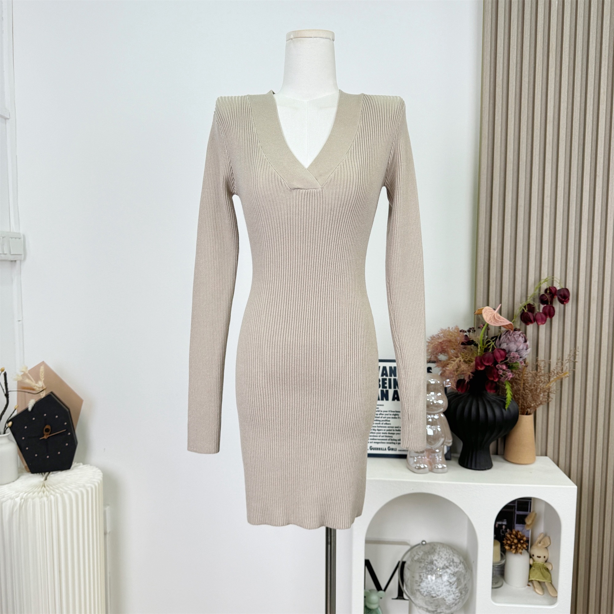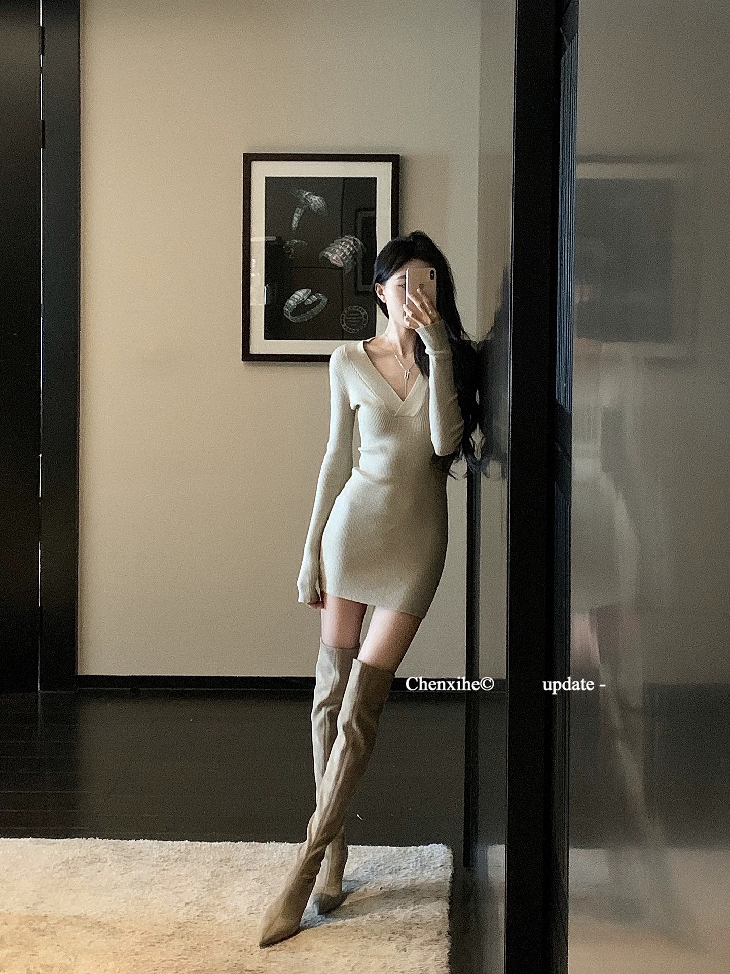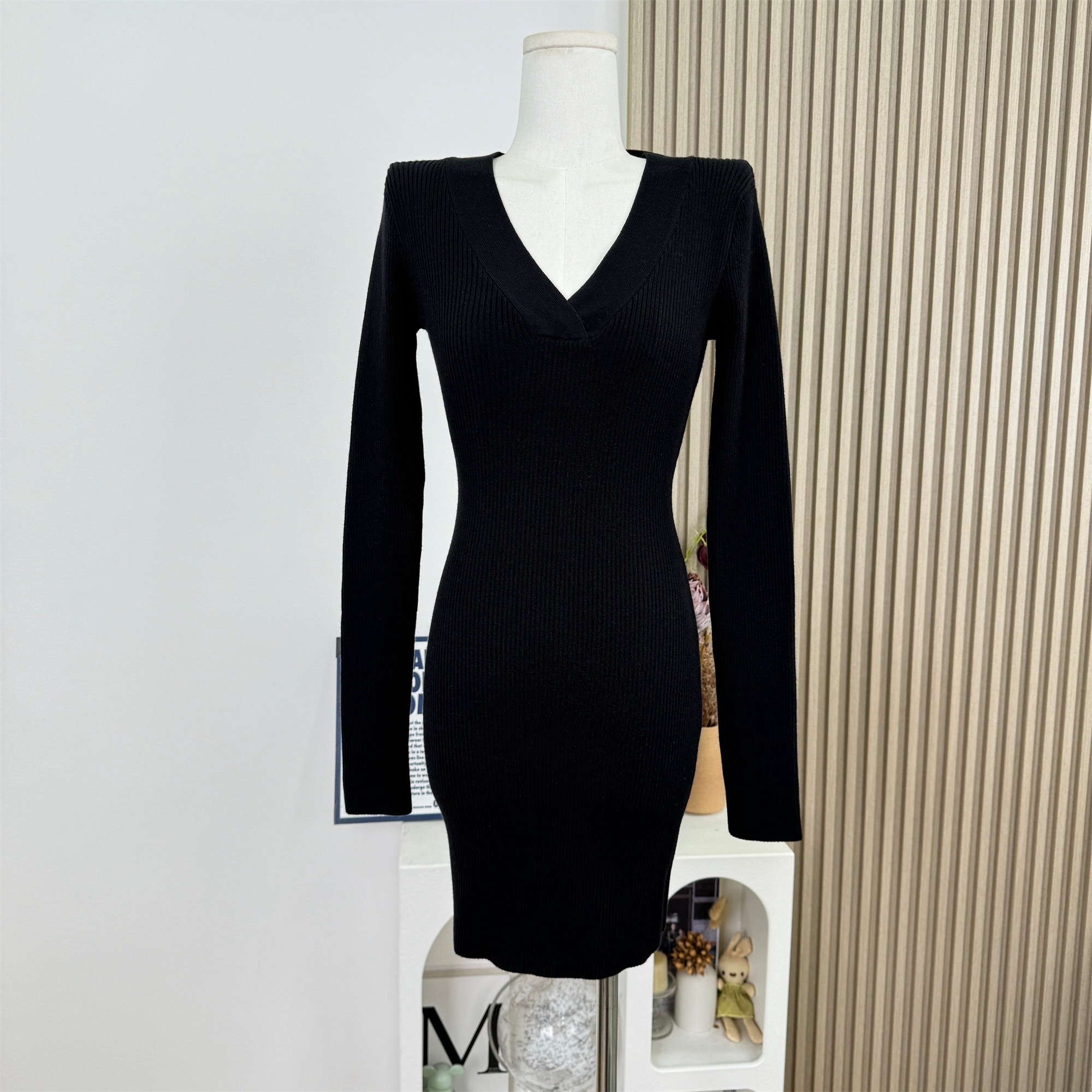 【纯欲娇媚】深V领长袖收腰修身短款针织连衣裙