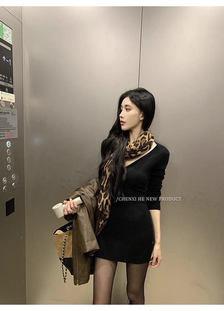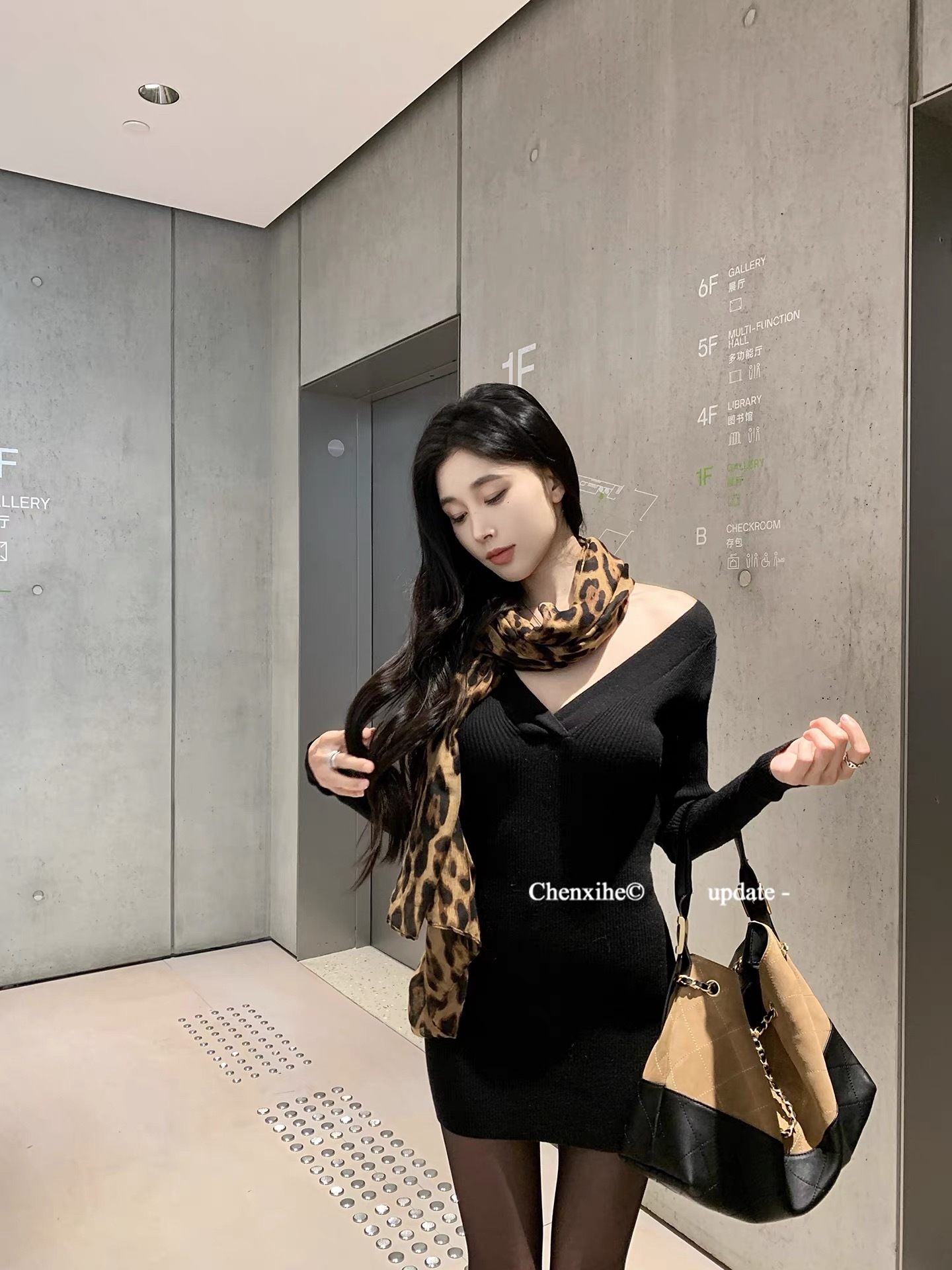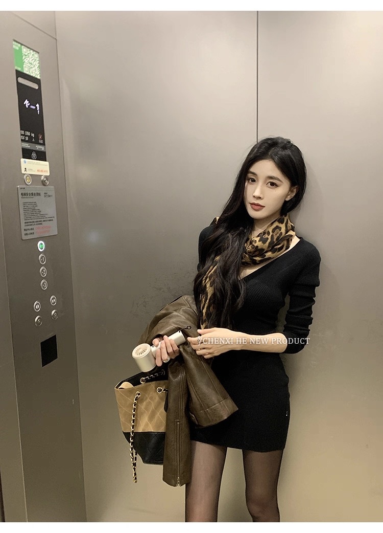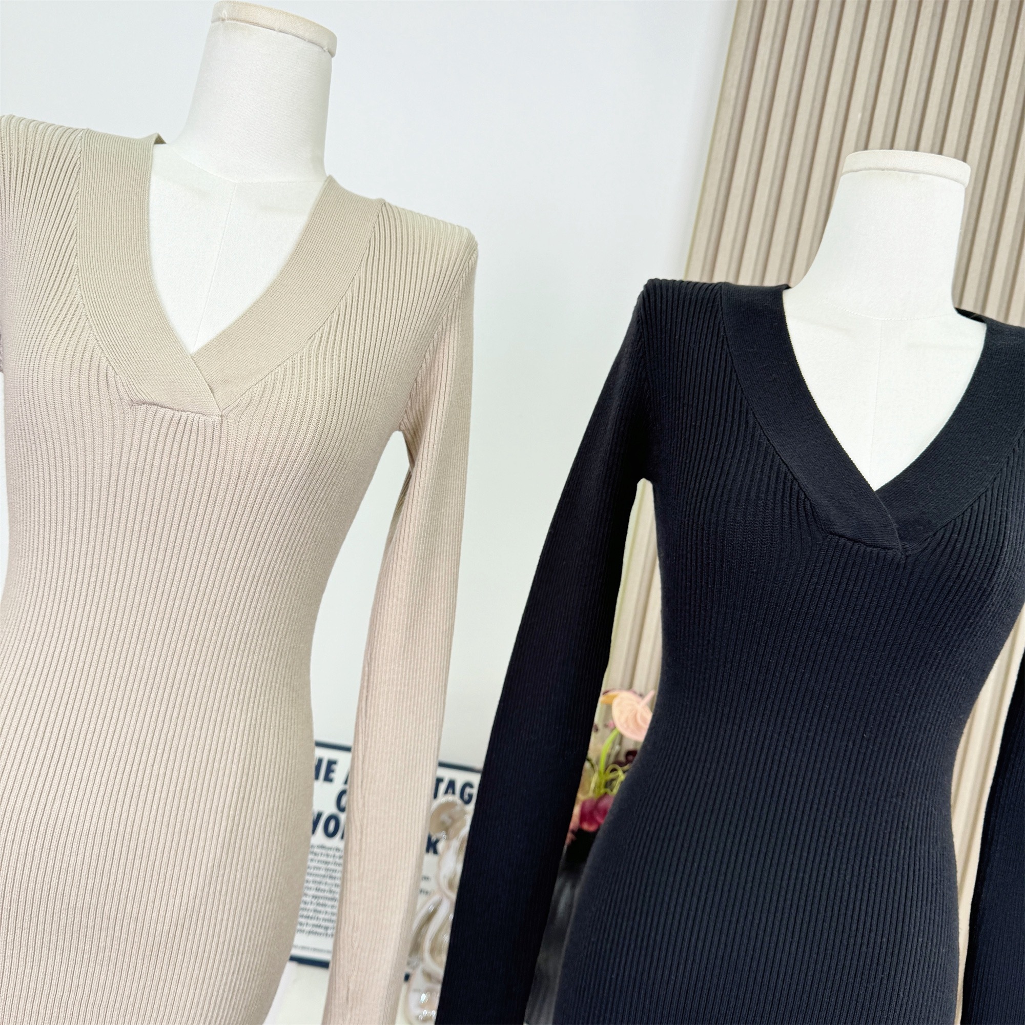 【纯欲娇媚】深V领长袖收腰修身短款针织连衣裙