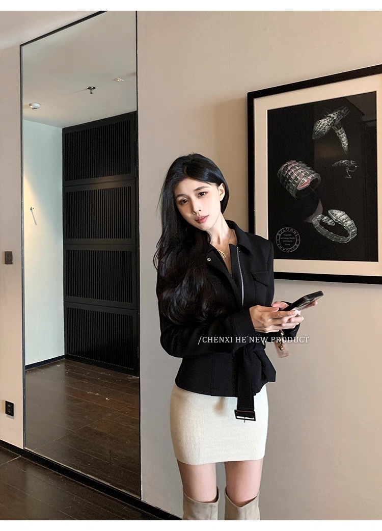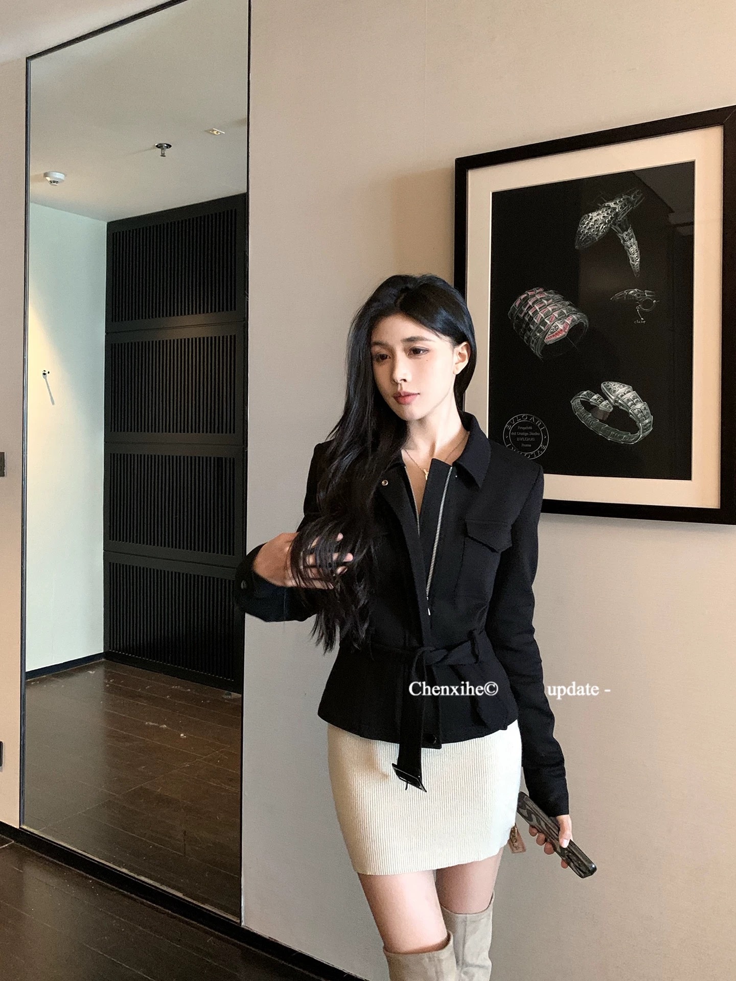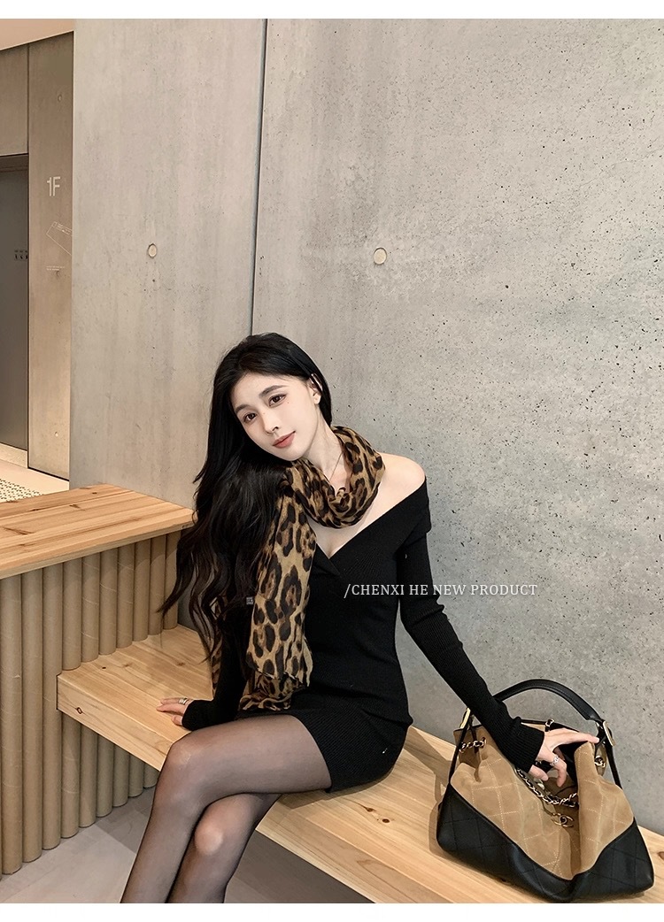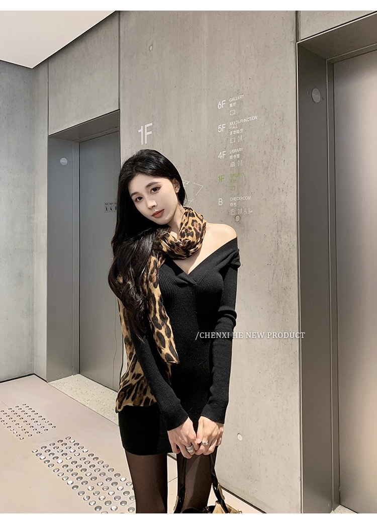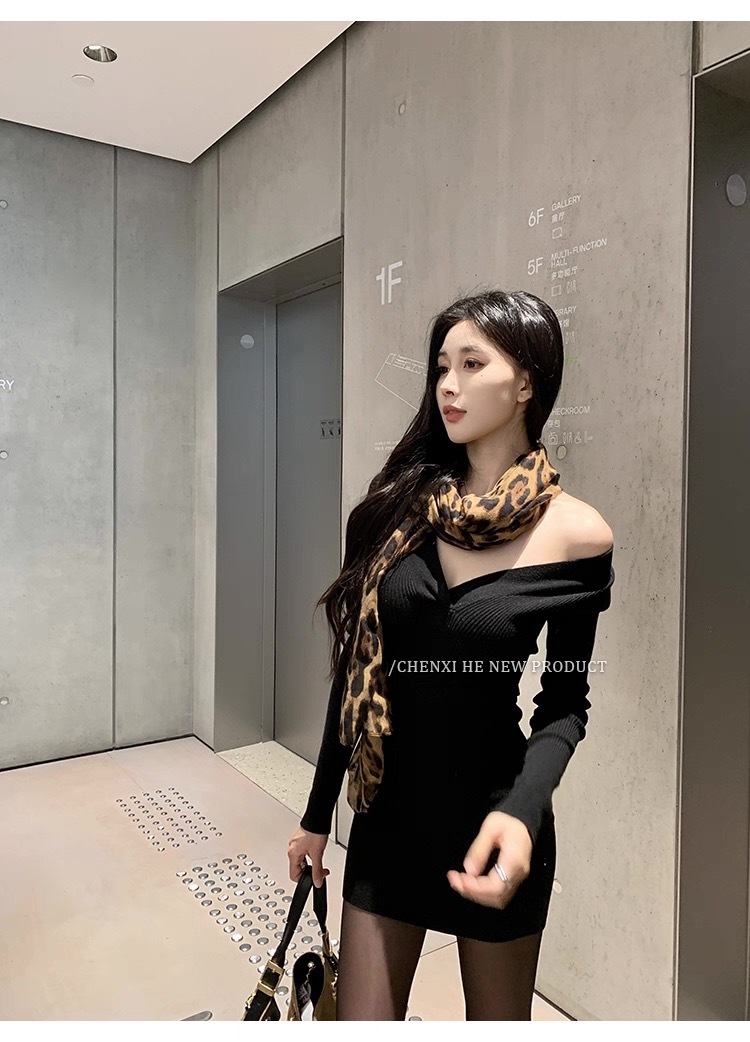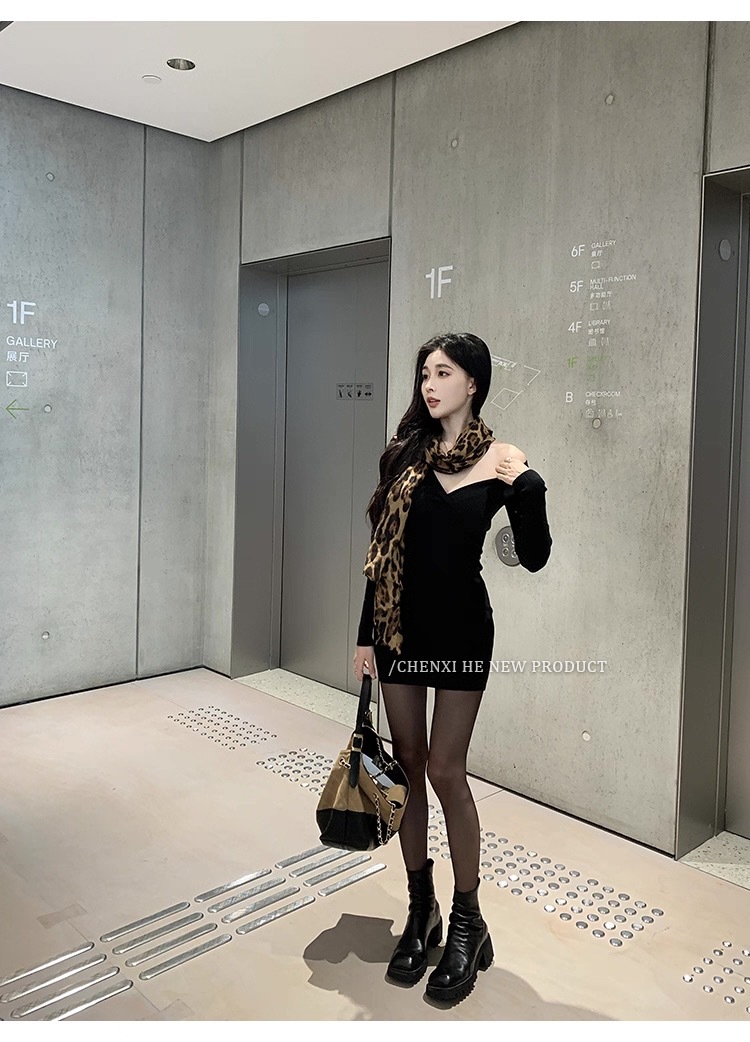 【纯欲娇媚】深V领长袖收腰修身短款针织连衣裙