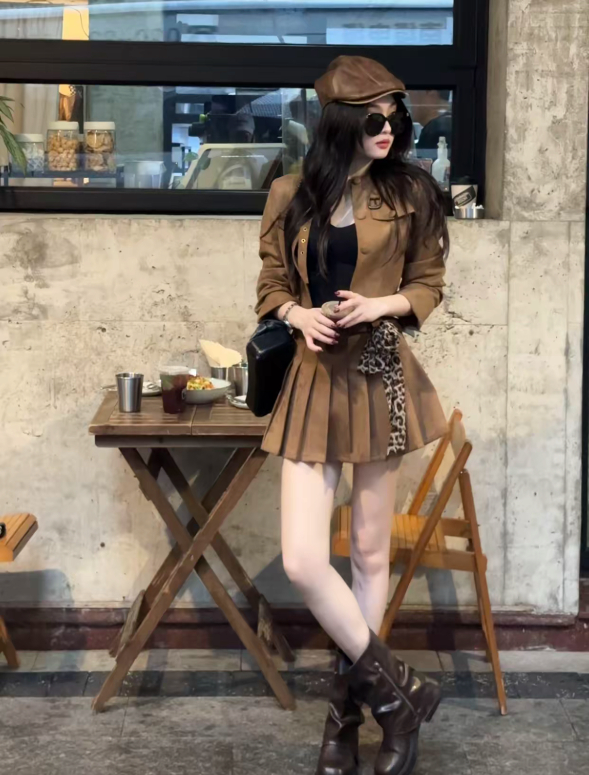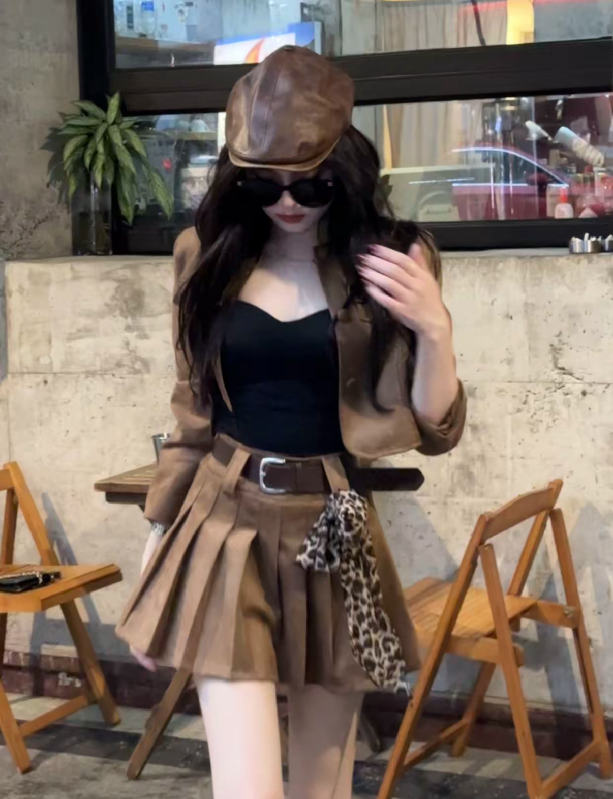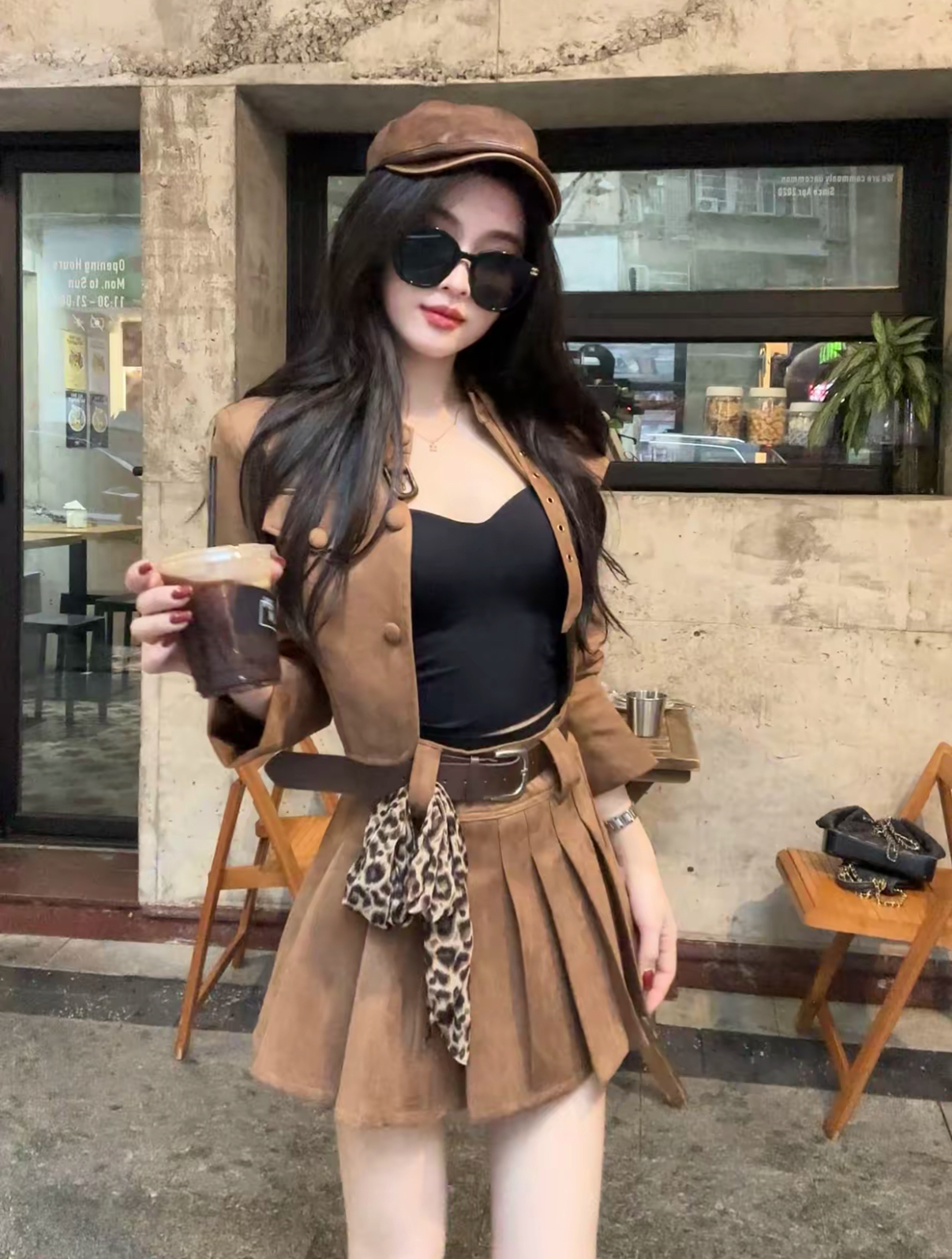 【美拉德棕】复古美拉德棕色短款夹克套装(包括腰带和豹纹丝巾)