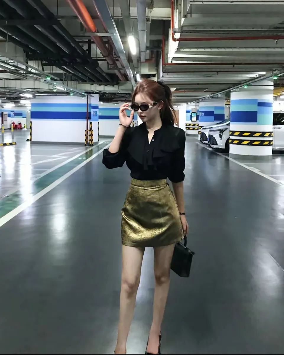【枫林晚照】时尚气质木耳边雪纺衫+a字短裙
