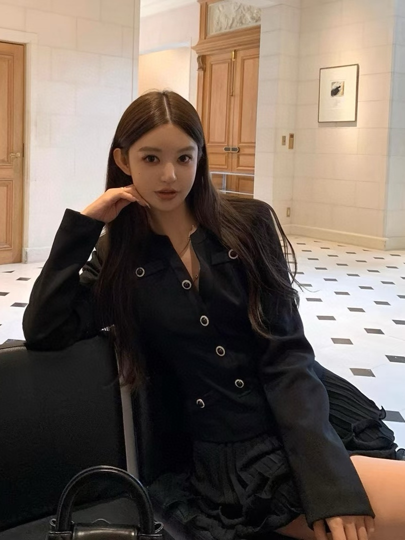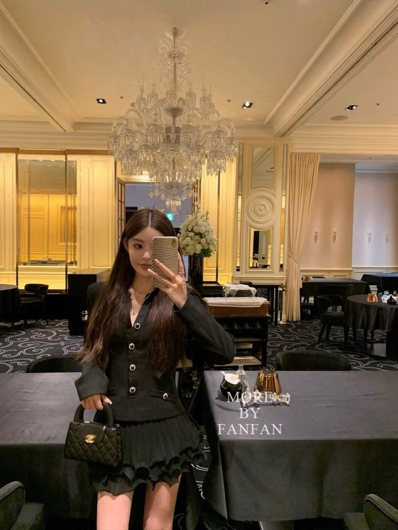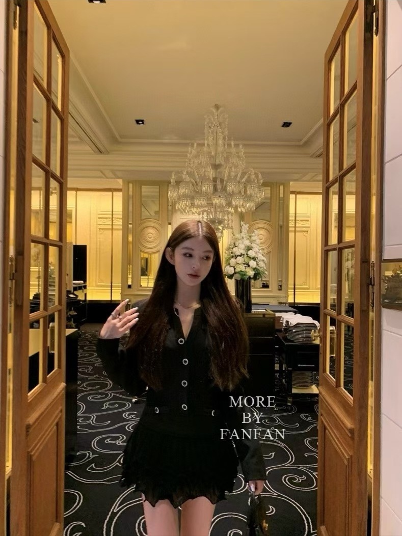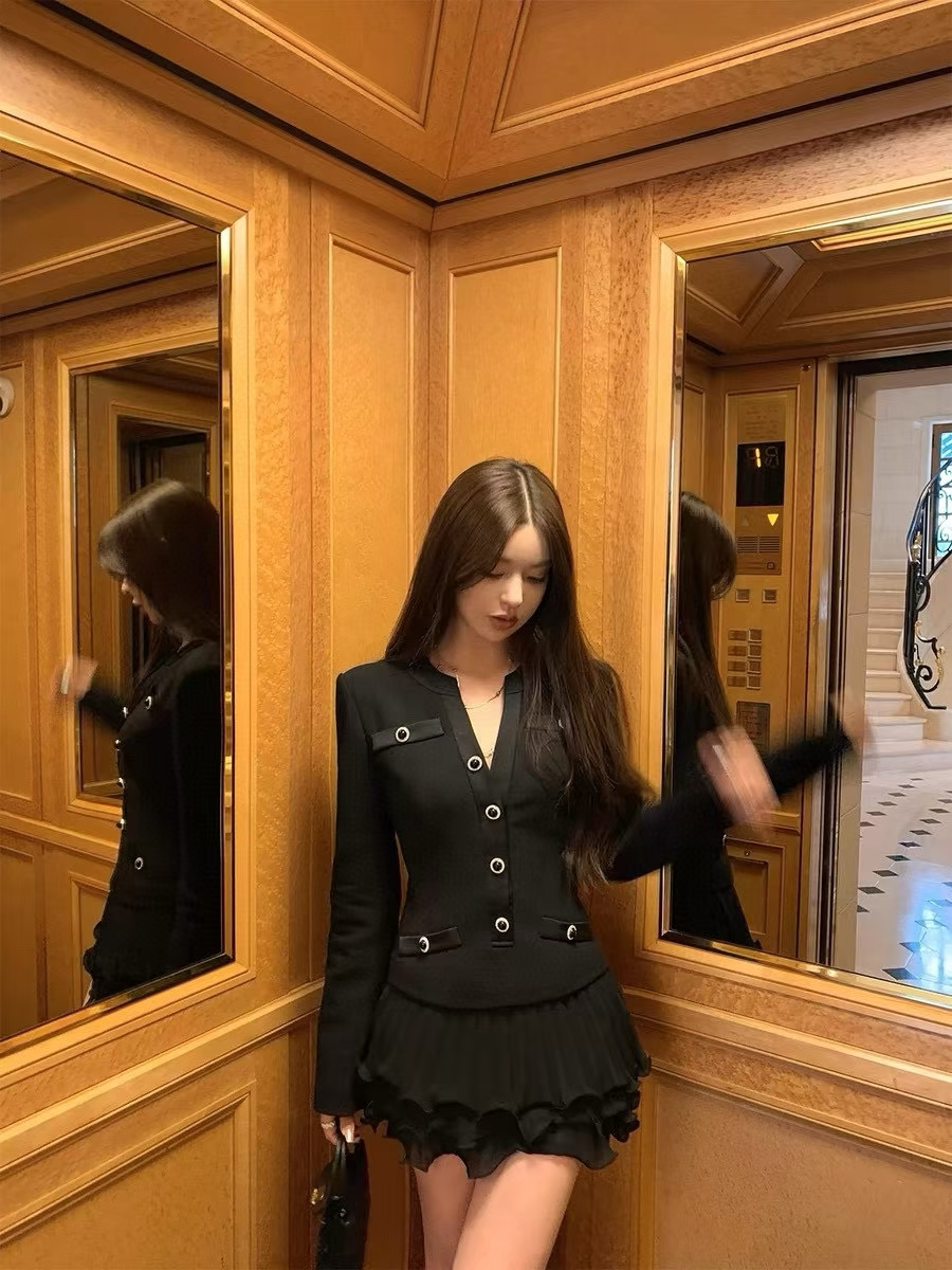 【黑松露蛋糕】优雅显贵收腰香风上衣+压褶密拷花边蛋糕半身裙套装