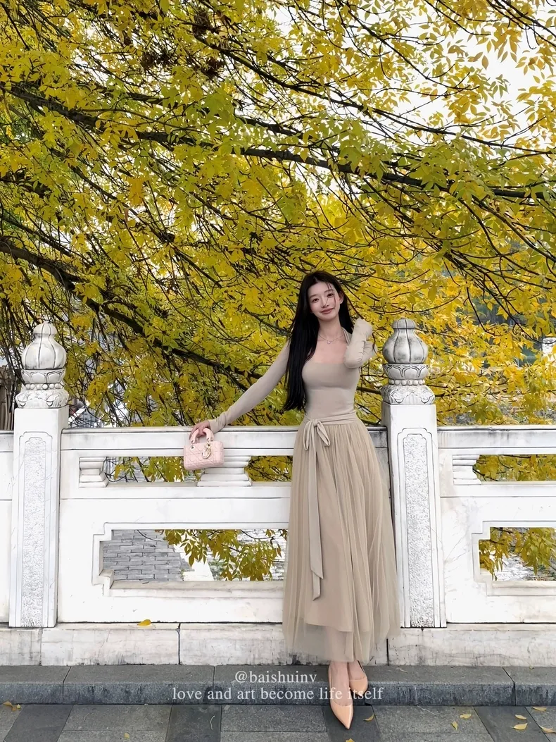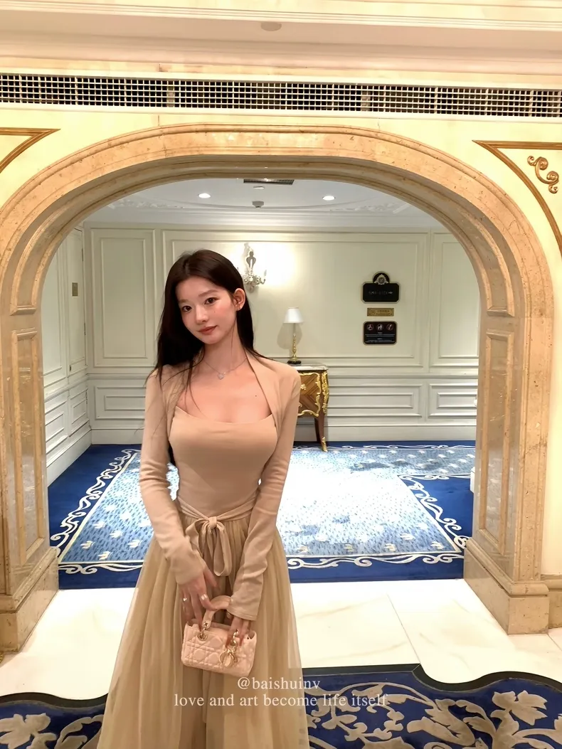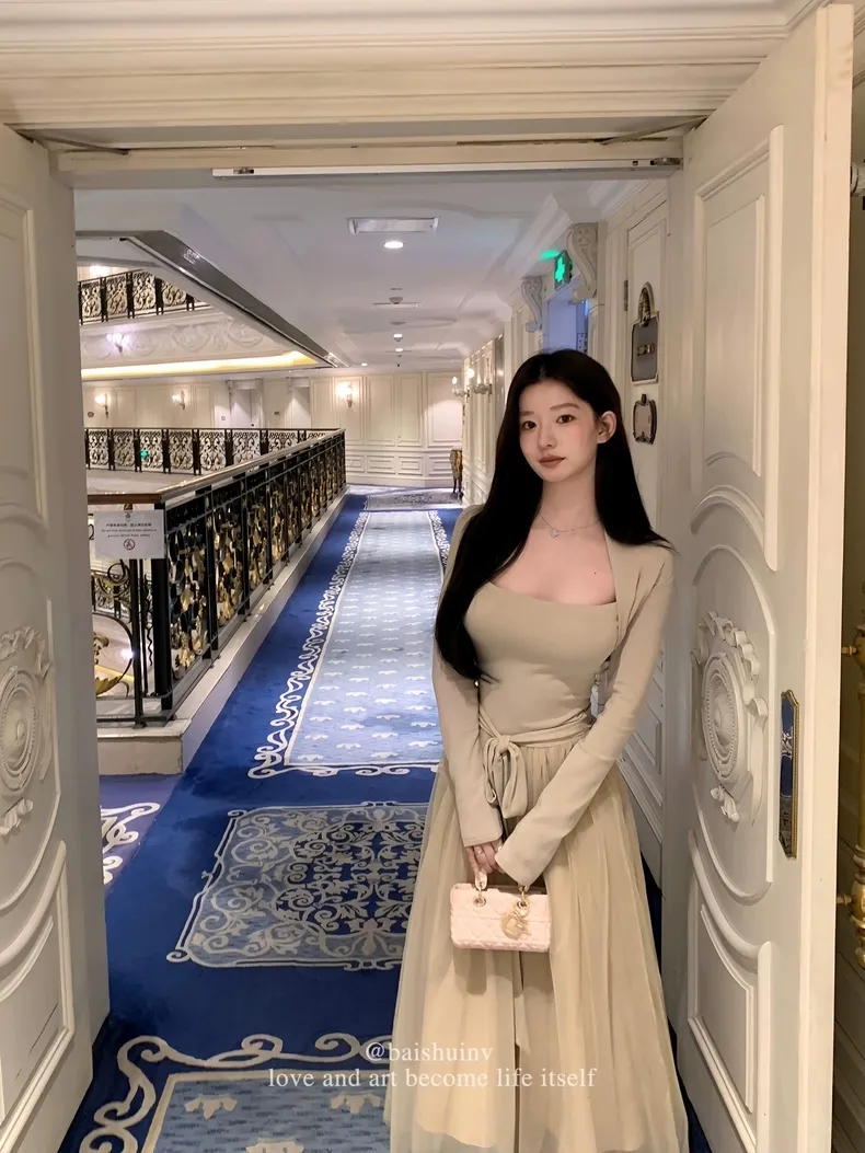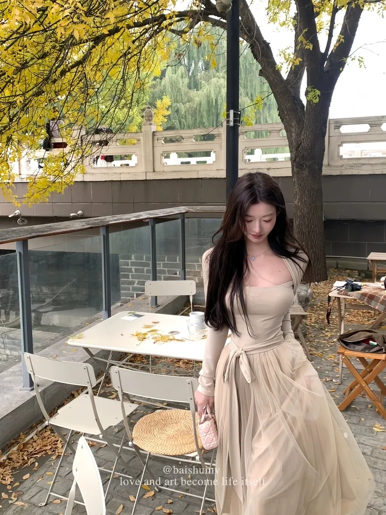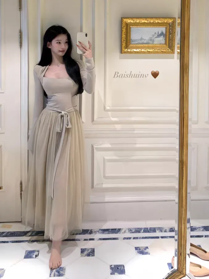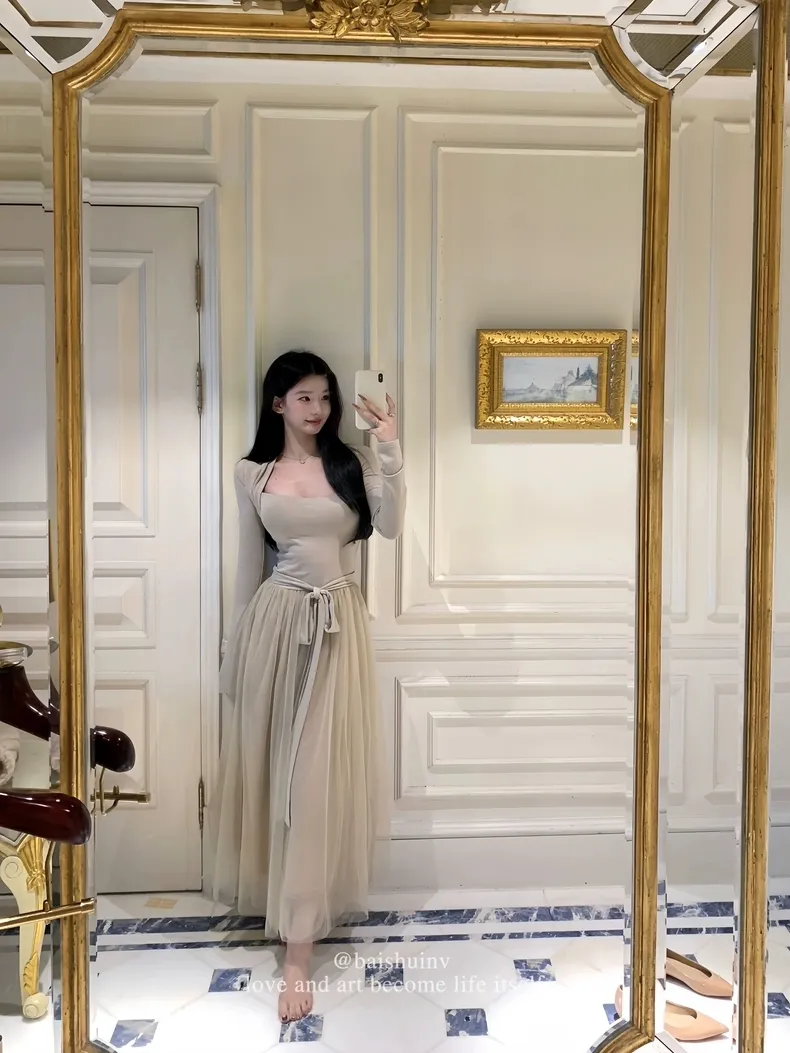【芭蕾艺术生】坎肩领拼接网纱连衣裙
