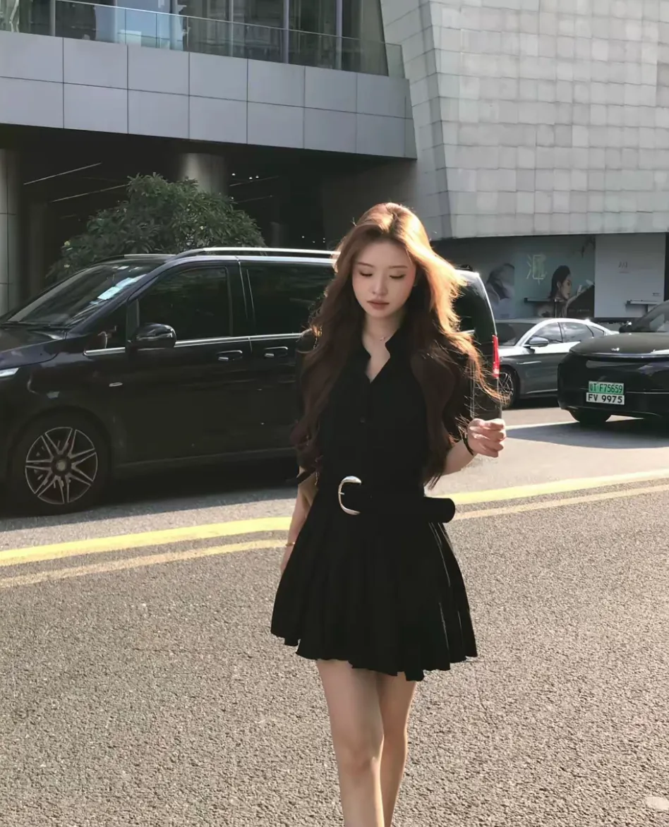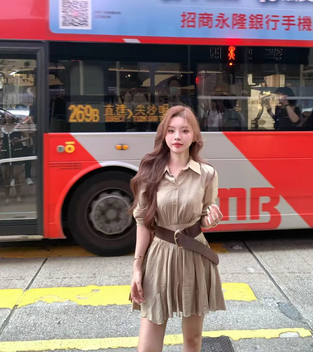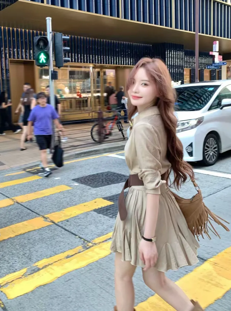 【浅沙微风】气质翻领长袖收腰短款连衣裙
