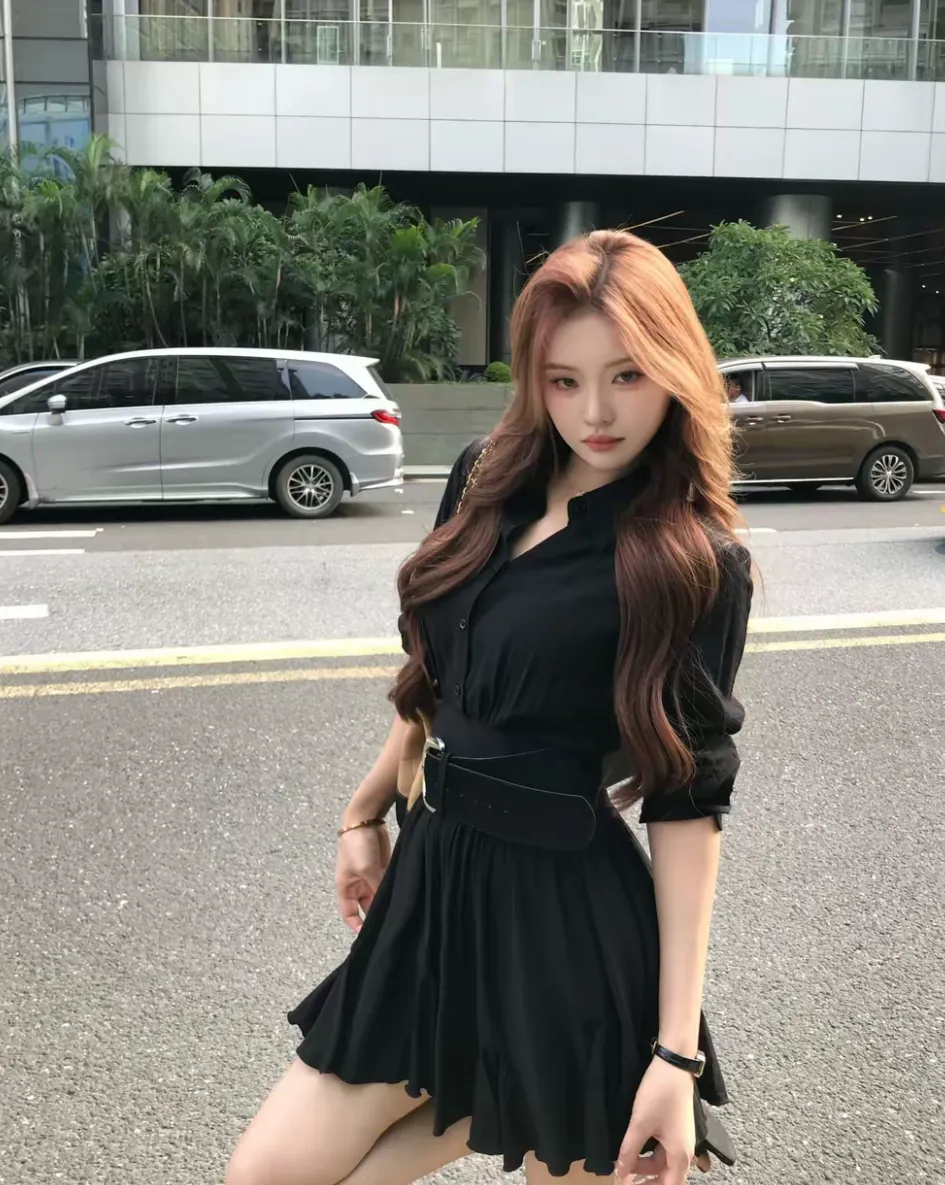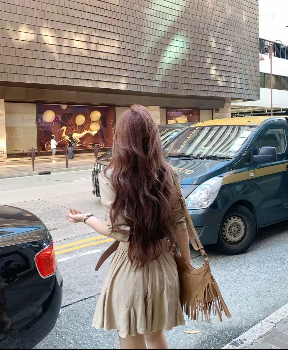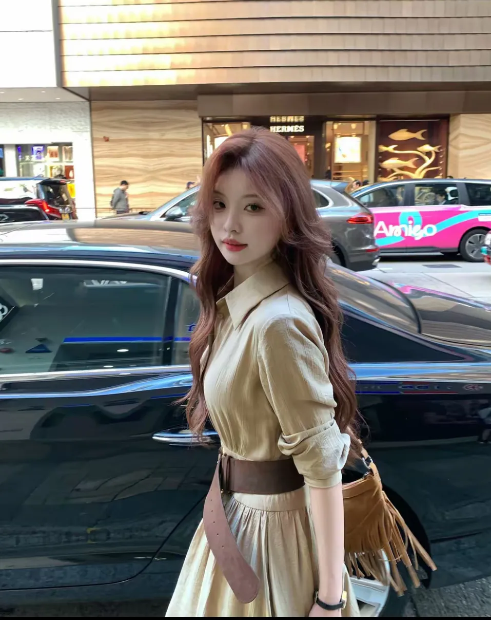 【浅沙微风】气质翻领长袖收腰短款连衣裙