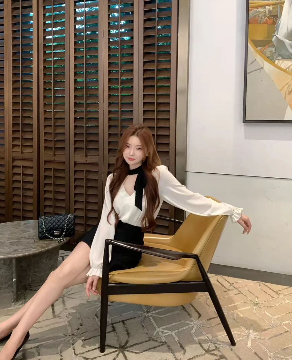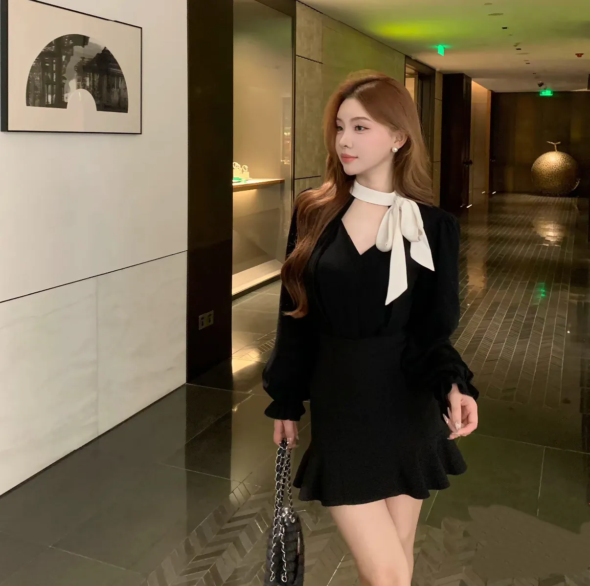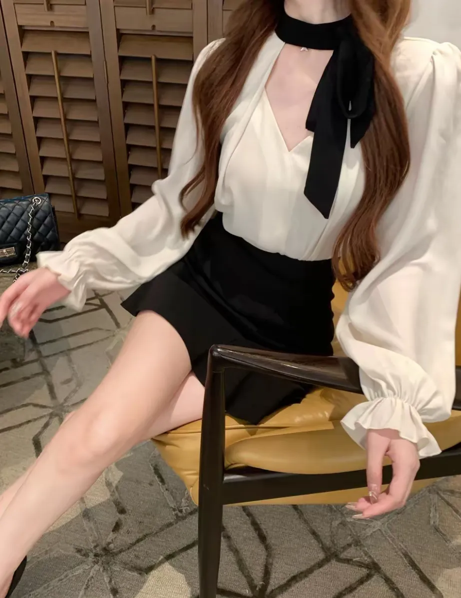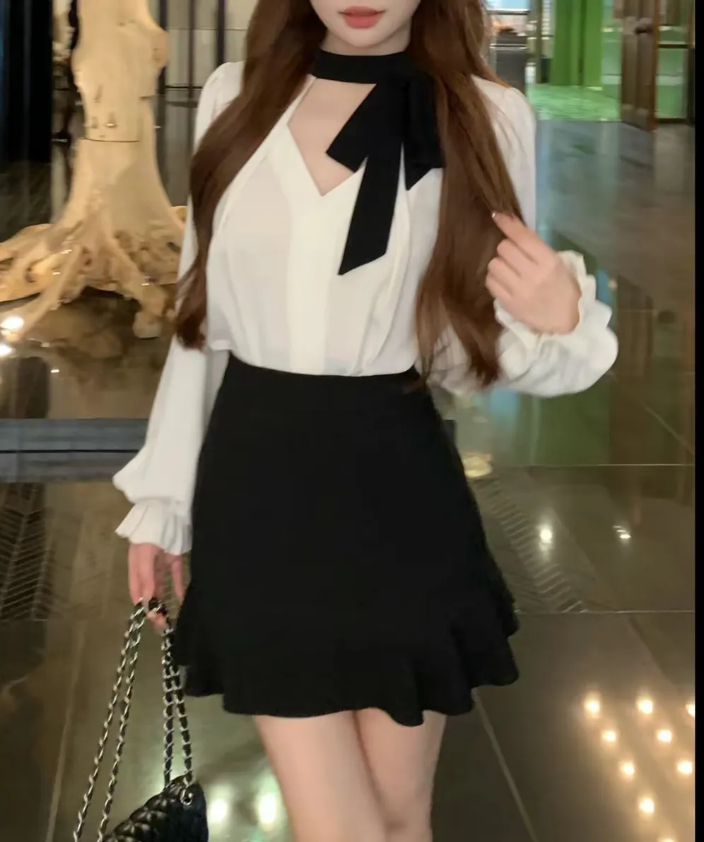 【蓝溪月影】V领设计系带显瘦衬衫+高腰鱼尾短裙