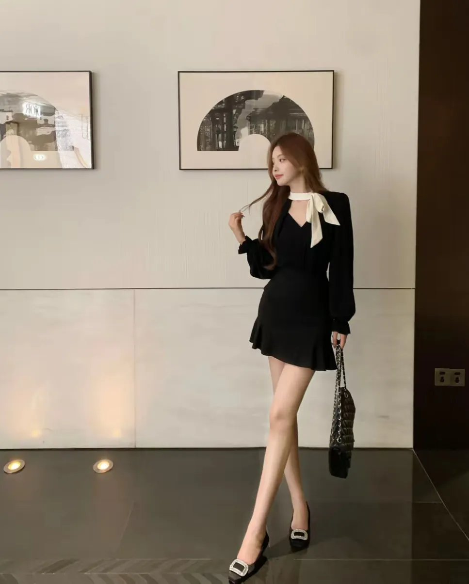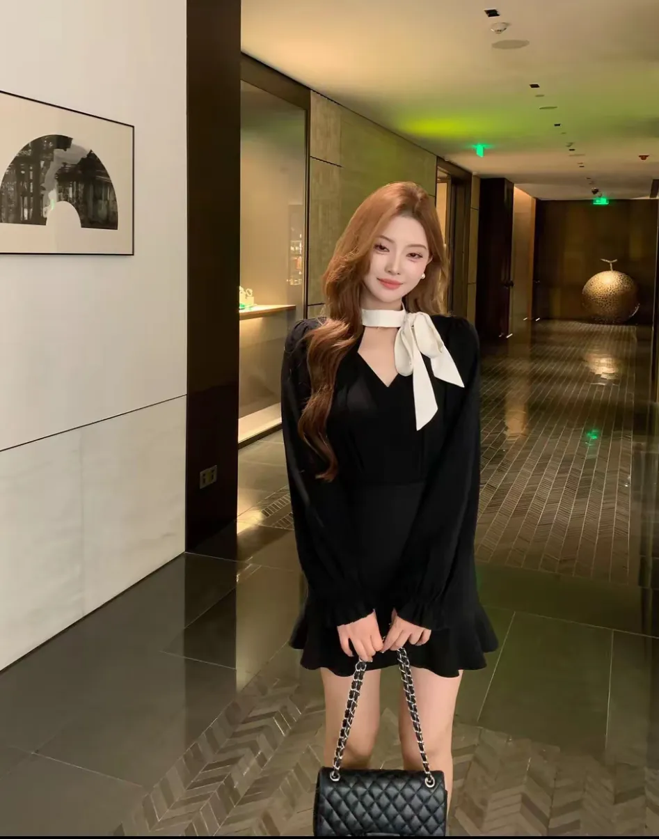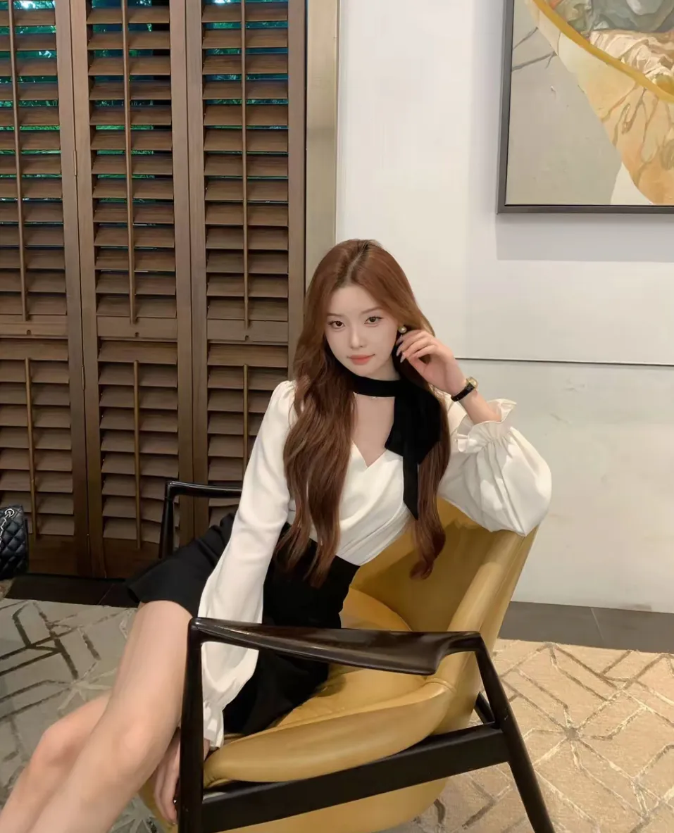 【蓝溪月影】V领设计系带显瘦衬衫+高腰鱼尾短裙