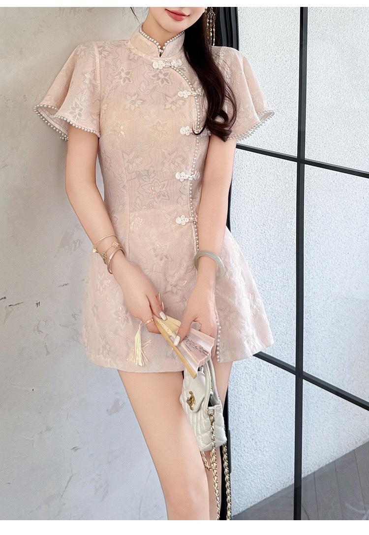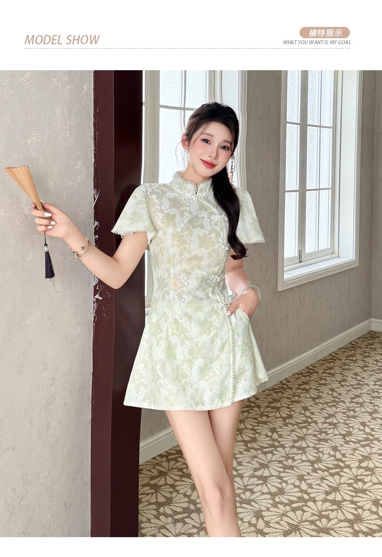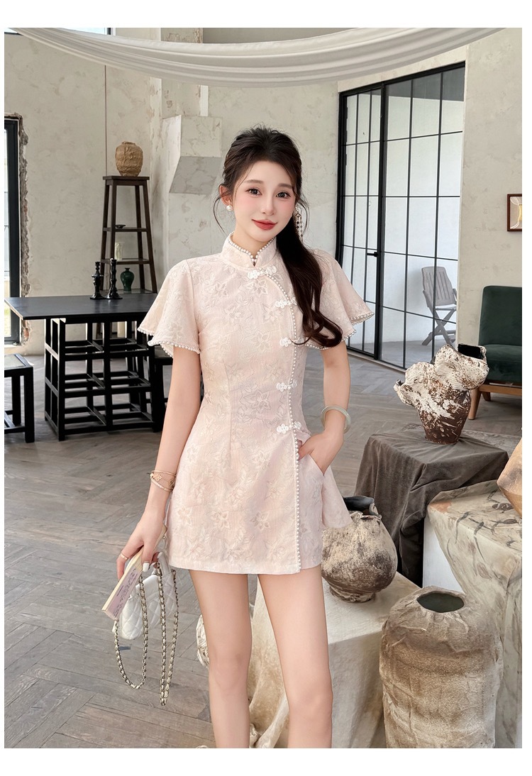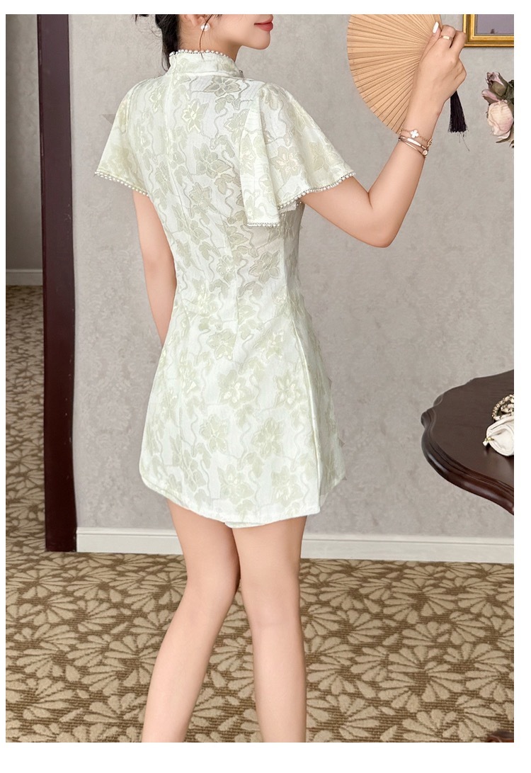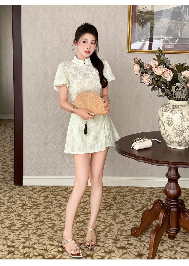 【红尘锦梦】提花立领盘扣开叉上衣+短裤两件套