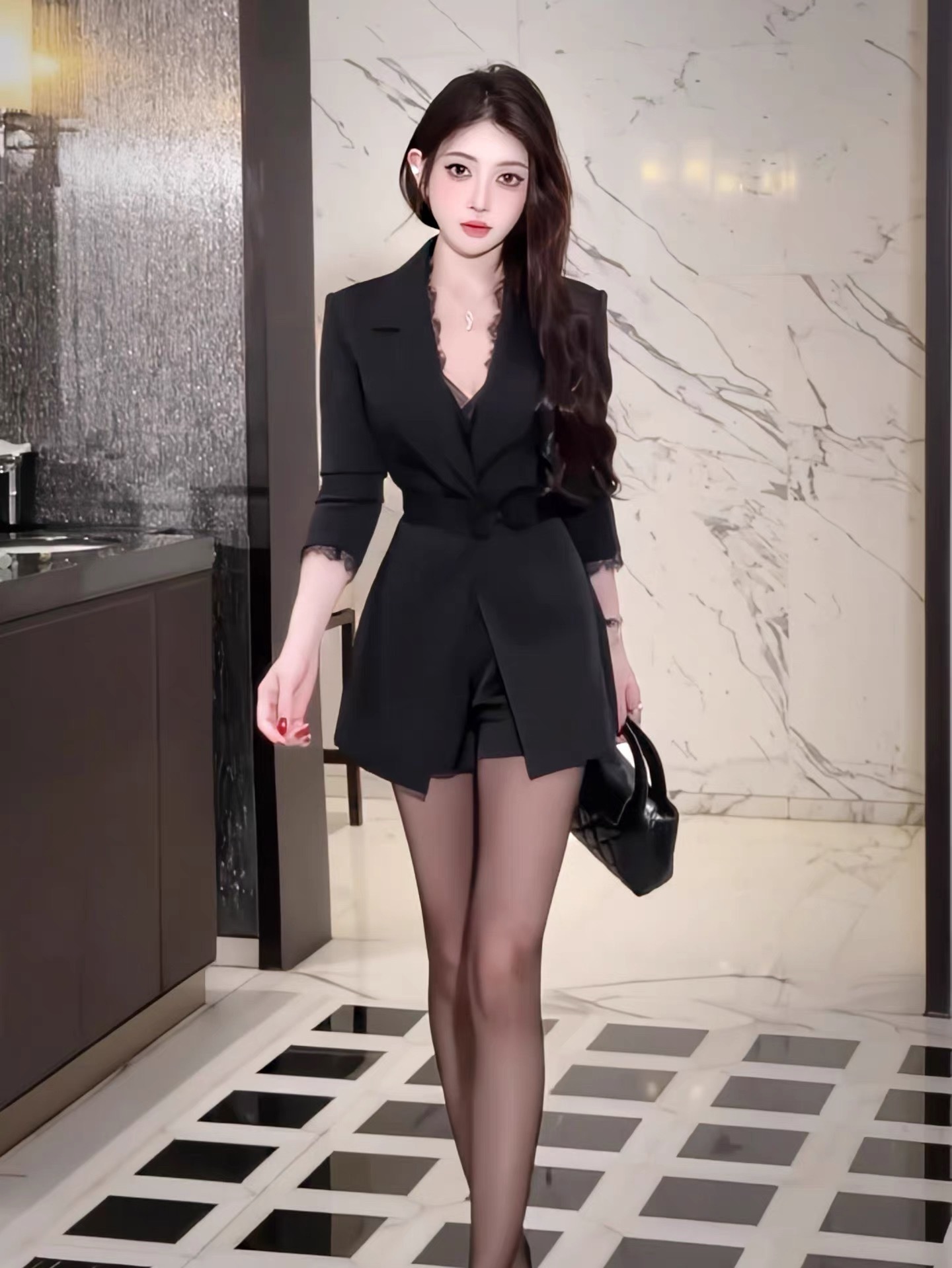 【玫瑰夜曲】纽扣翻领蕾丝西装外套+短裤套装
