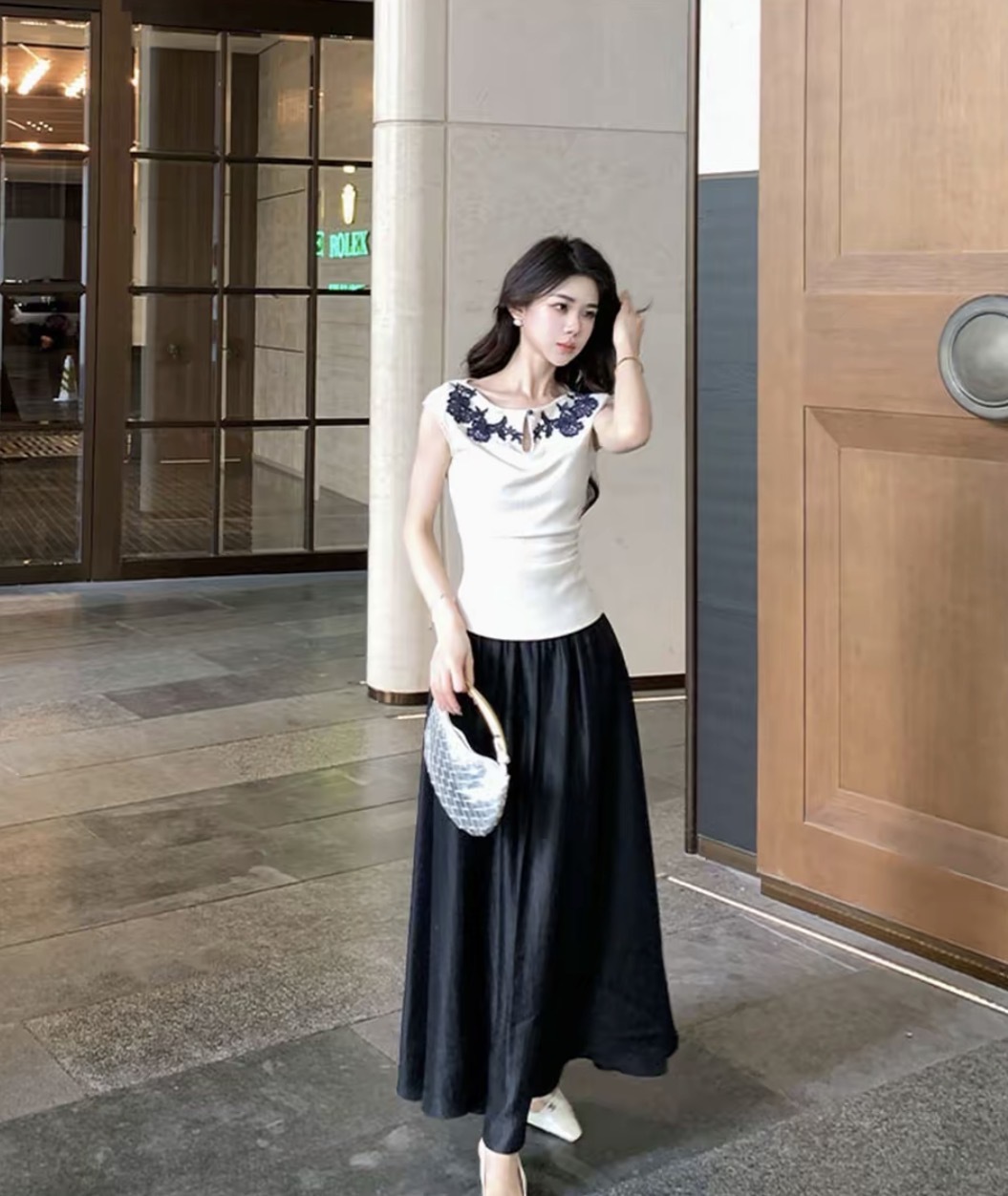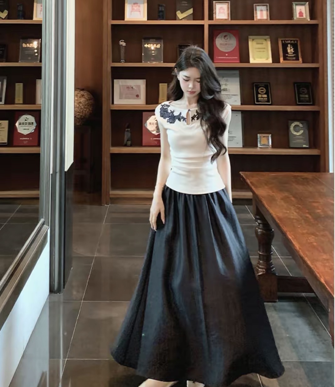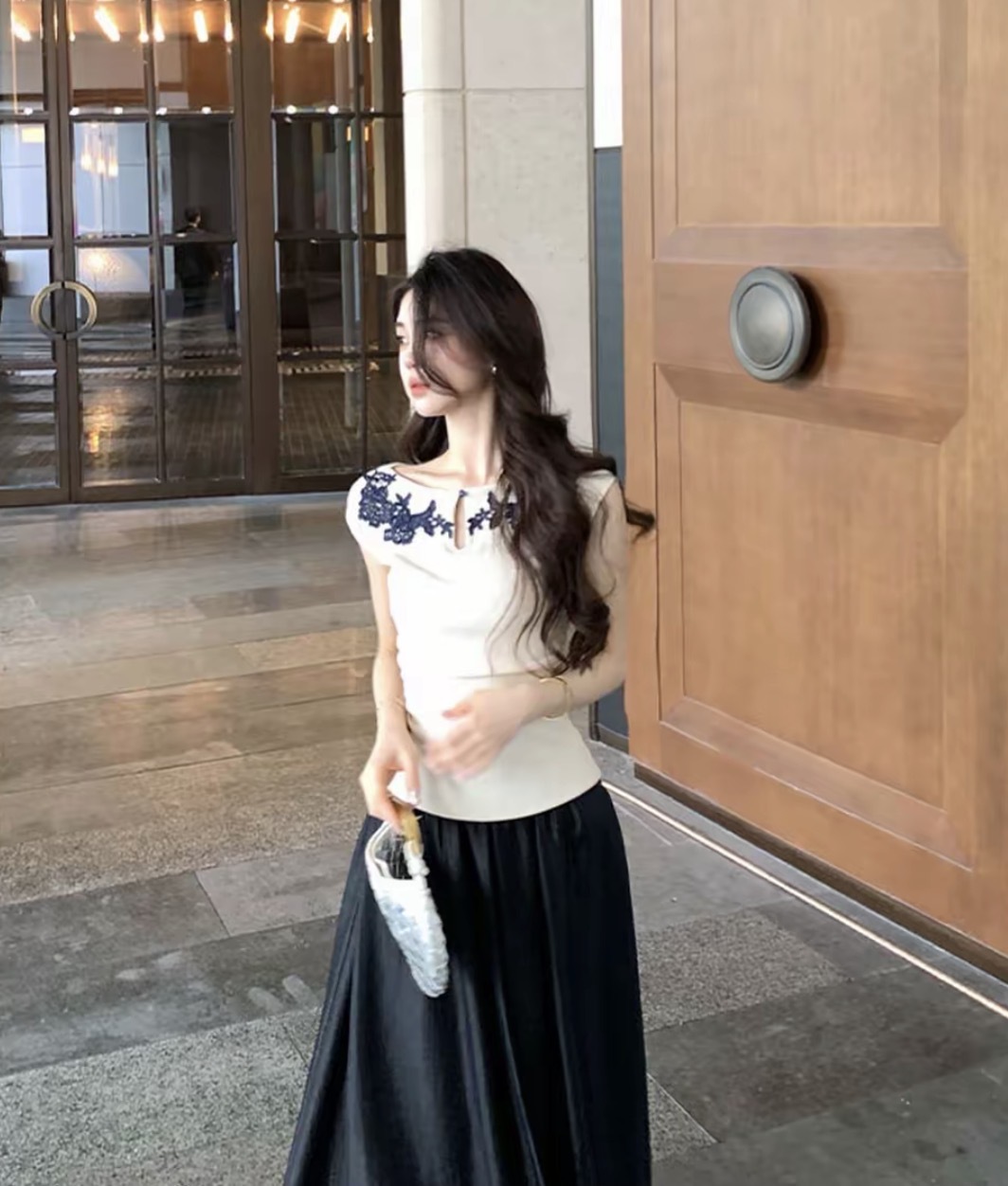 【气质高雅】气质刺绣花边上衣缎面半裙套装