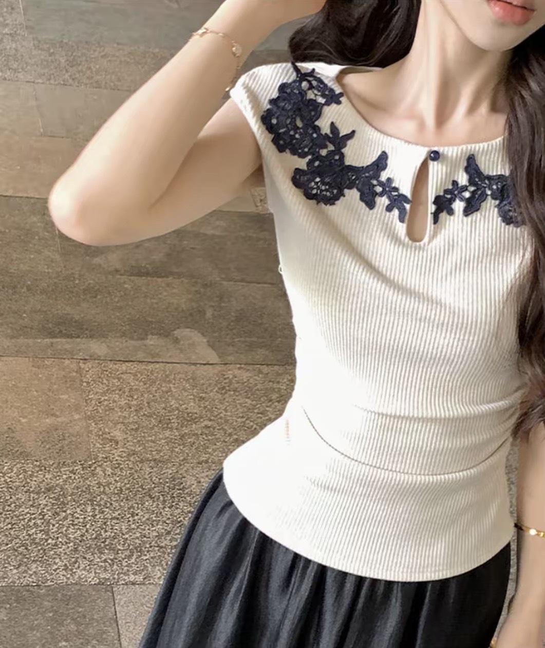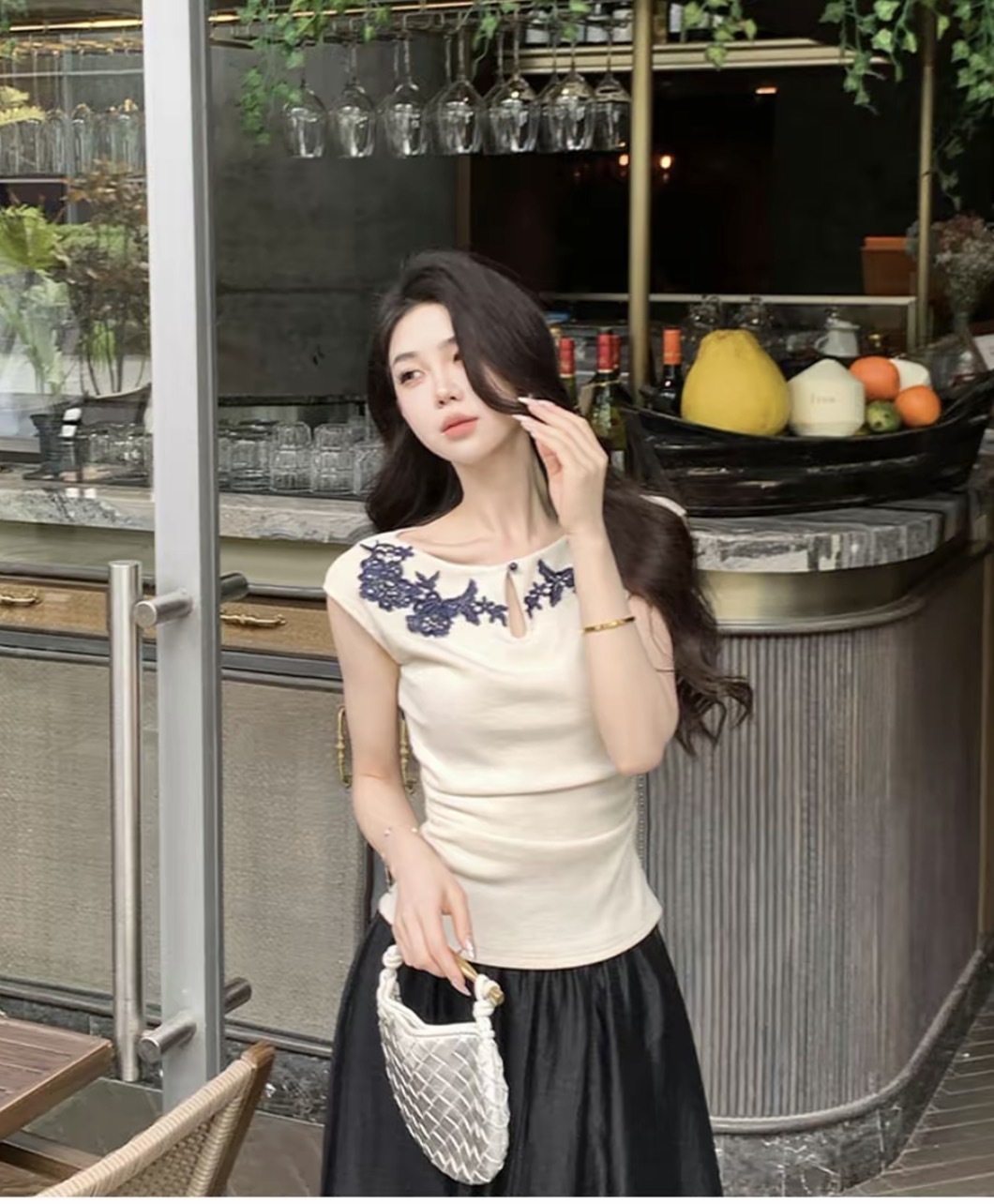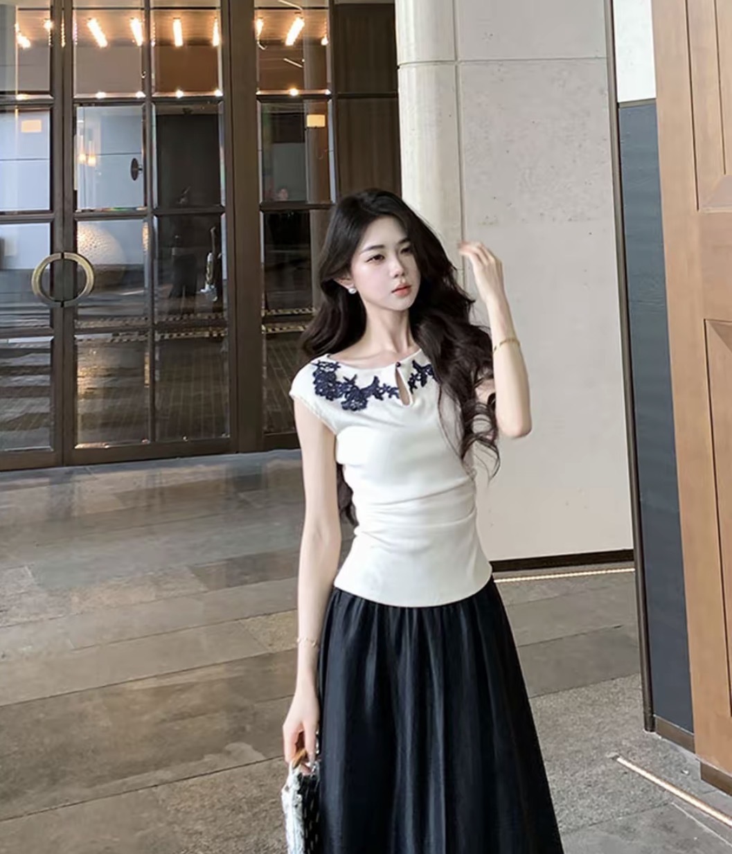 【气质高雅】气质刺绣花边上衣缎面半裙套装