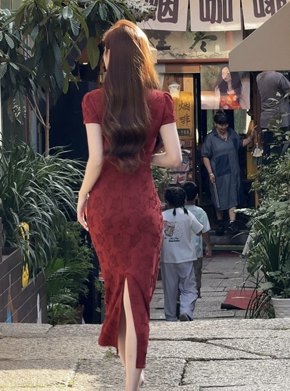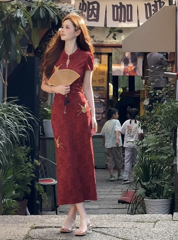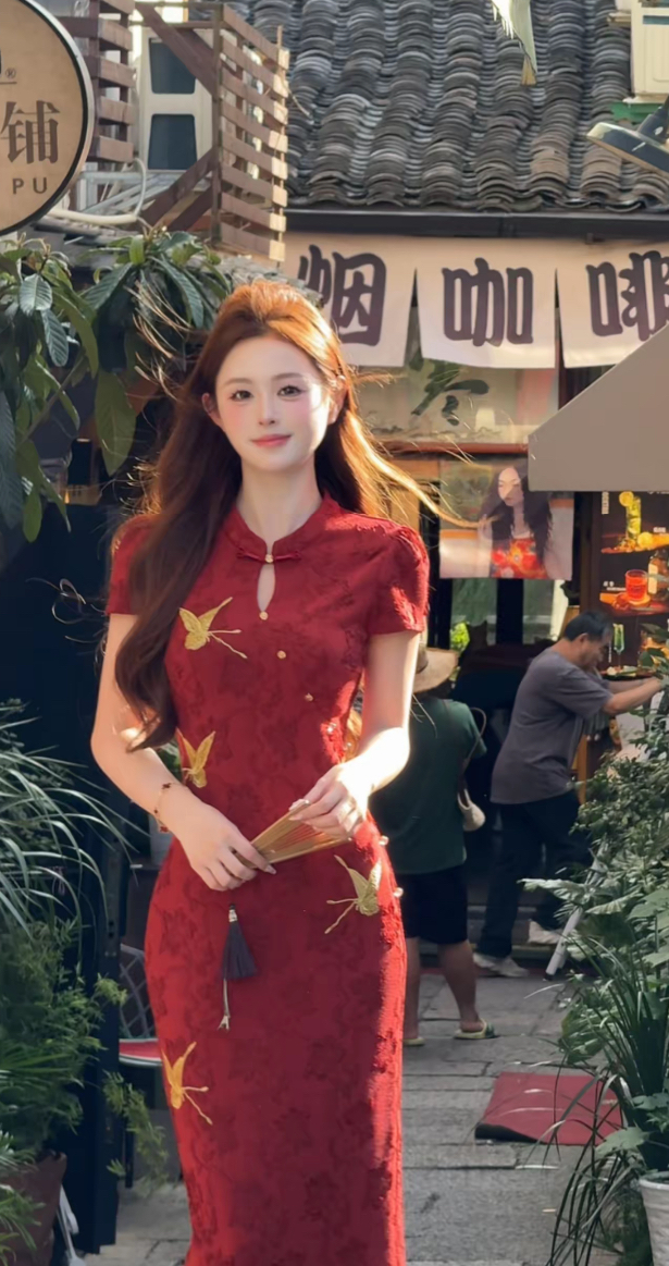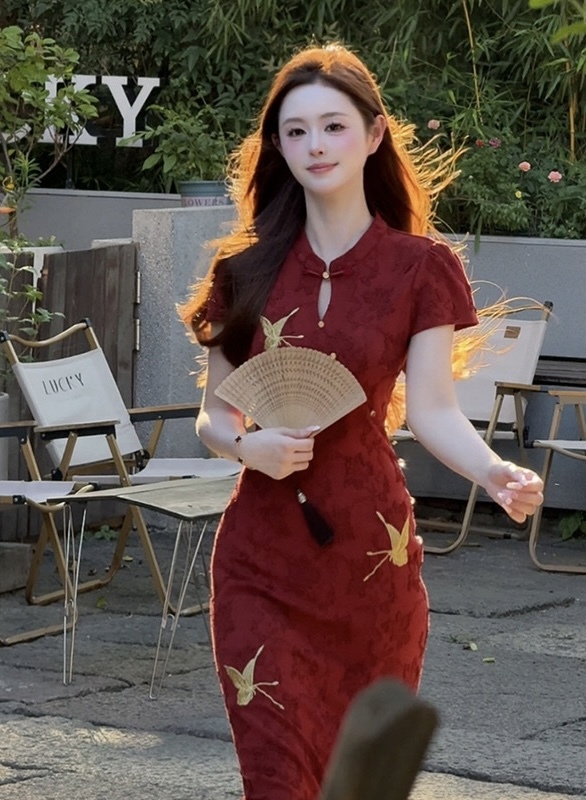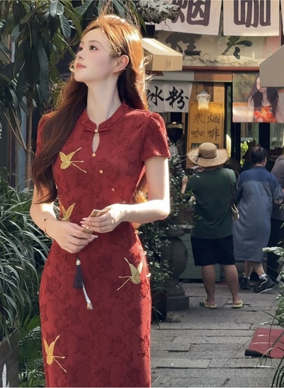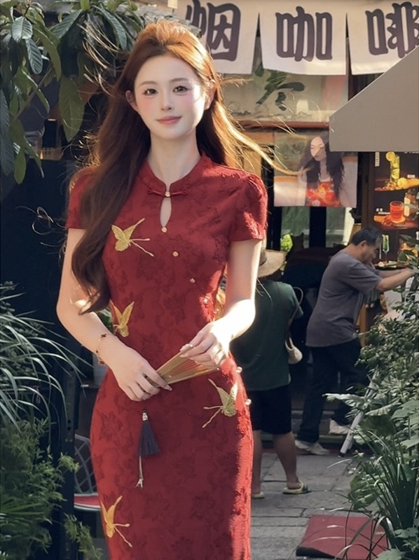 【振翅】新中式水滴领蝴蝶刺绣提花旗袍连衣裙
