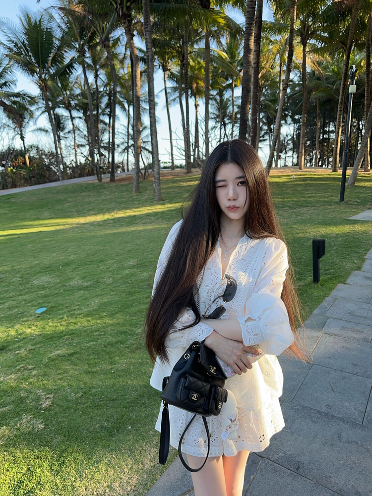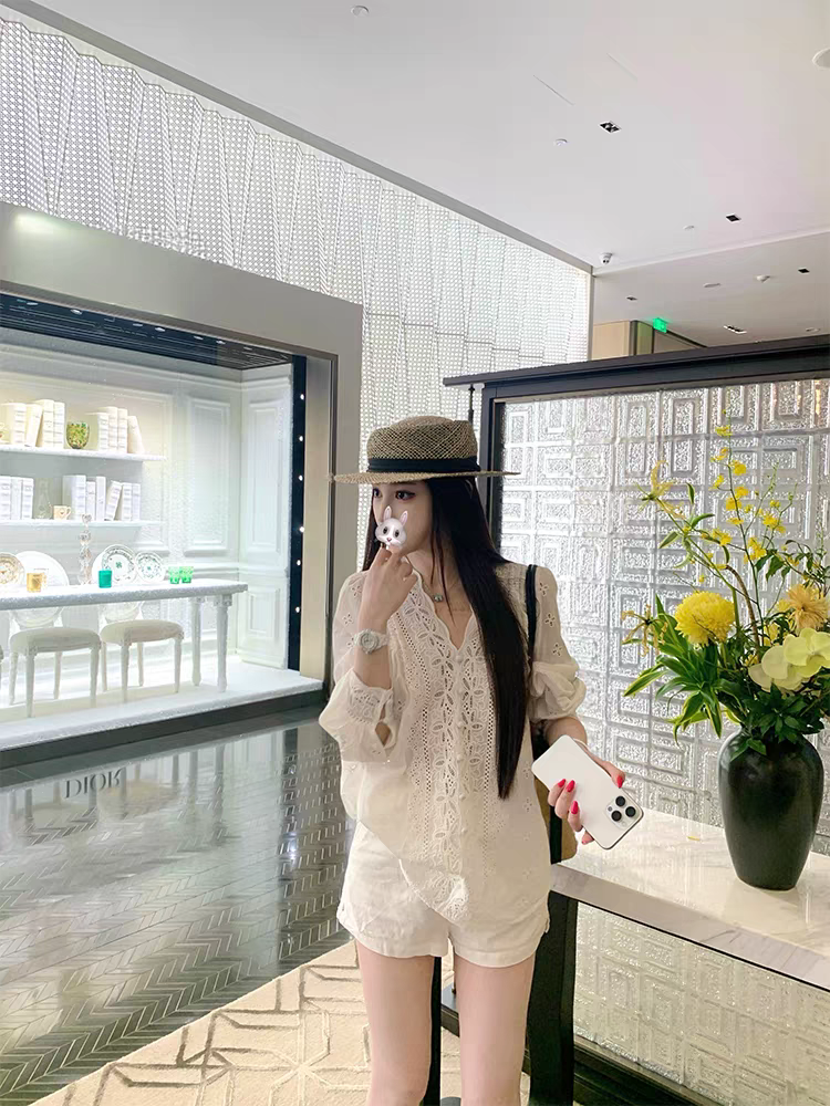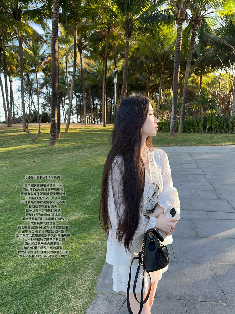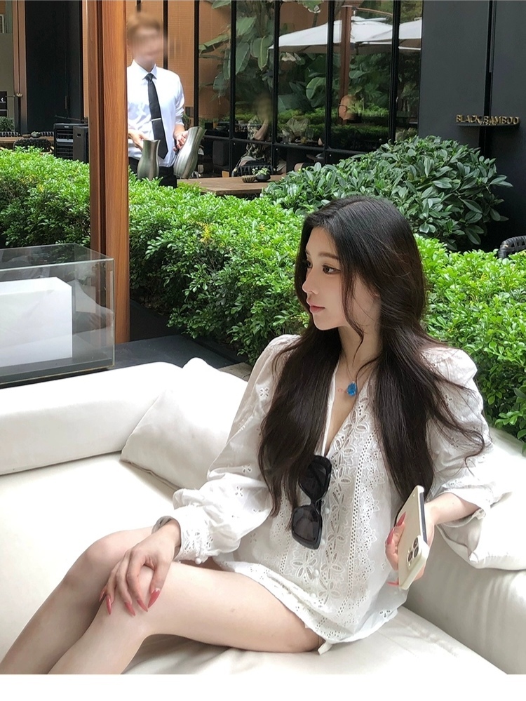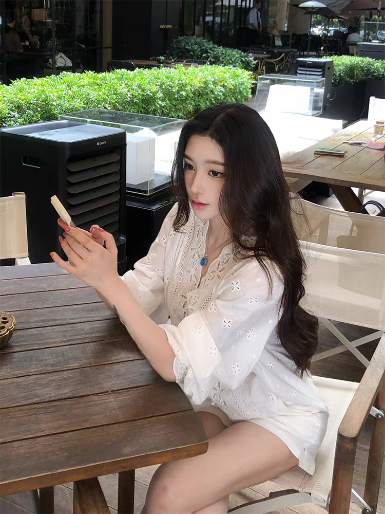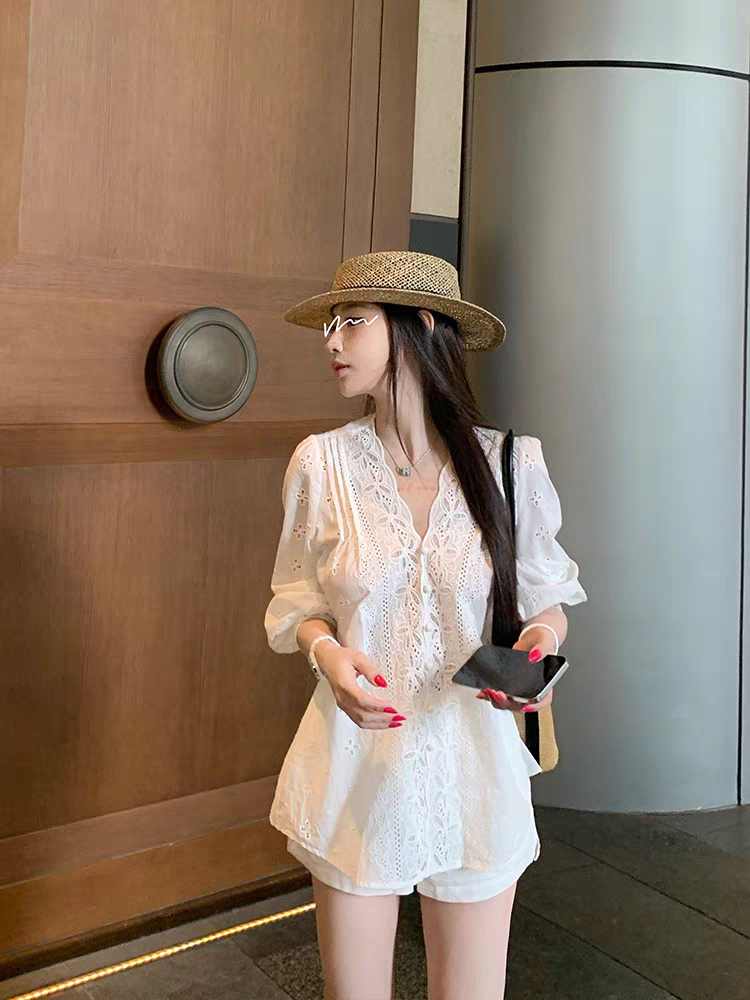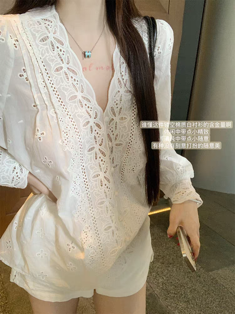 【浪漫假期】 法式蕾丝白色V领雪纺衬衫