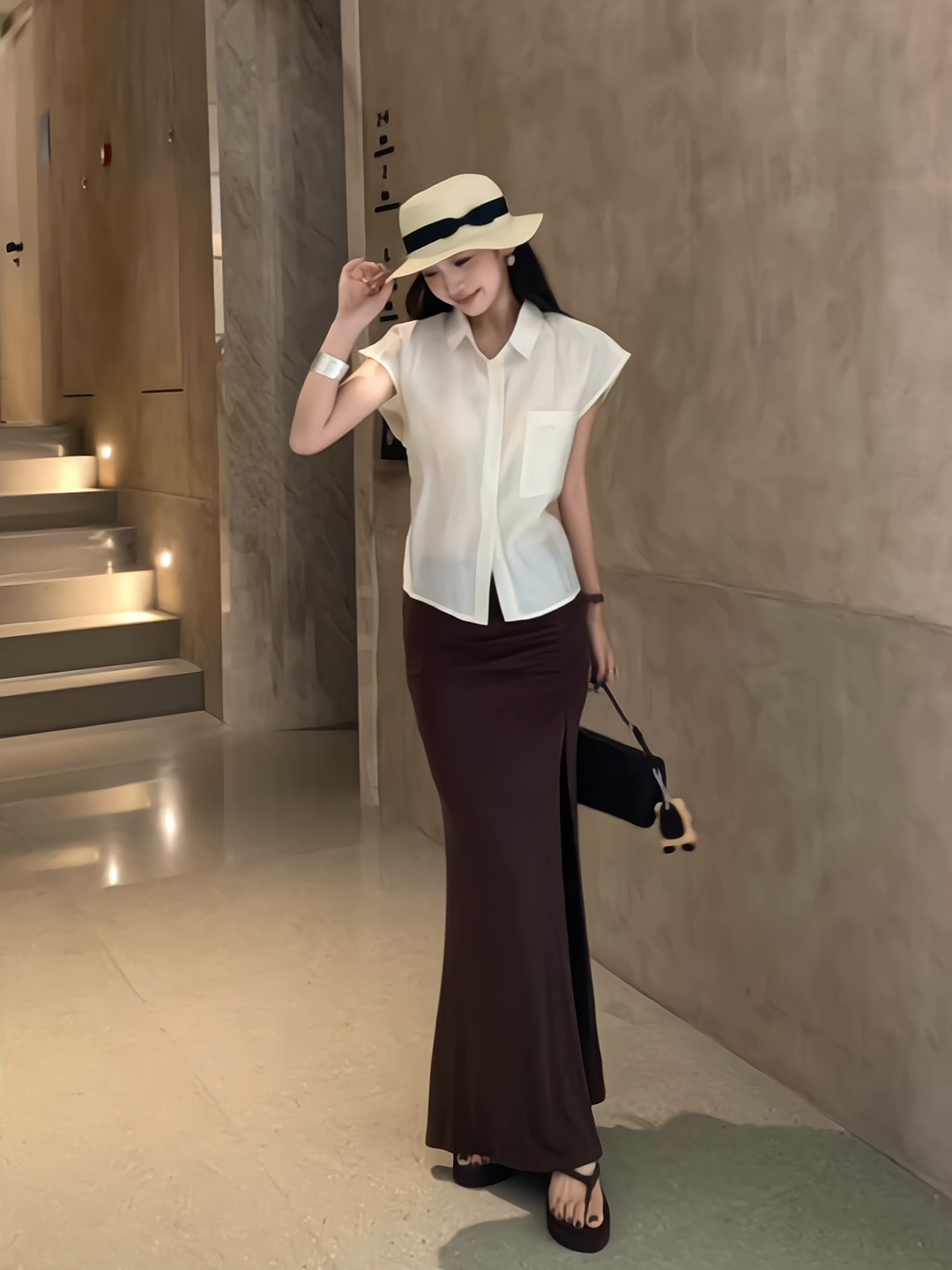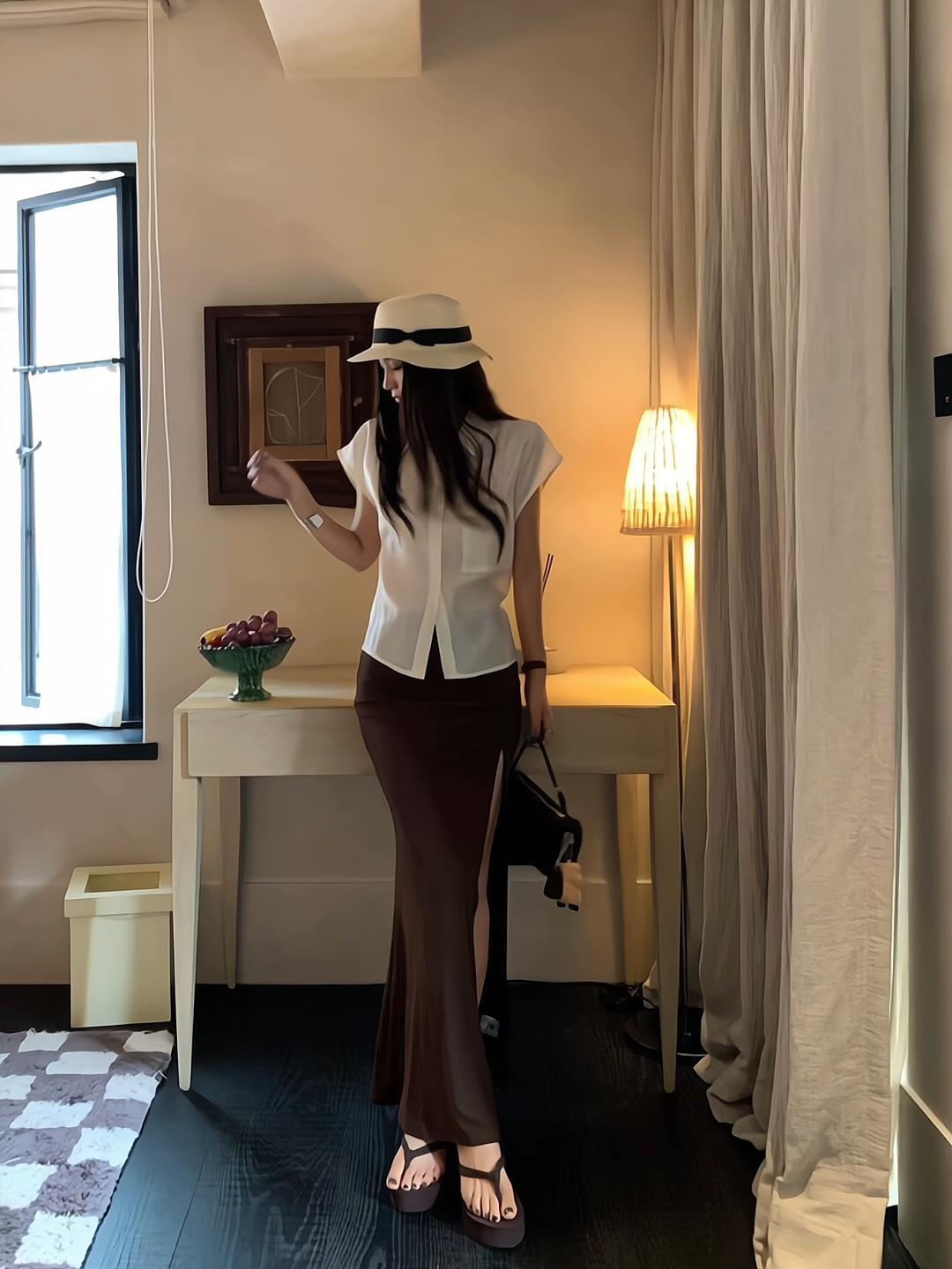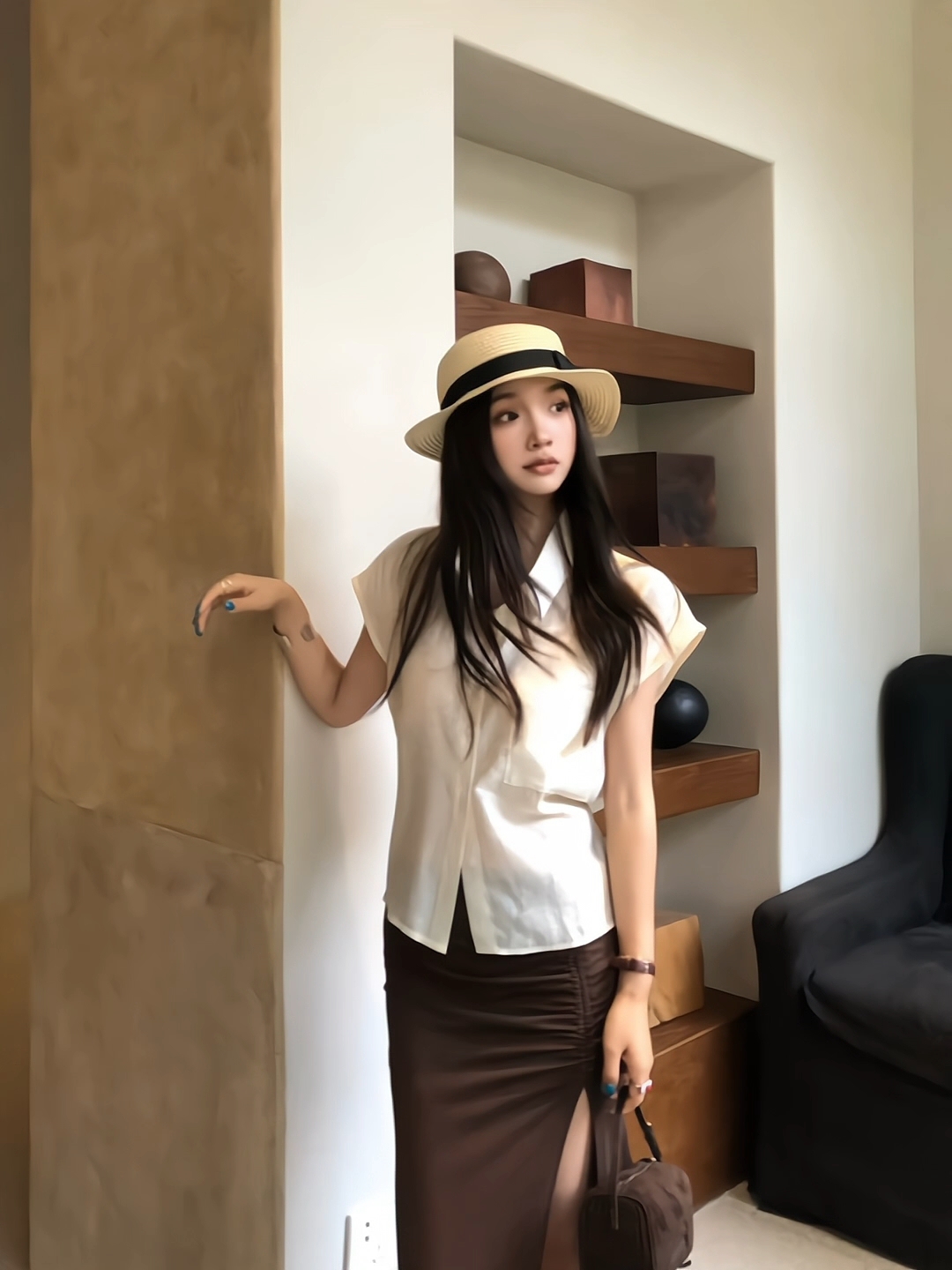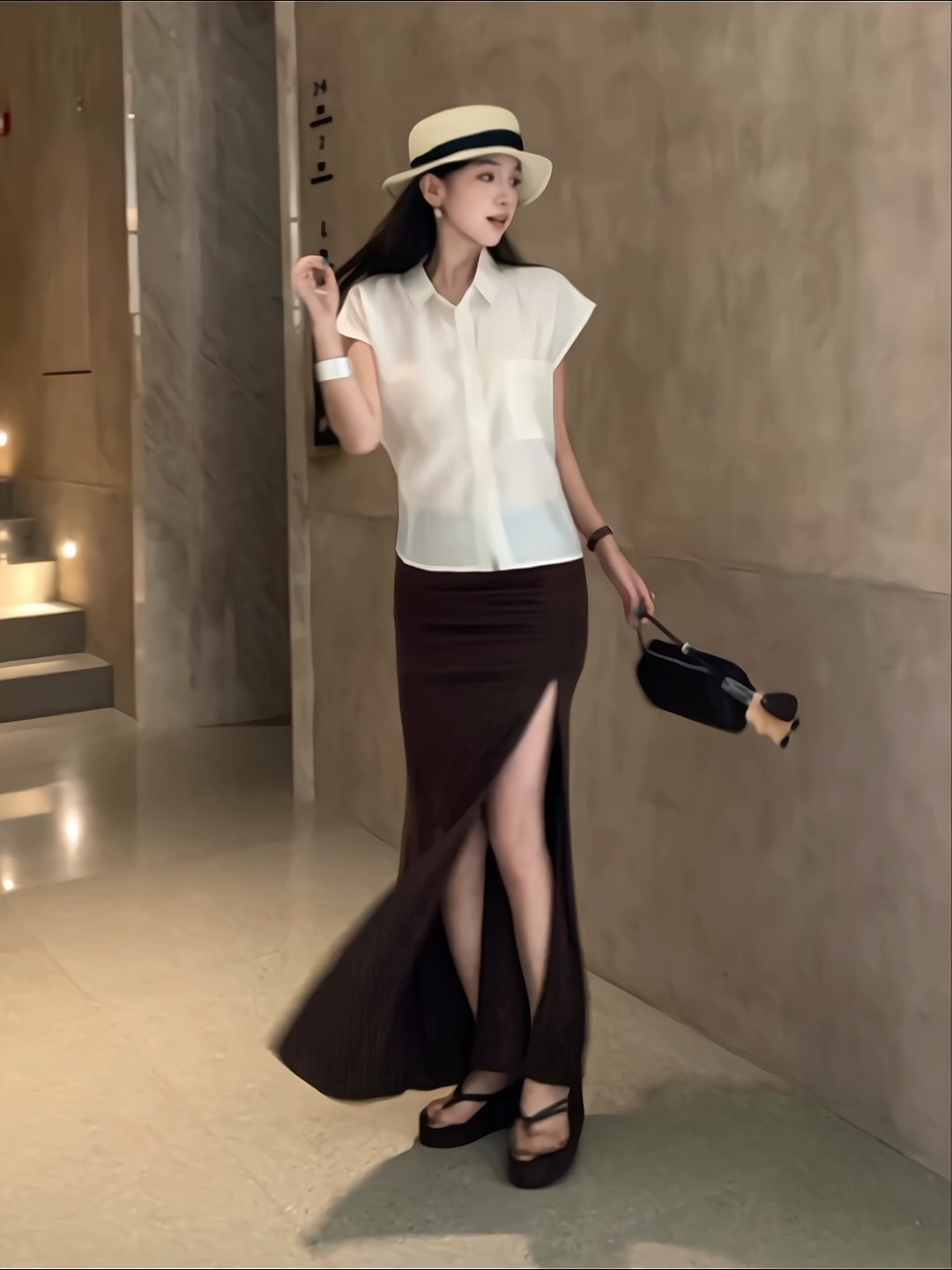 【落叶午茶】 复古韩系短袖衬衫+褶皱半身裙