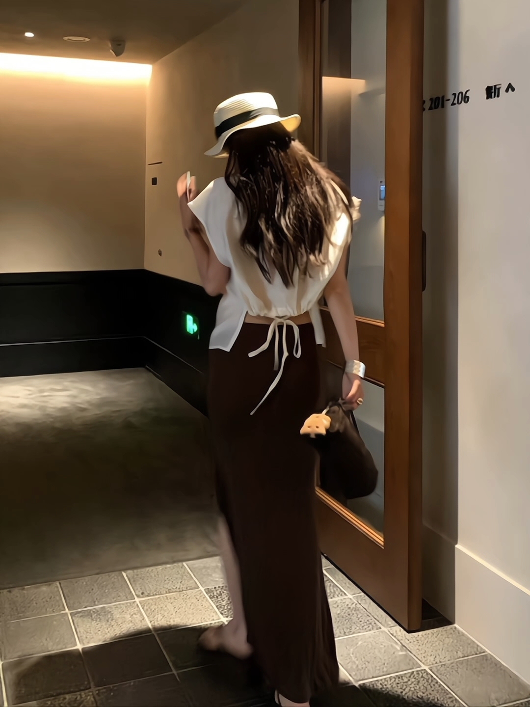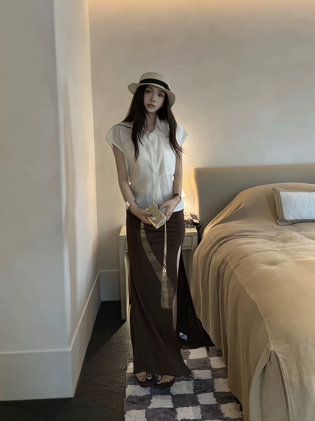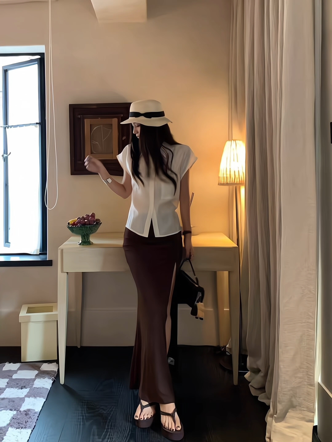 【落叶午茶】 复古韩系短袖衬衫+褶皱半身裙