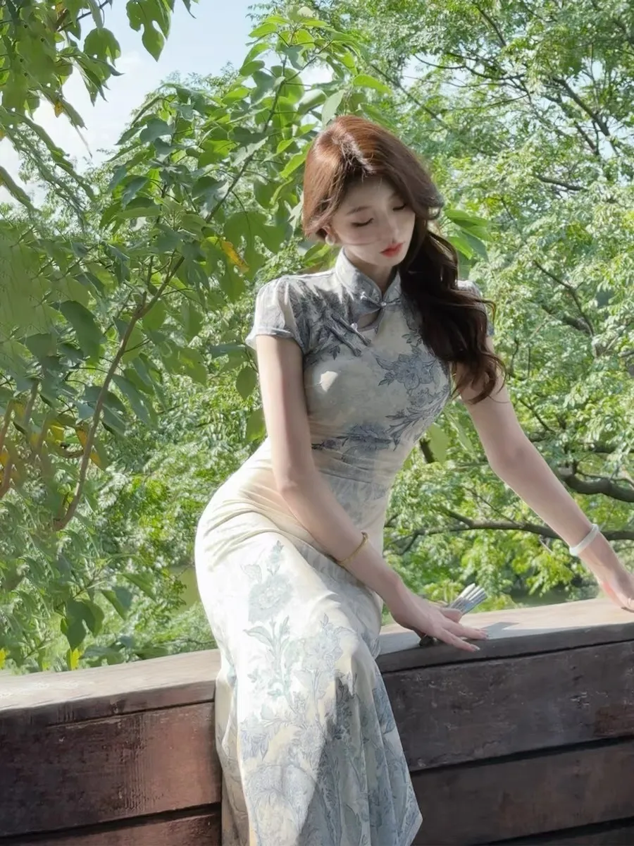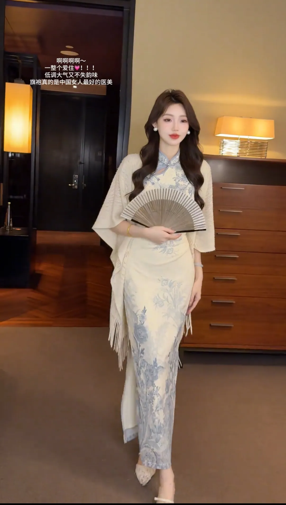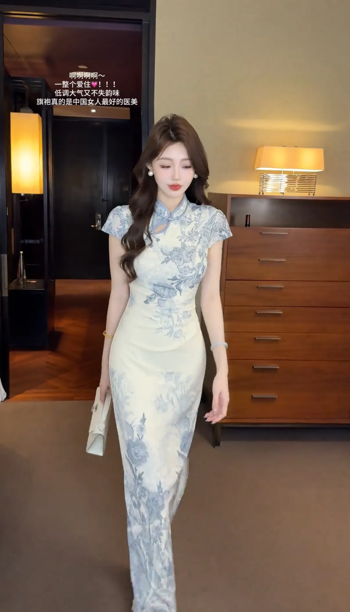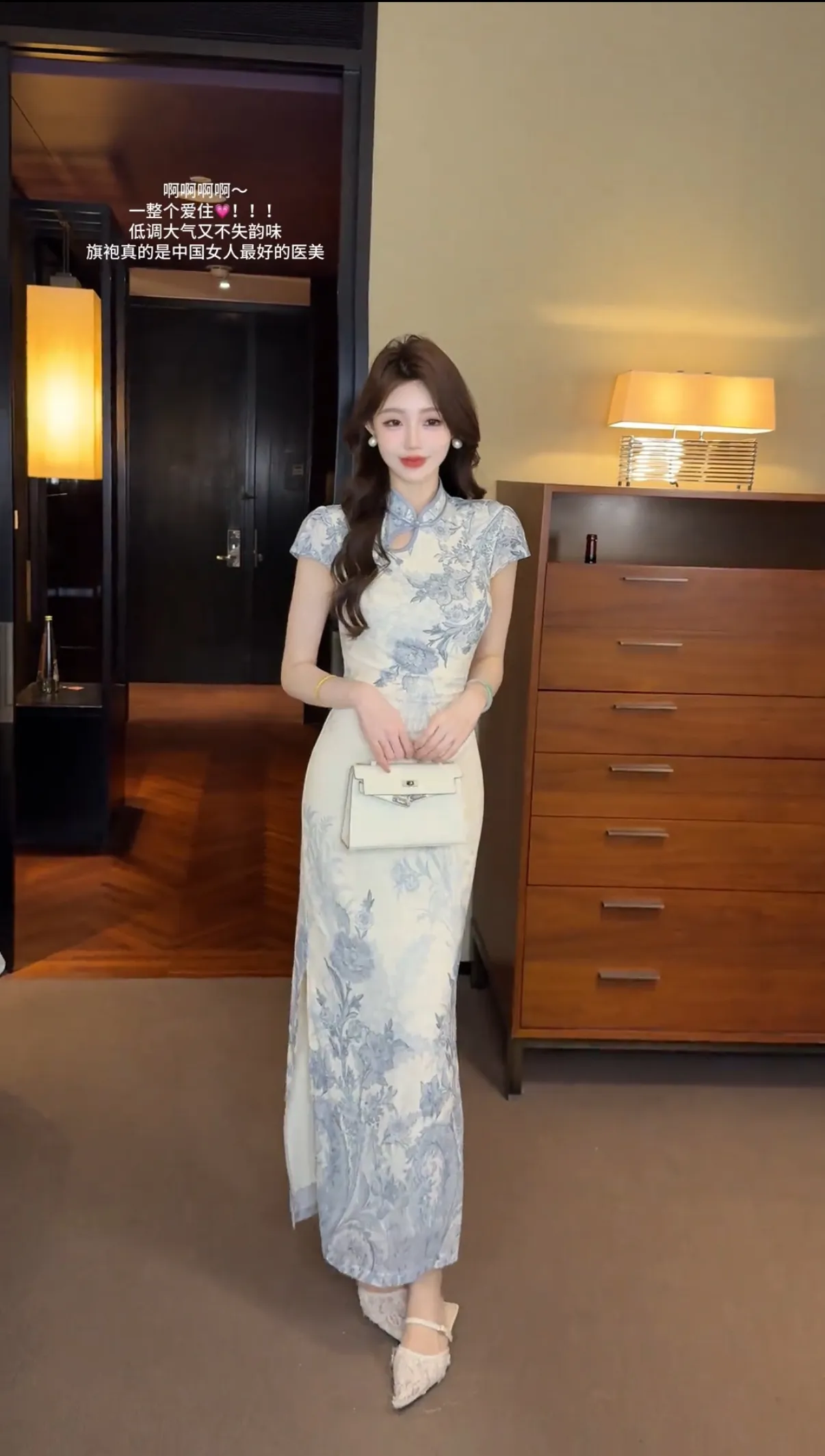 【青花瓷】杏印花裙温婉优雅收腰旗袍连衣裙