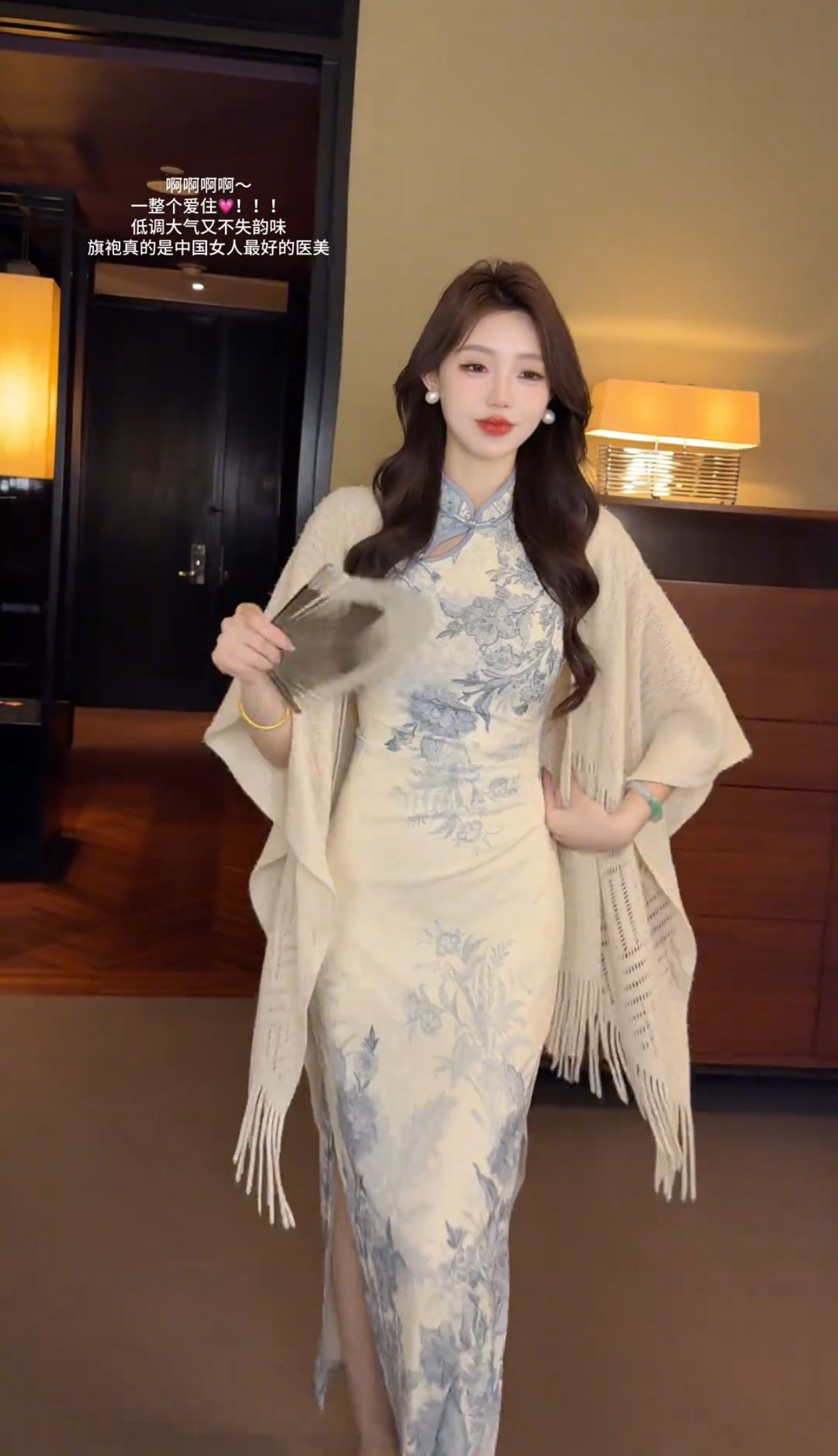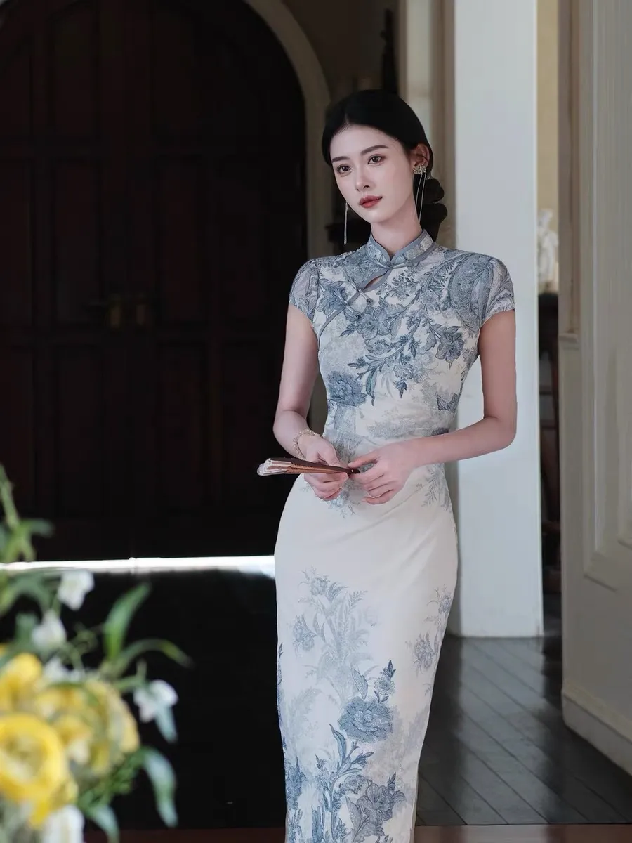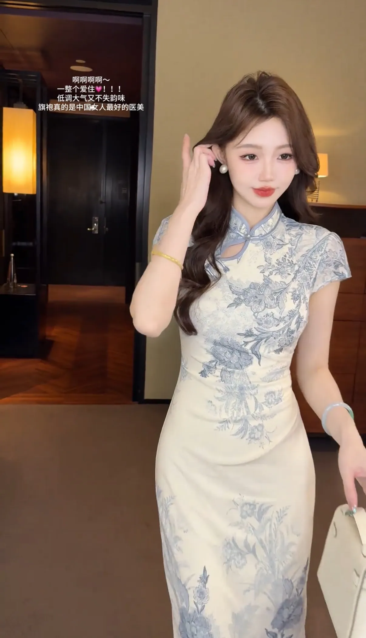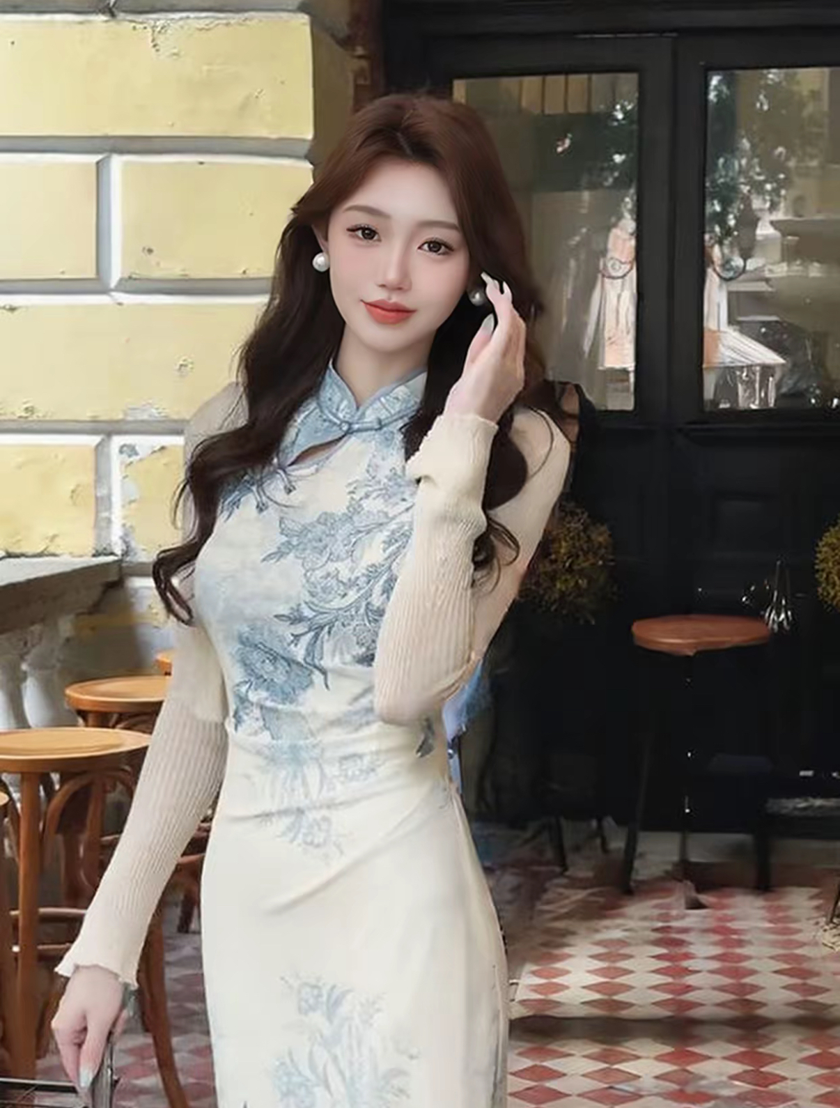 【青花瓷】杏印花裙温婉优雅收腰旗袍连衣裙