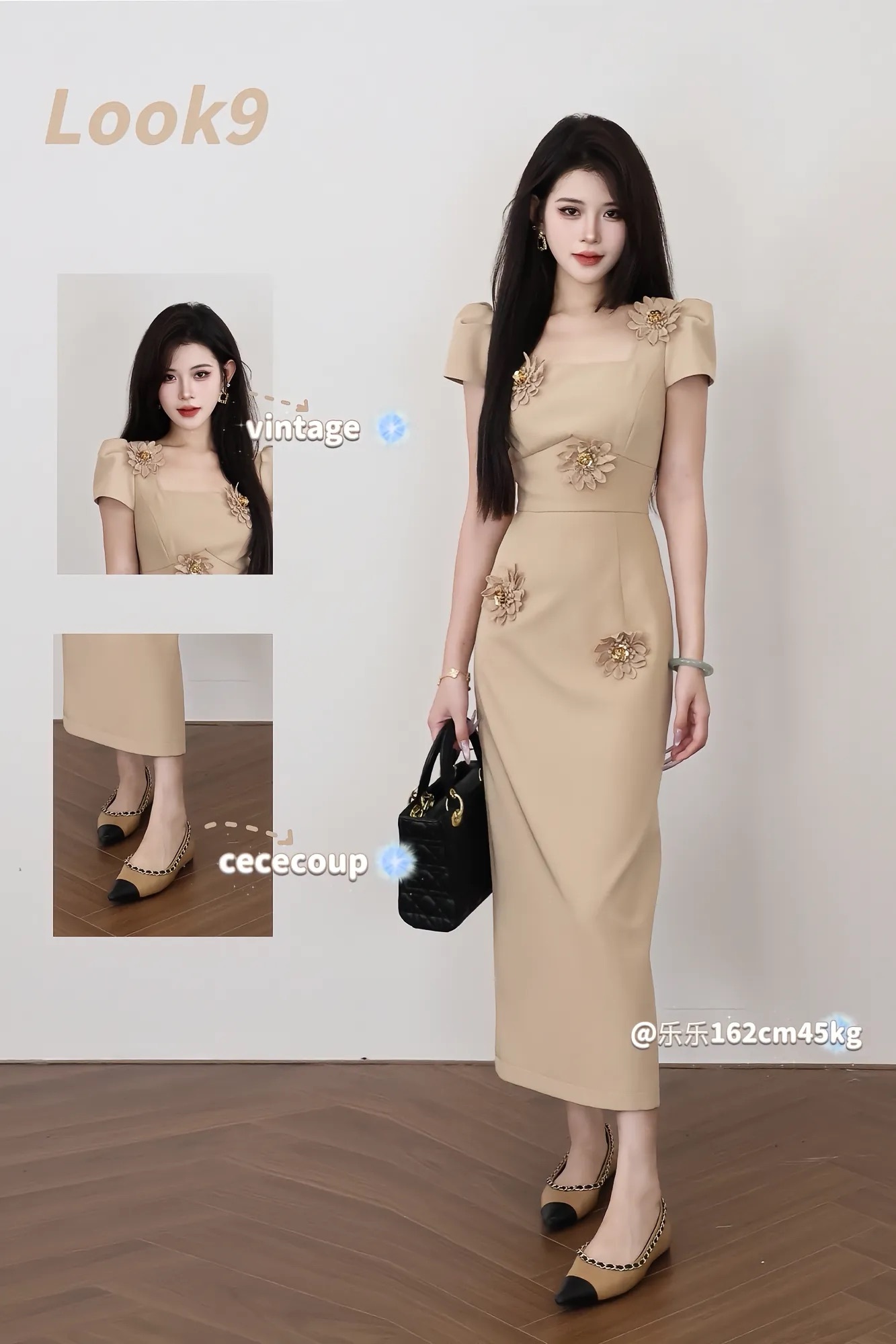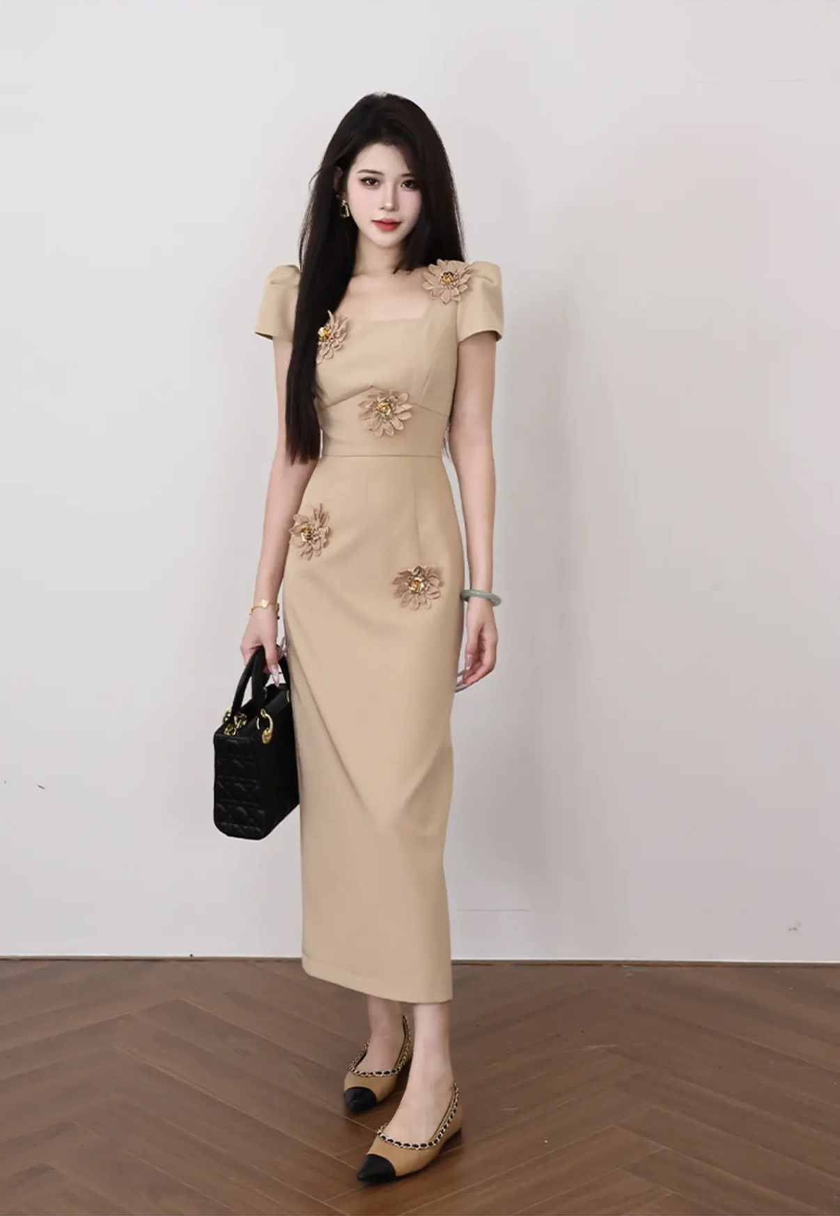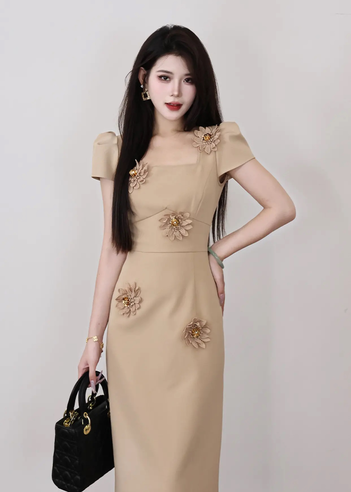 【昭和曼丽】法式杏色钉珠花朵设计连衣裙