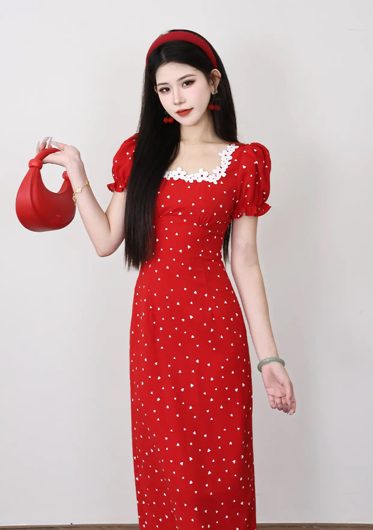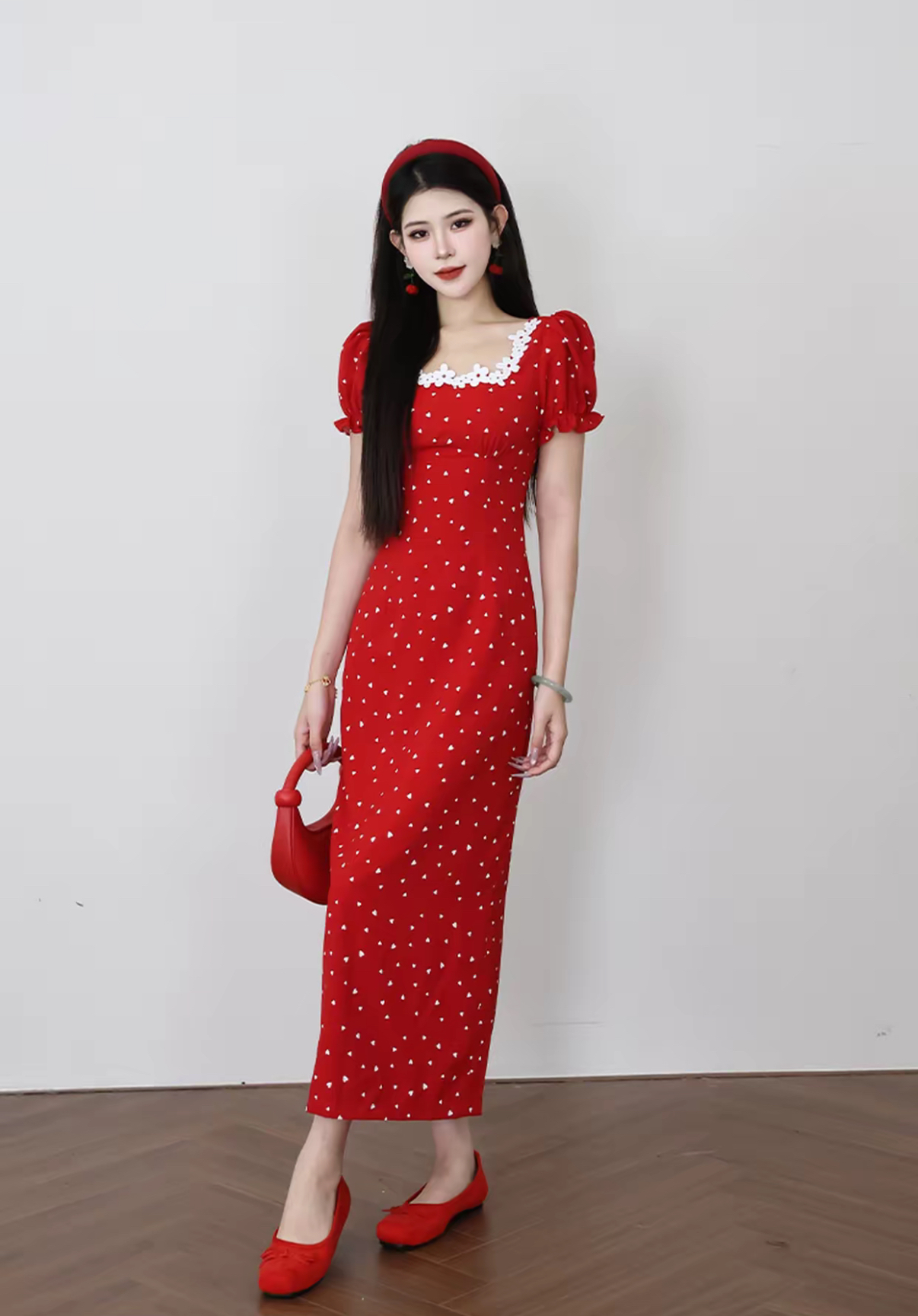 【波点花语】复古红色甜美波点拼花边长款连衣裙