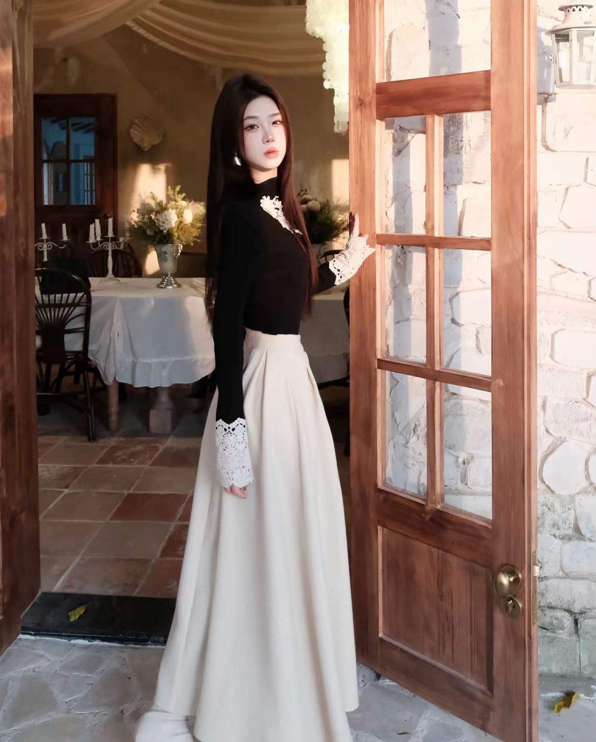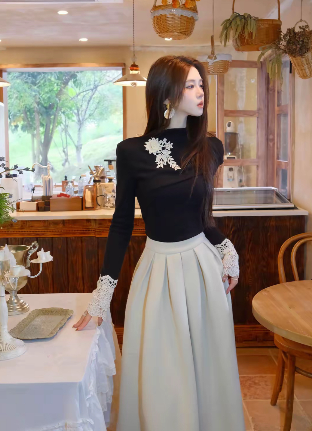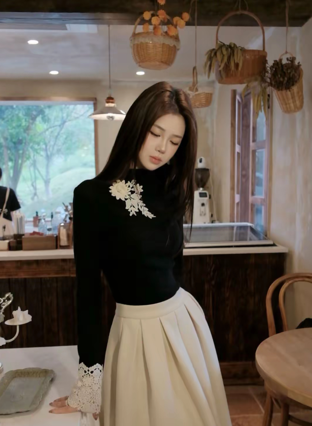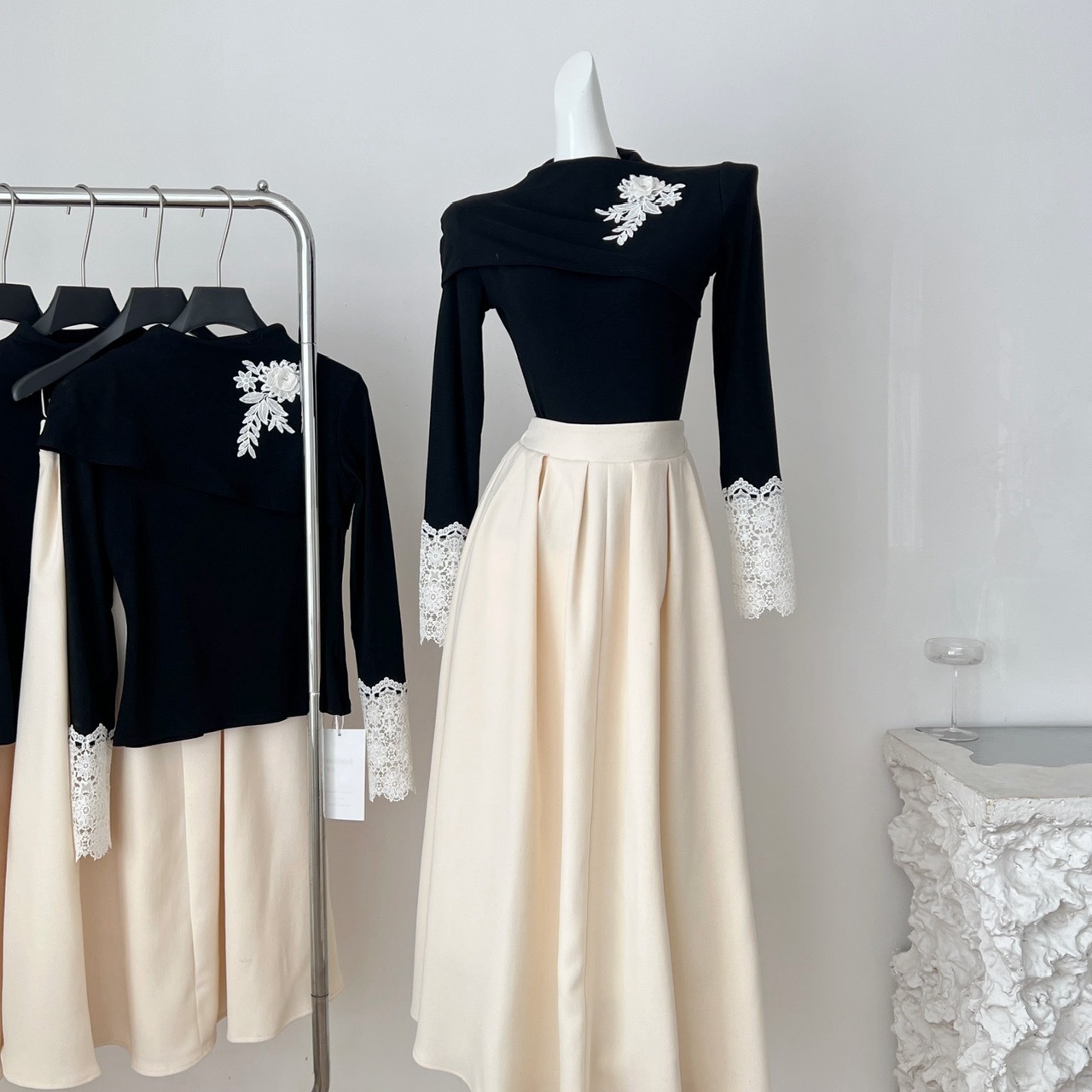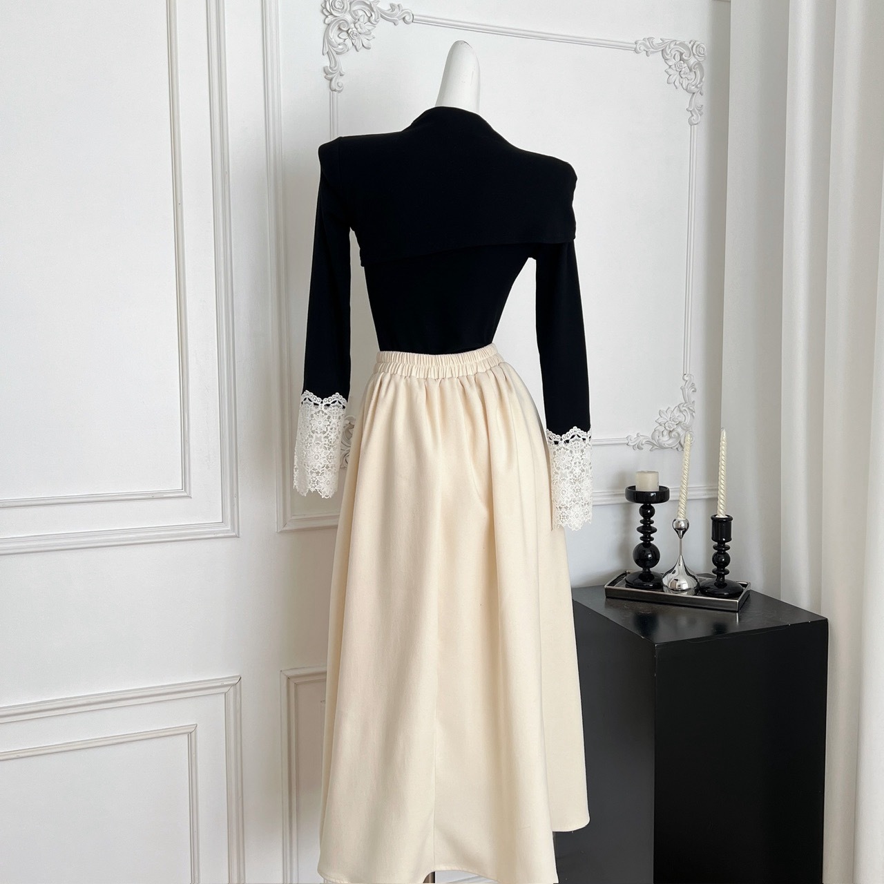 【星夜繁花】蕾丝拼接长袖高领针织衫上衣+半身裙