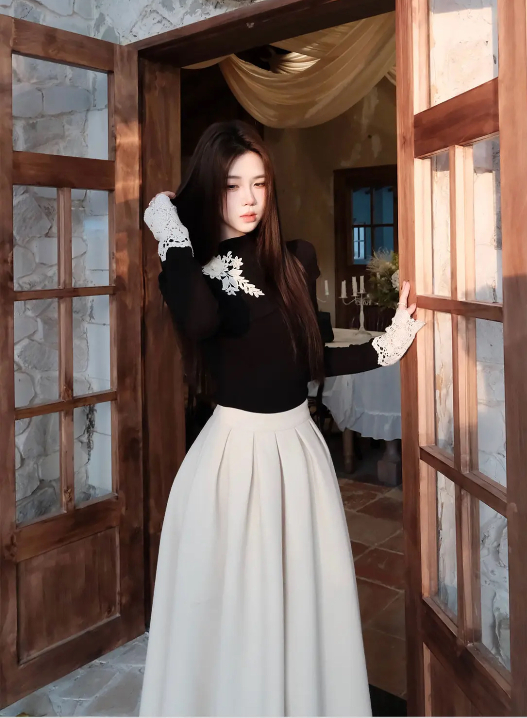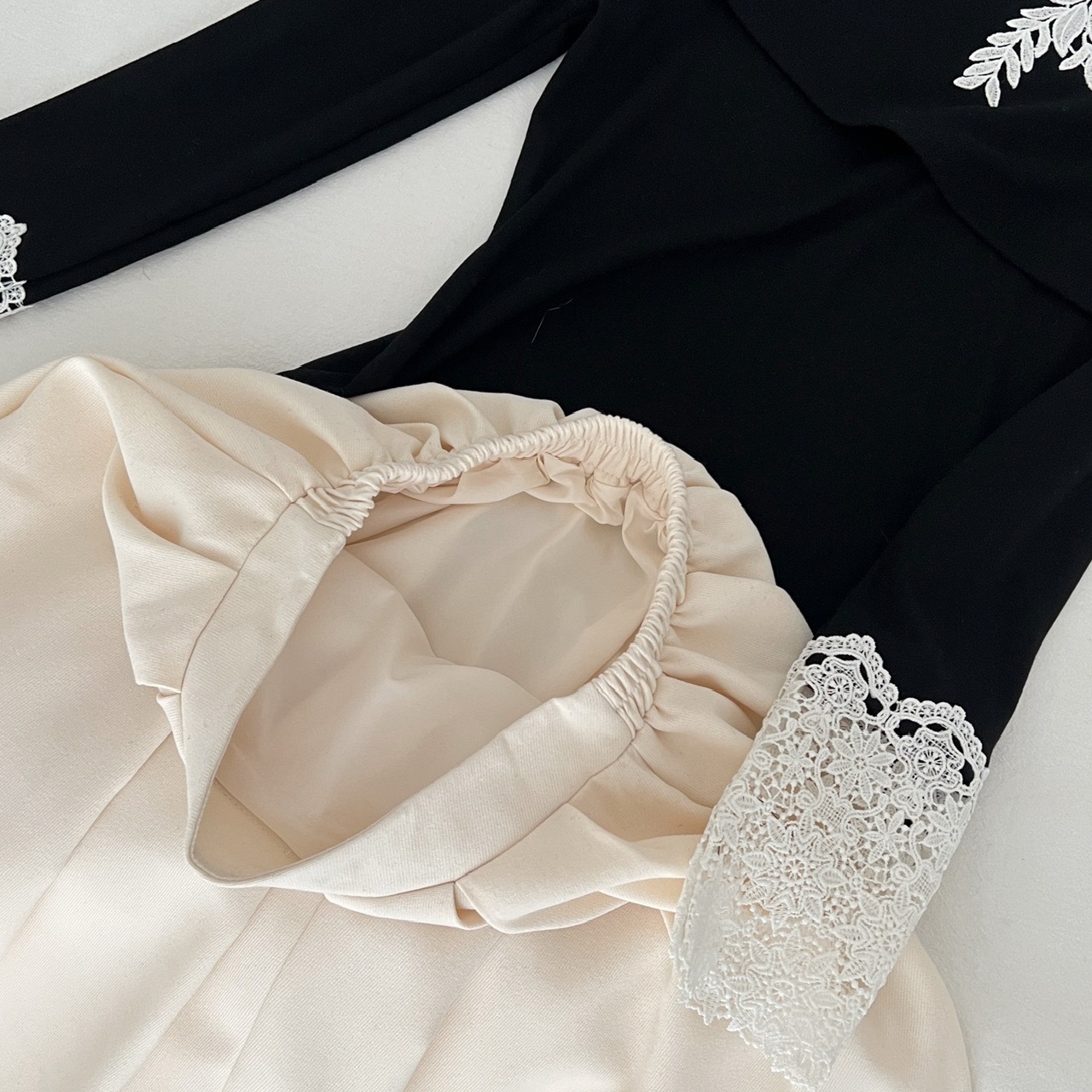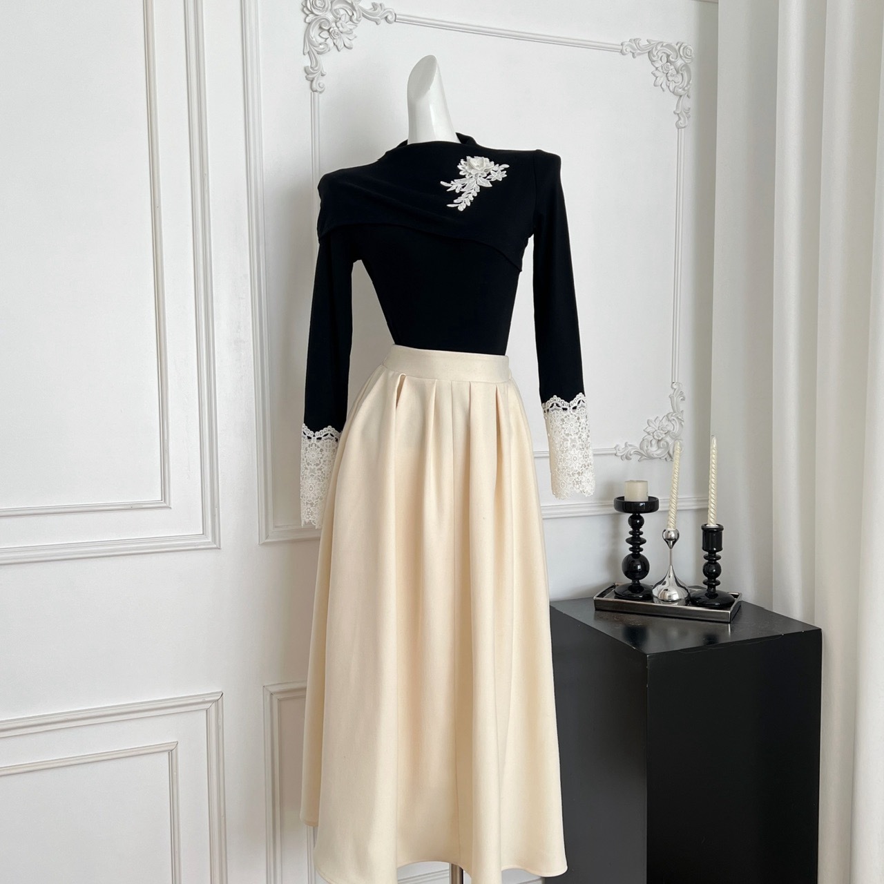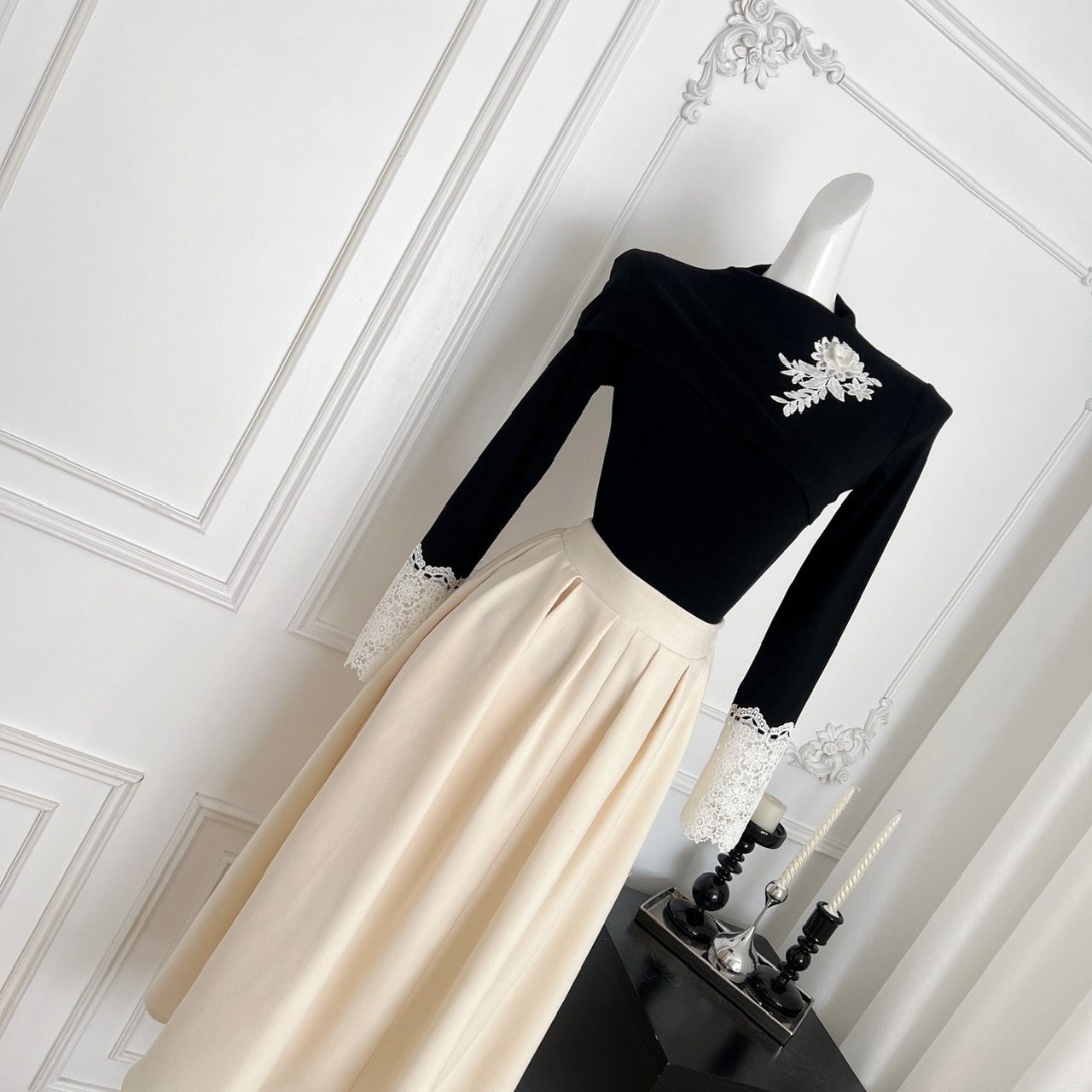 【星夜繁花】蕾丝拼接长袖高领针织衫上衣+半身裙