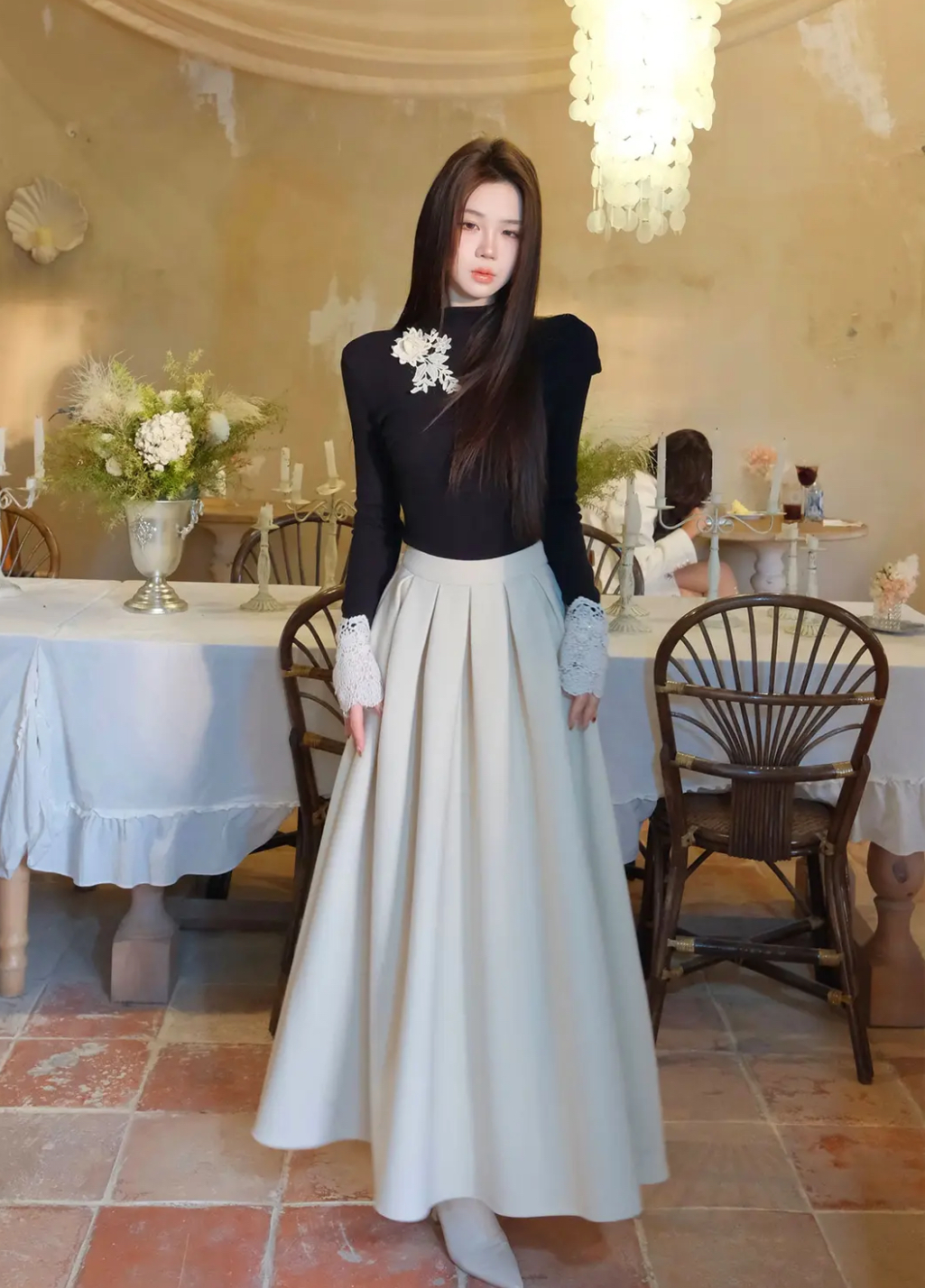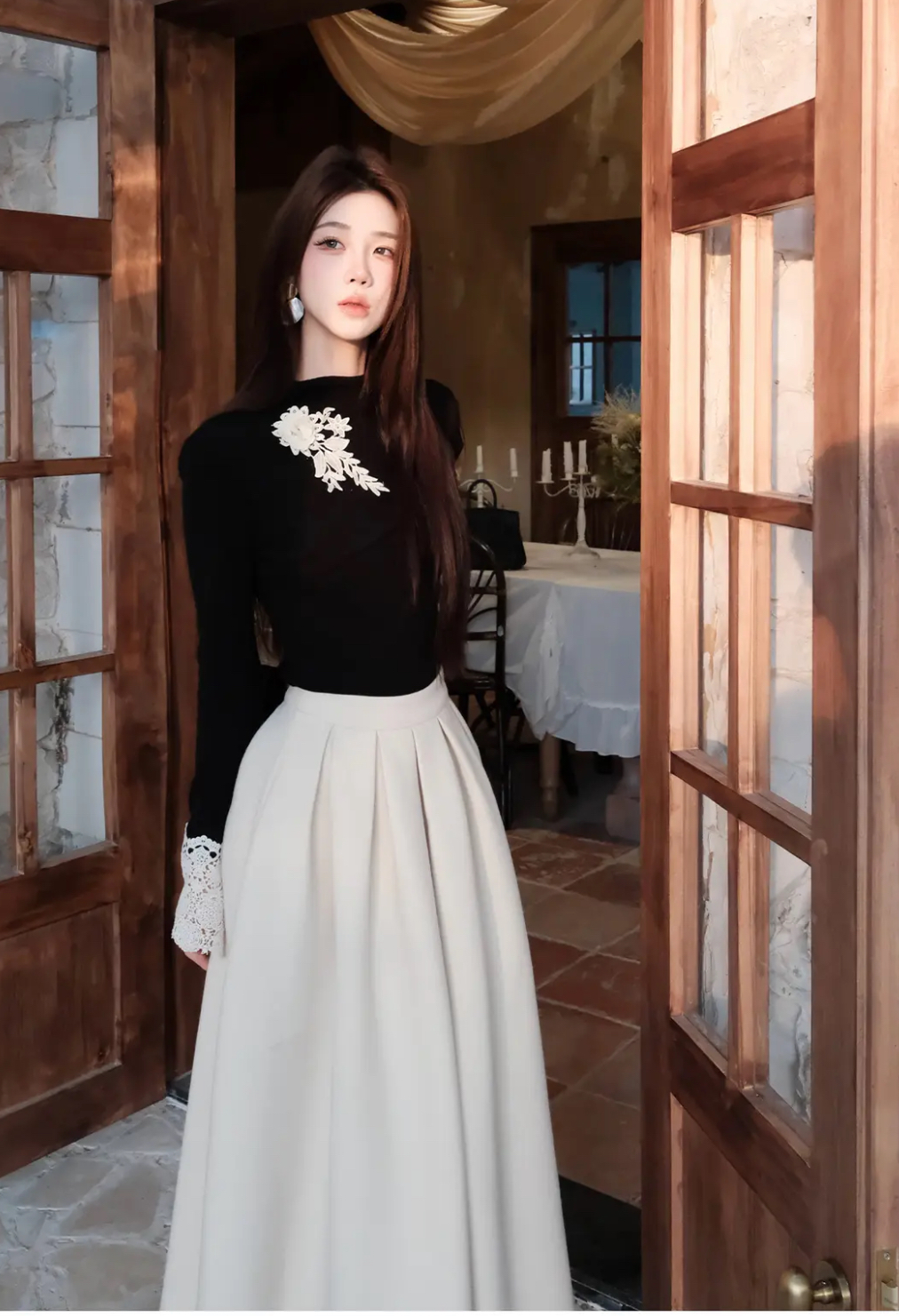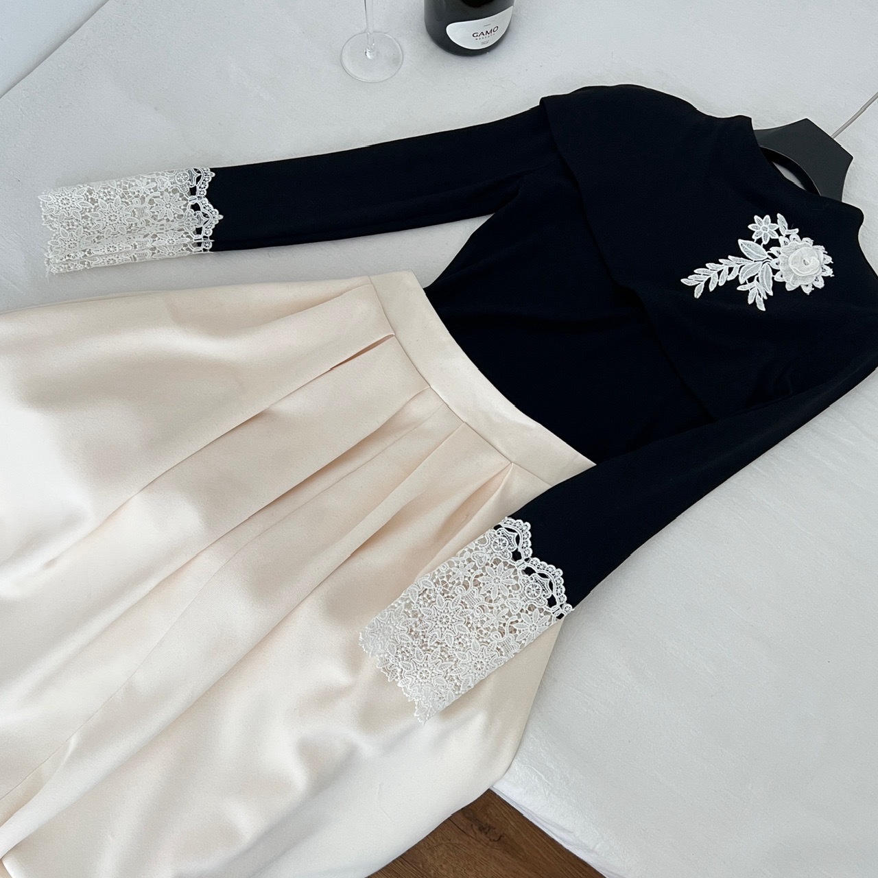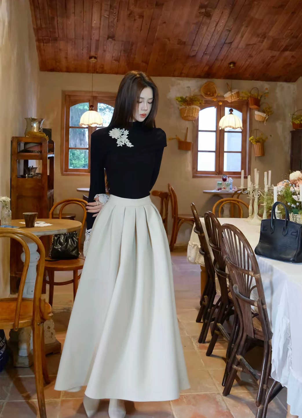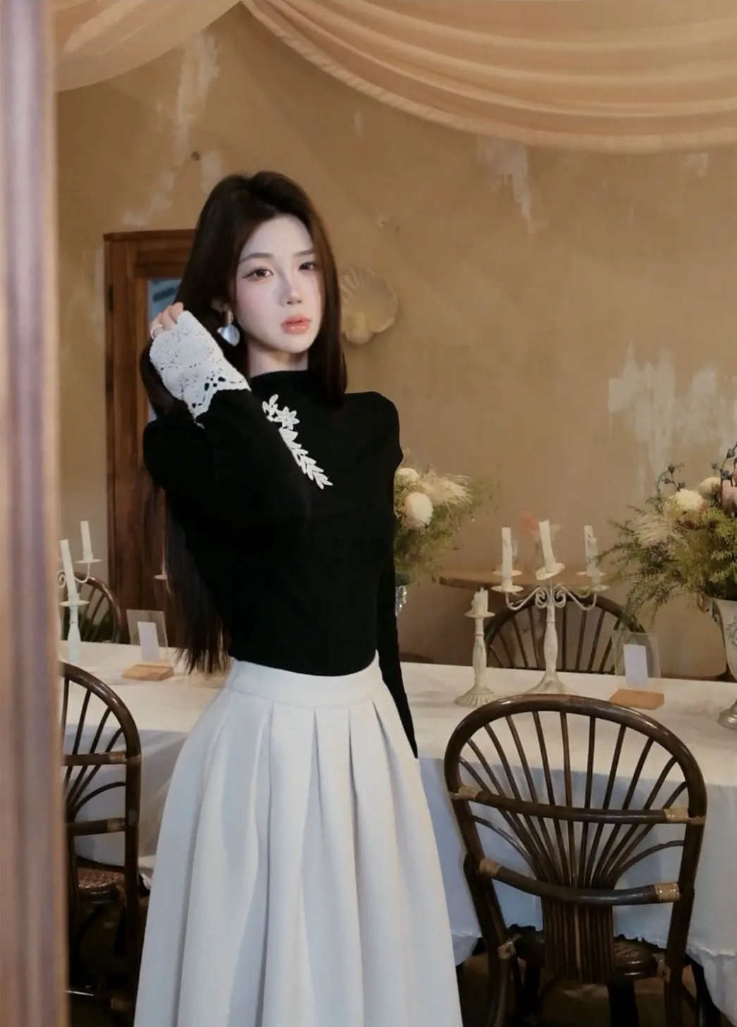【星夜繁花】蕾丝拼接长袖高领针织衫上衣+半身裙