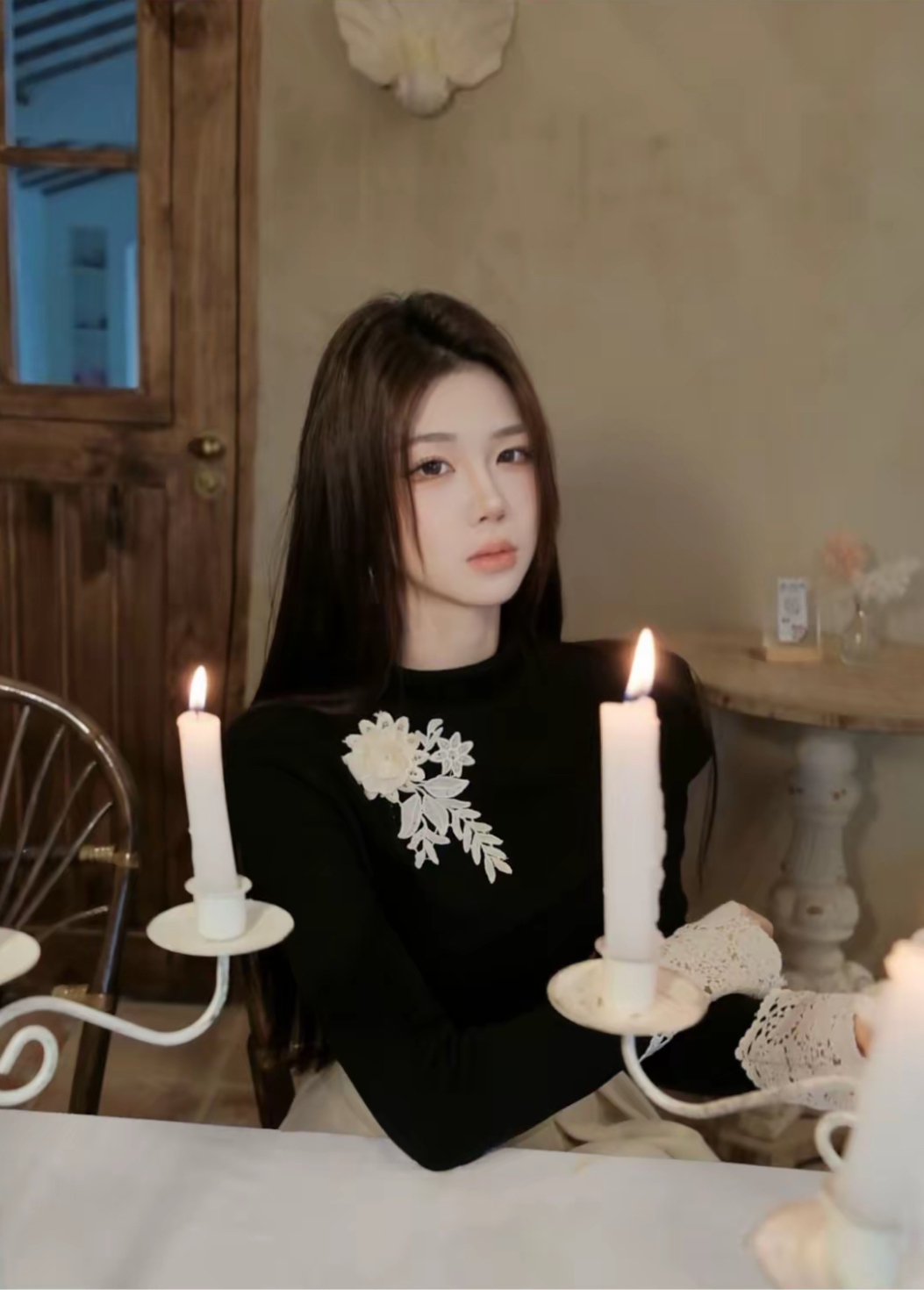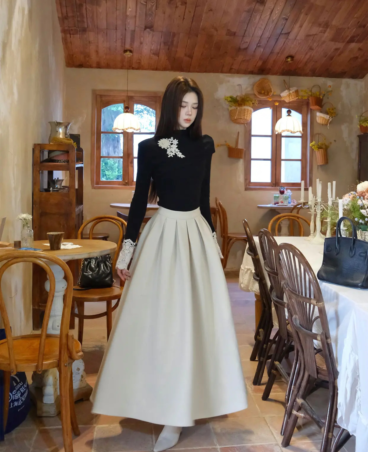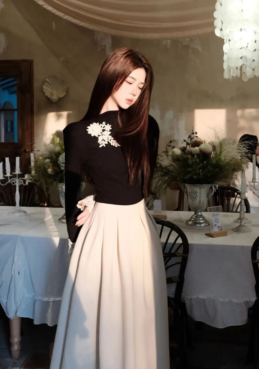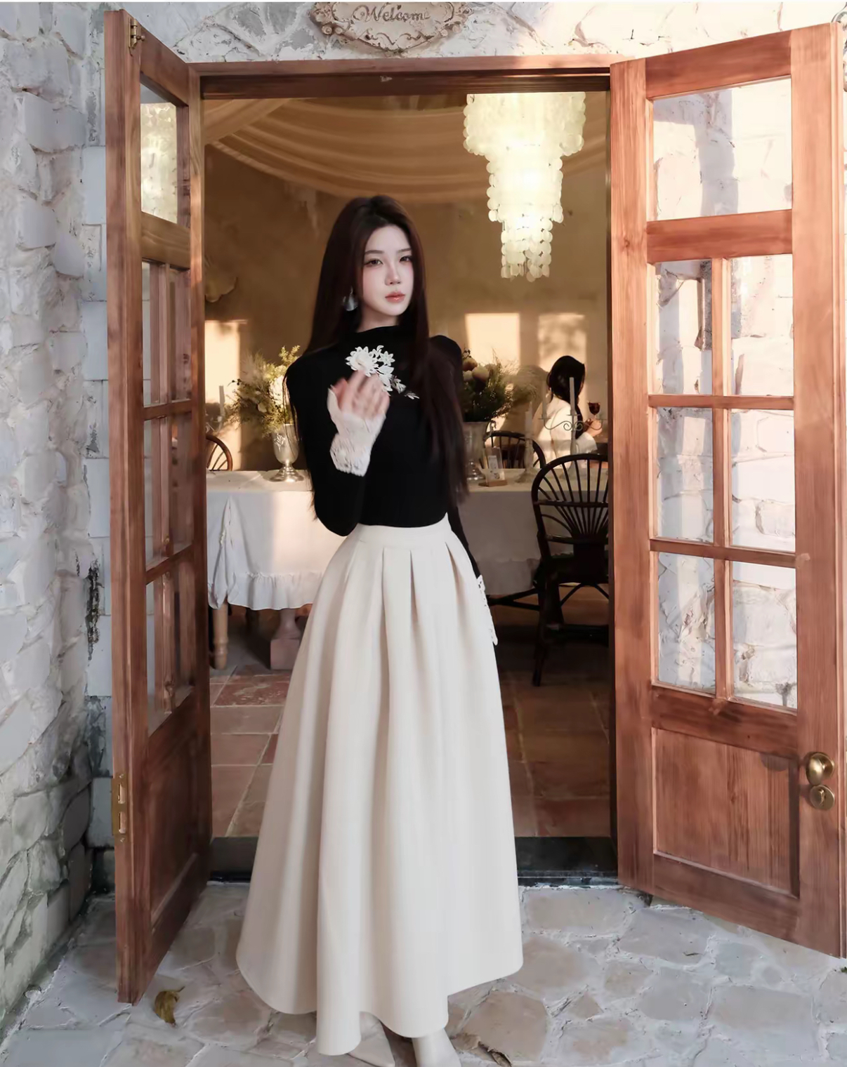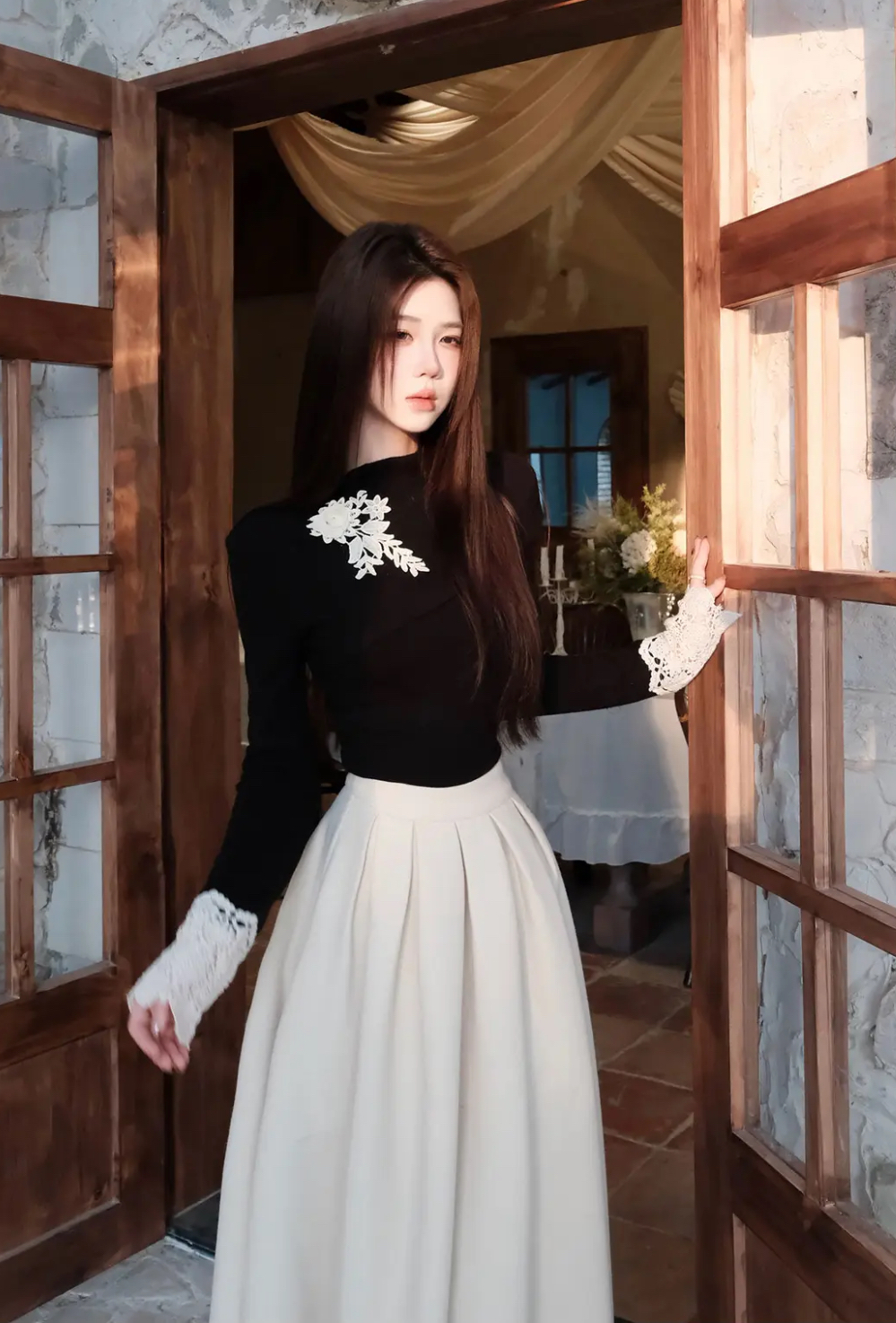 【星夜繁花】蕾丝拼接长袖高领针织衫上衣+半身裙