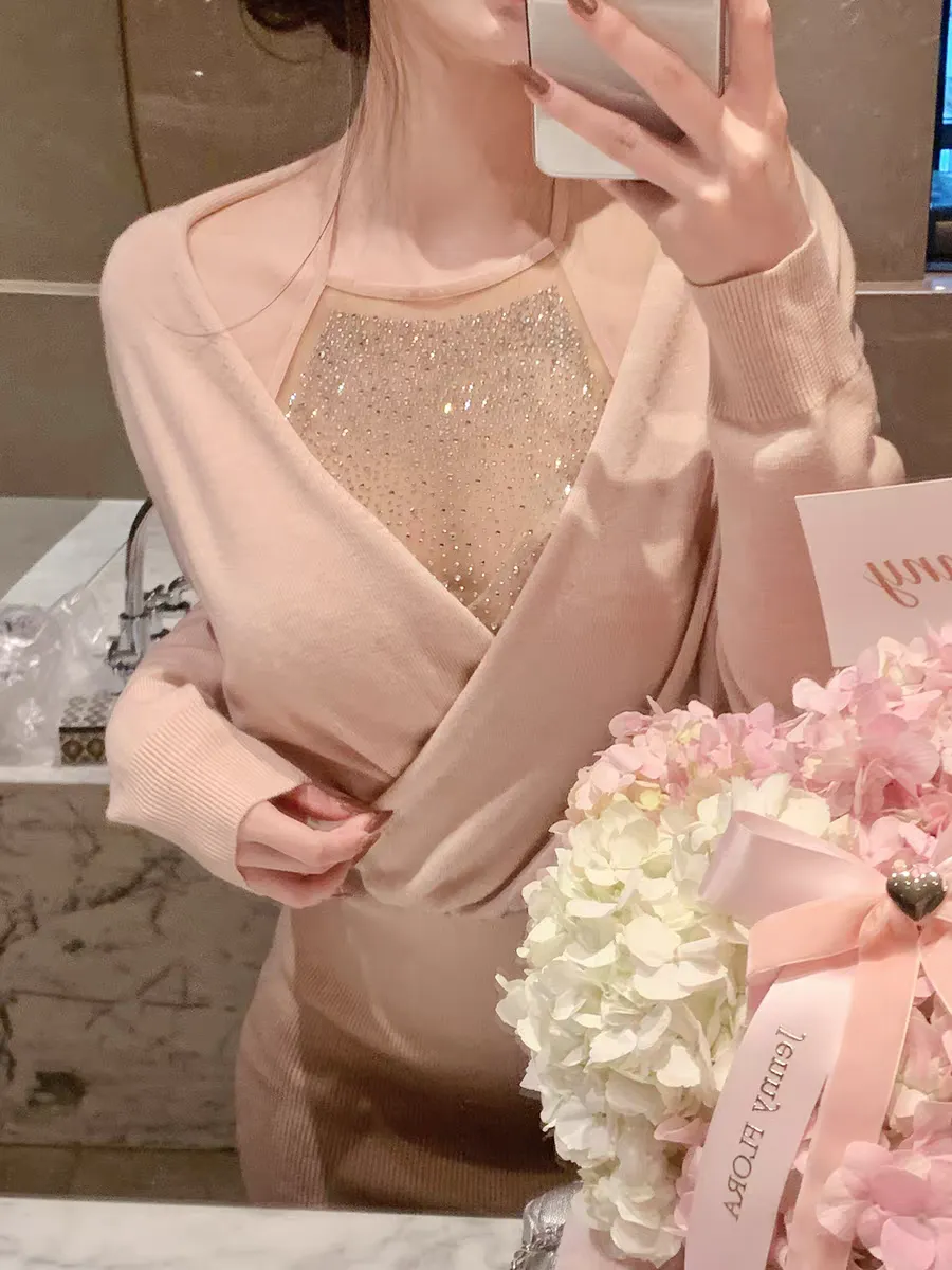 【首尔恋人】亮片挂脖设计感针织包臀连衣裙