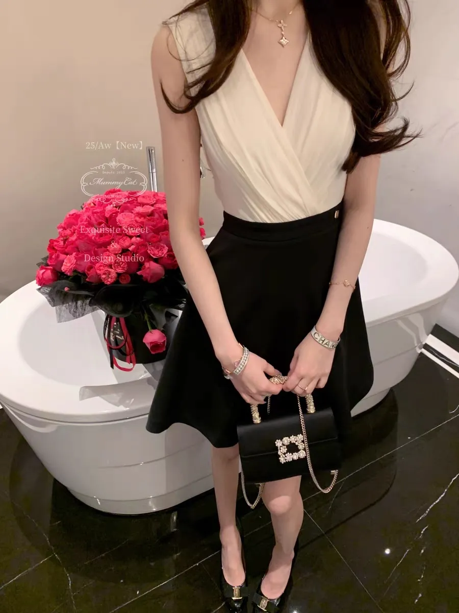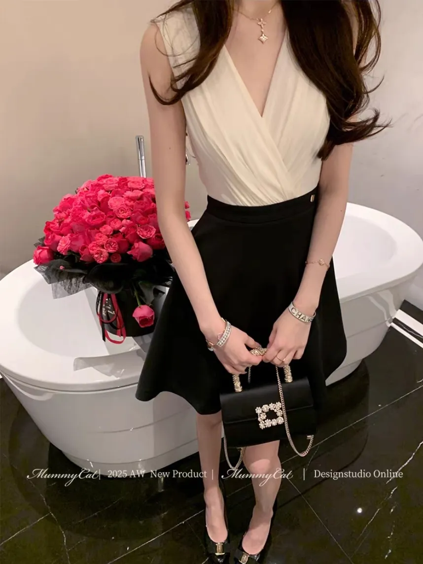 【奥黛丽法则】撞色V领褶皱连衣裙