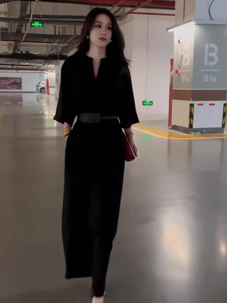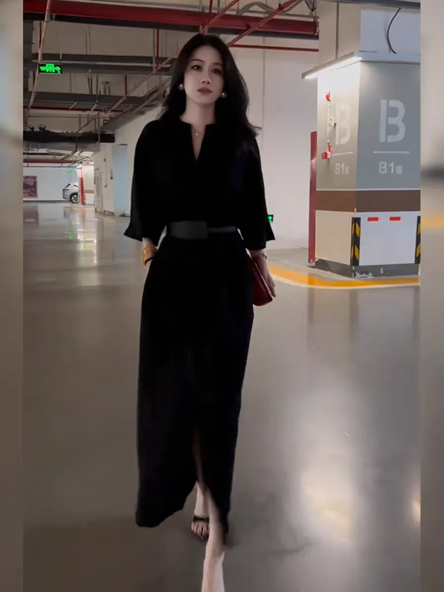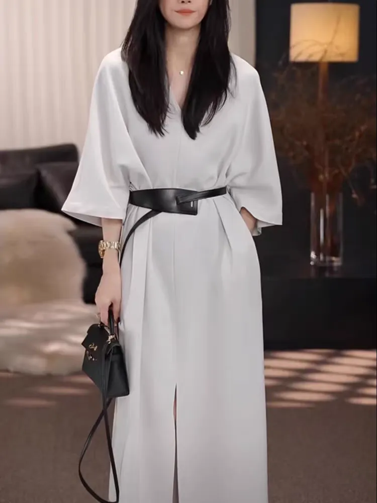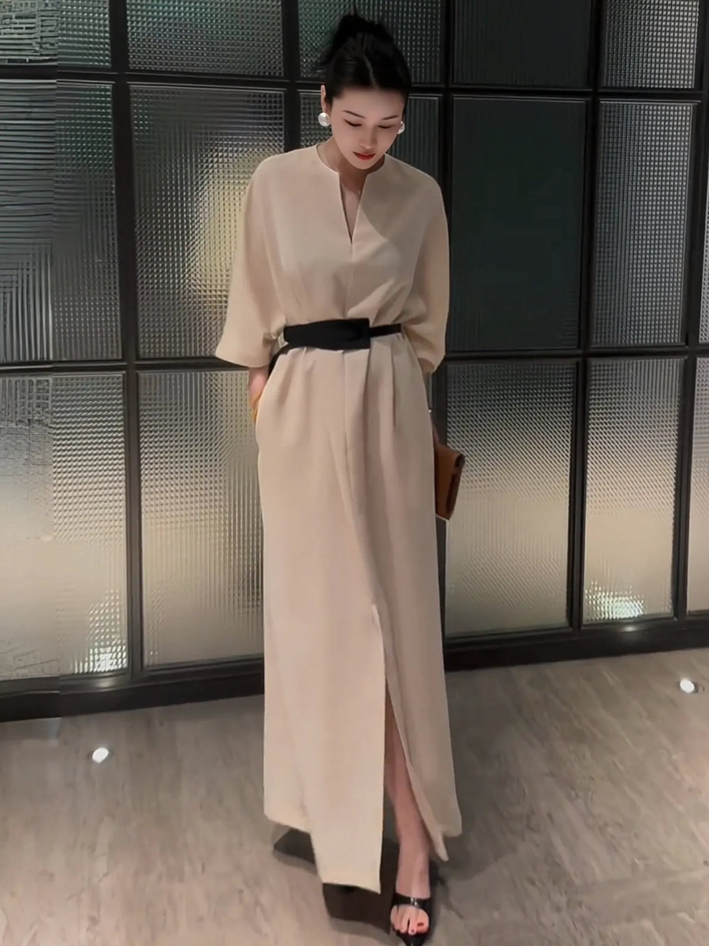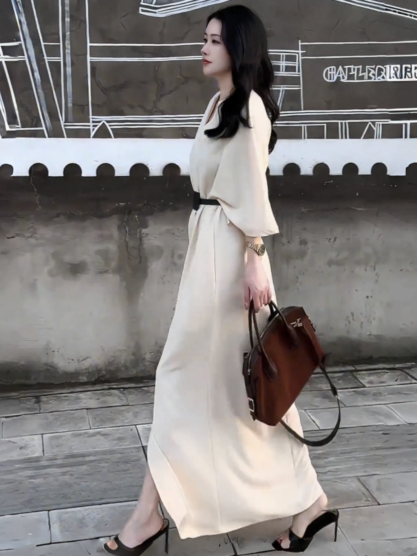【松弛慵懒】V领法式高腰轻奢插肩袖连衣裙长裙