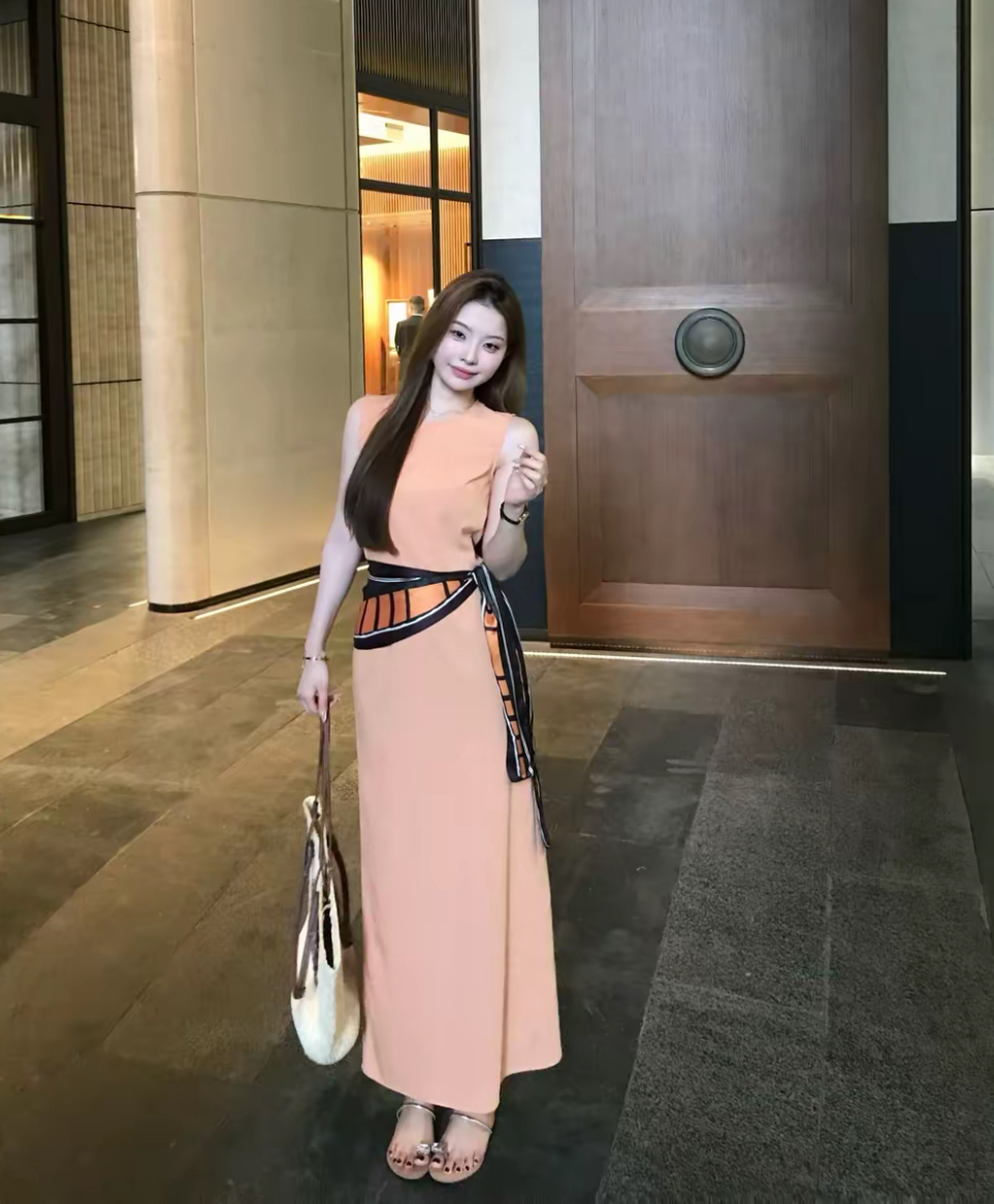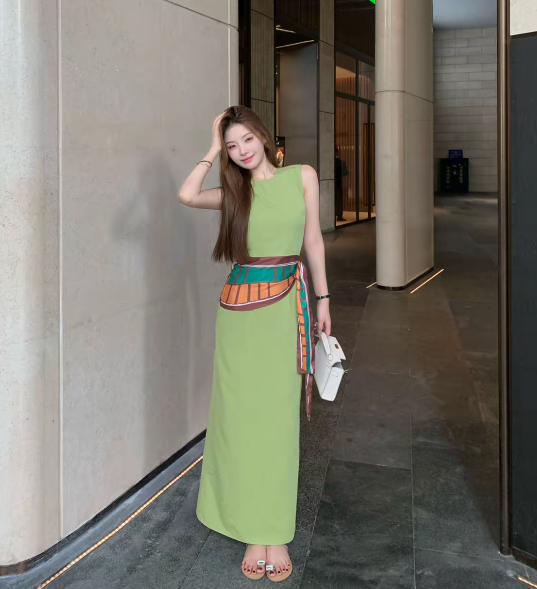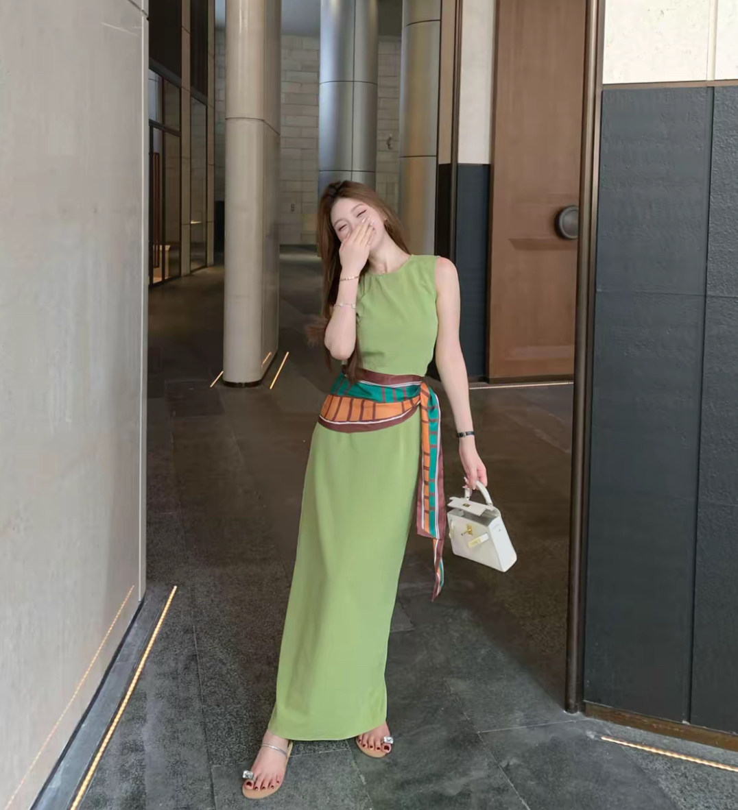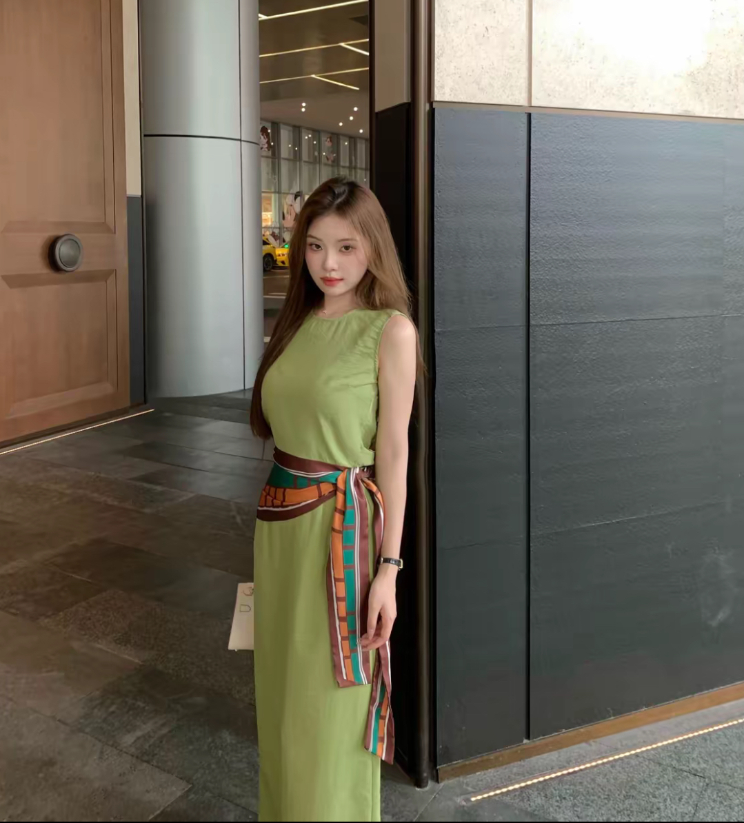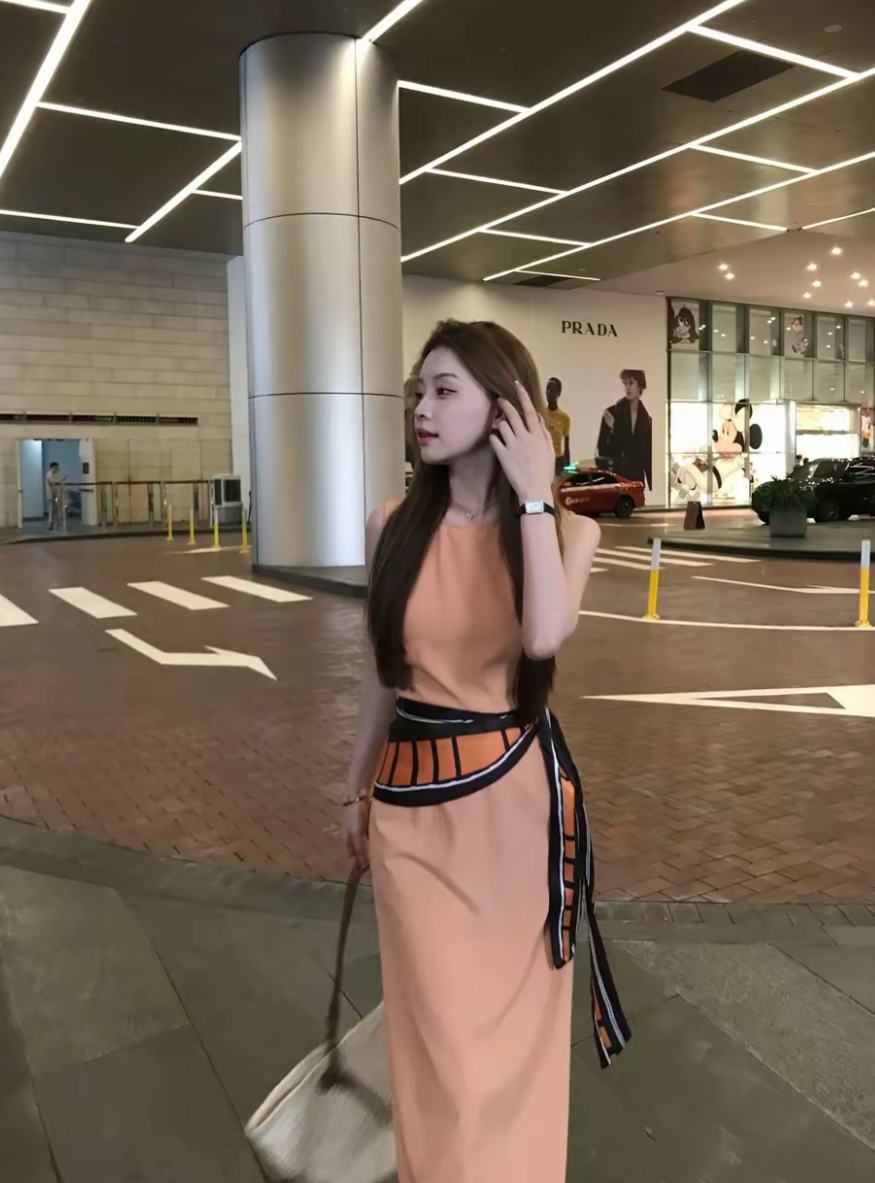 【小岛夏日】高级感丝巾绑带露肩上衣+半身裙套装