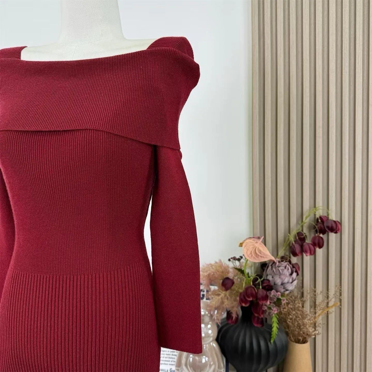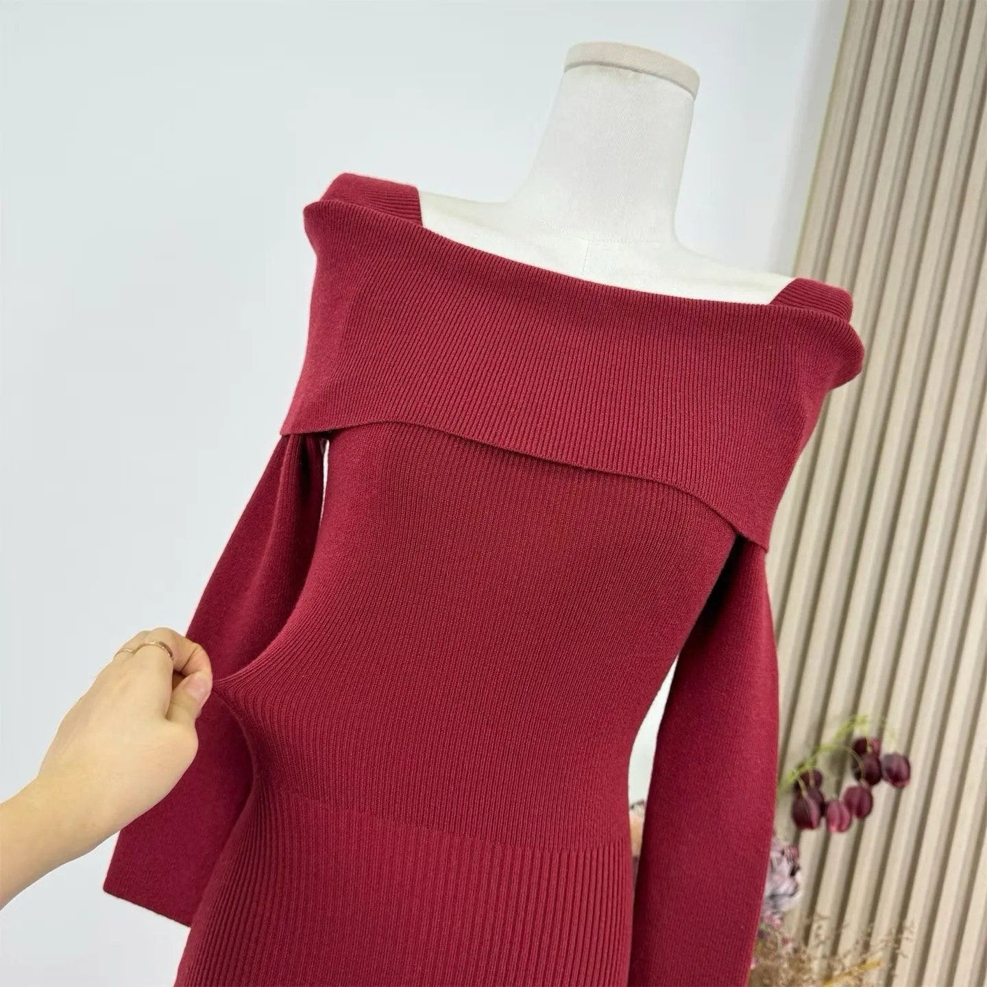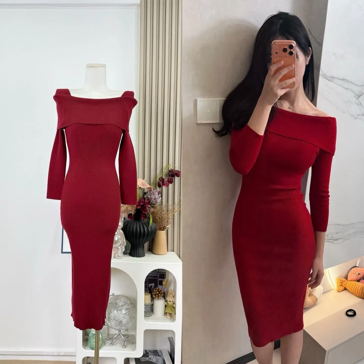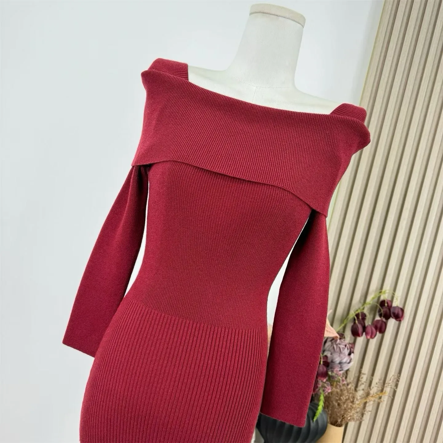 【红调女主】一字领不掉肩8分袖修身针织连衣裙