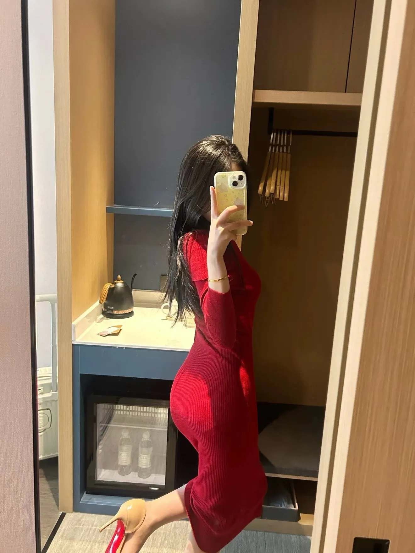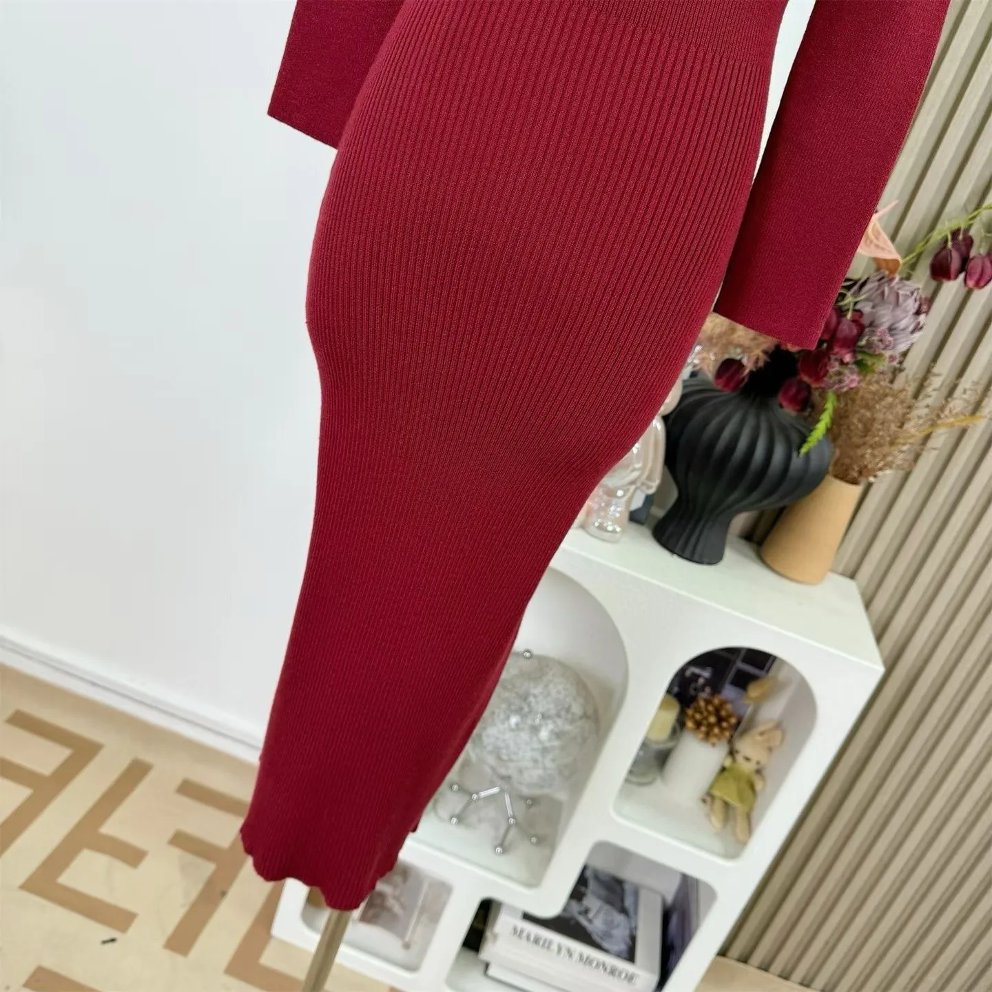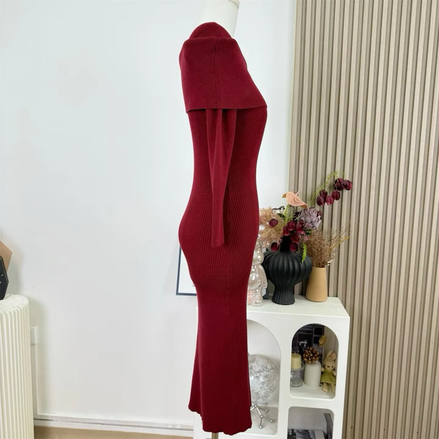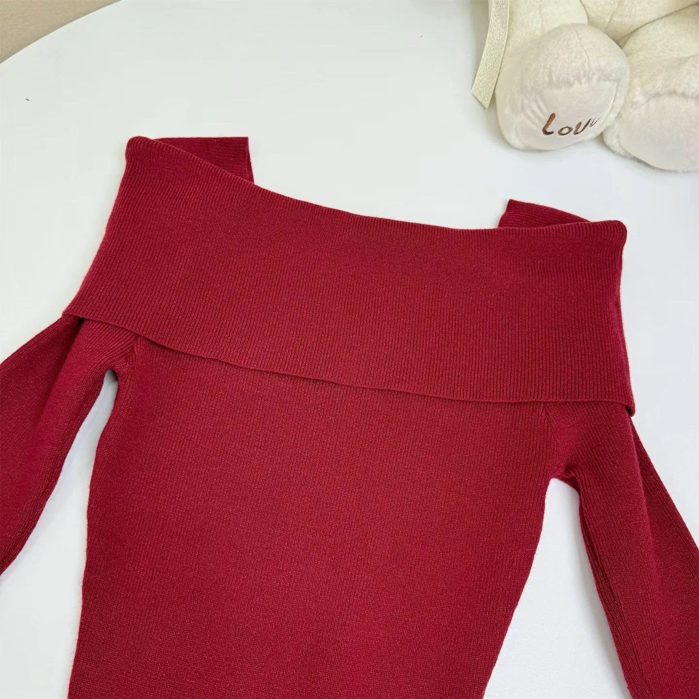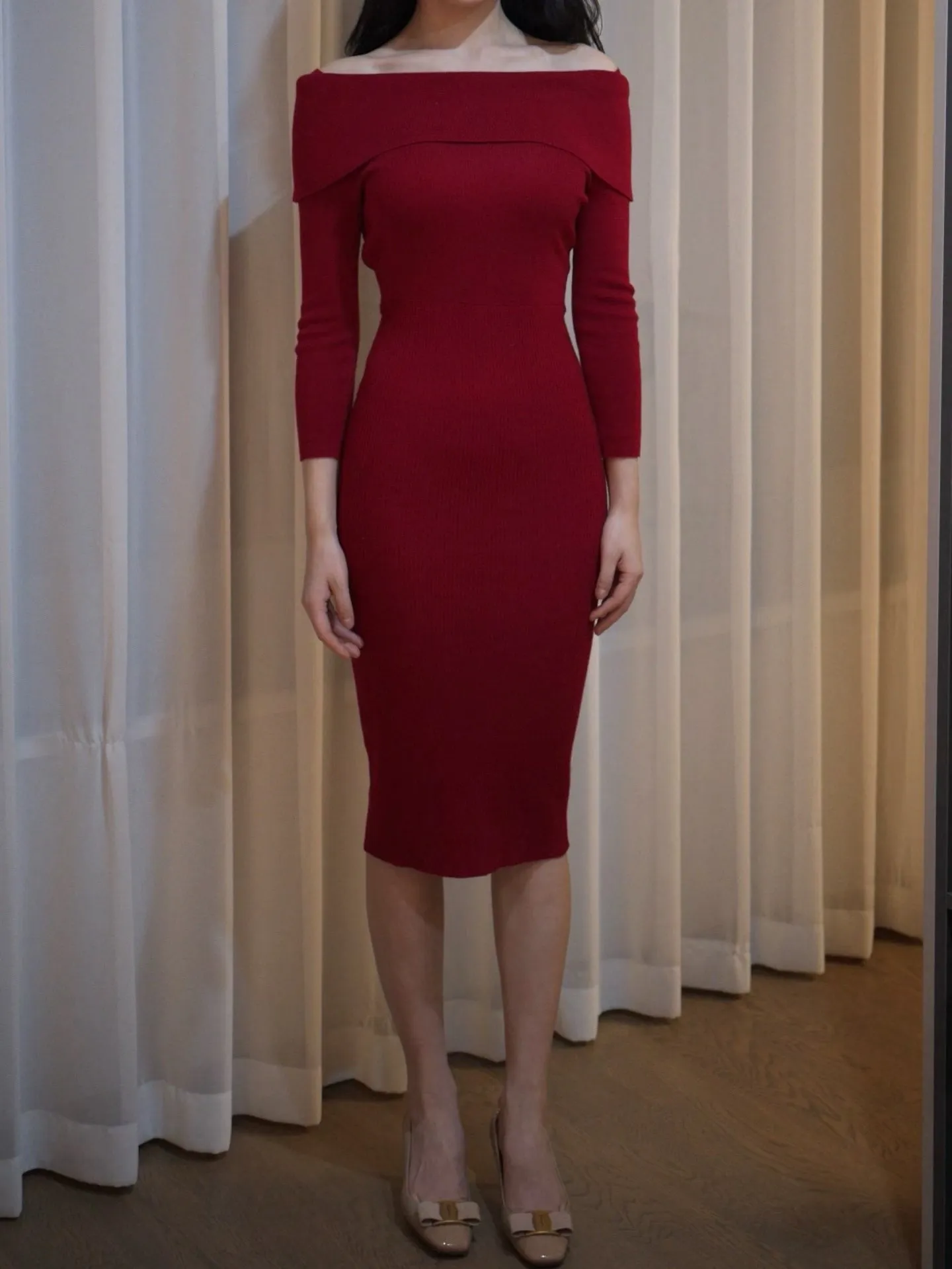 【红调女主】一字领不掉肩8分袖修身针织连衣裙
