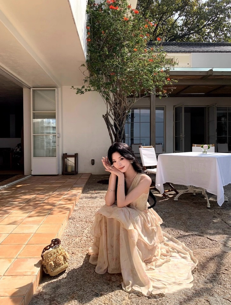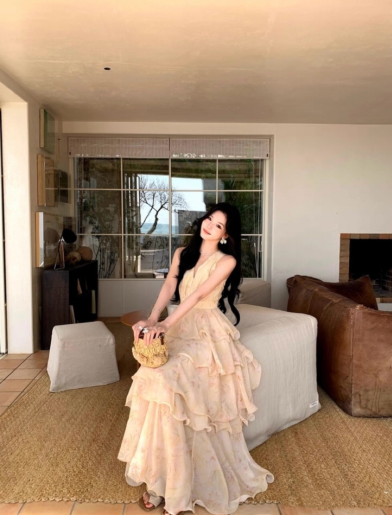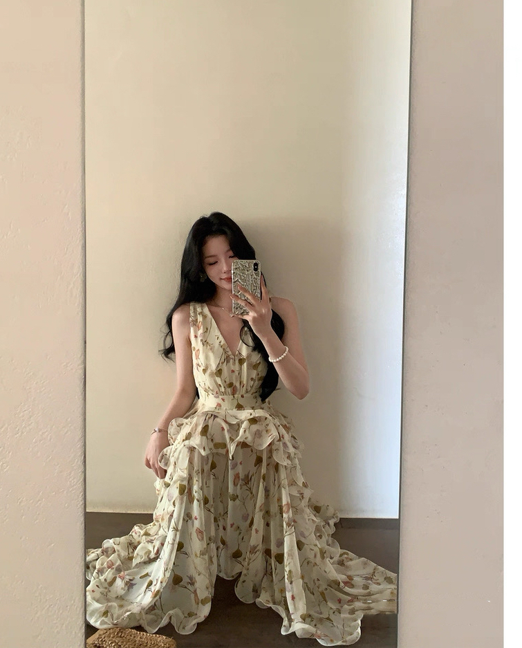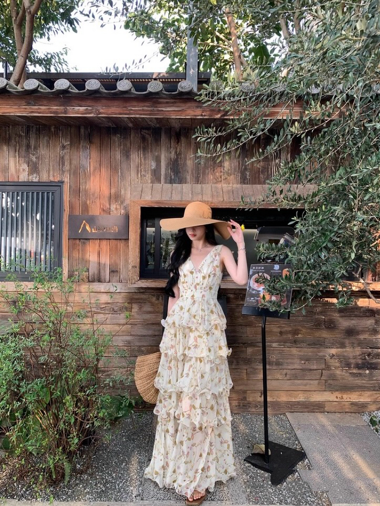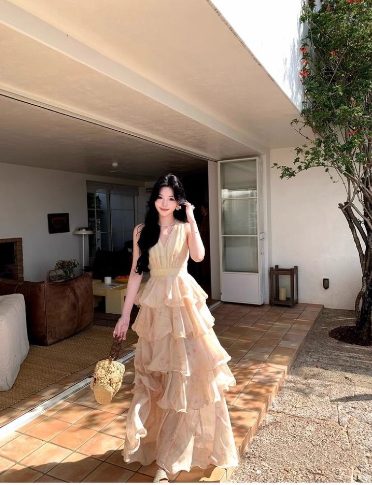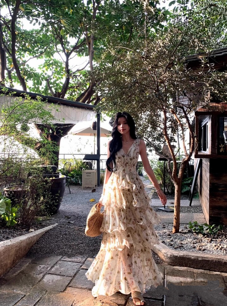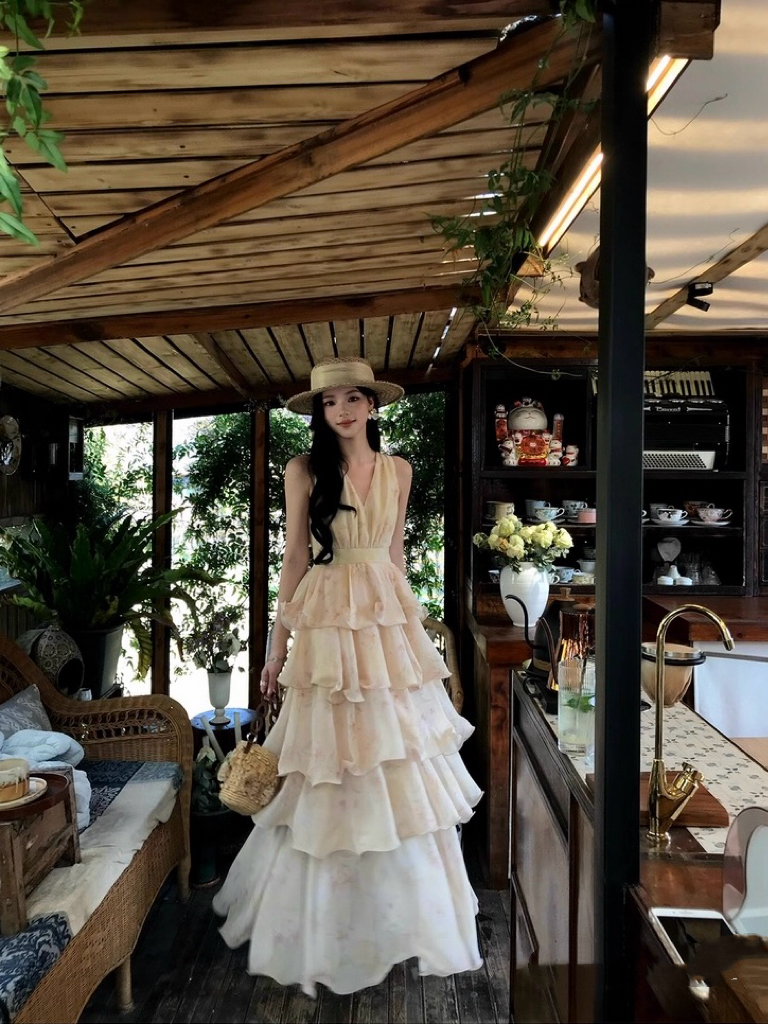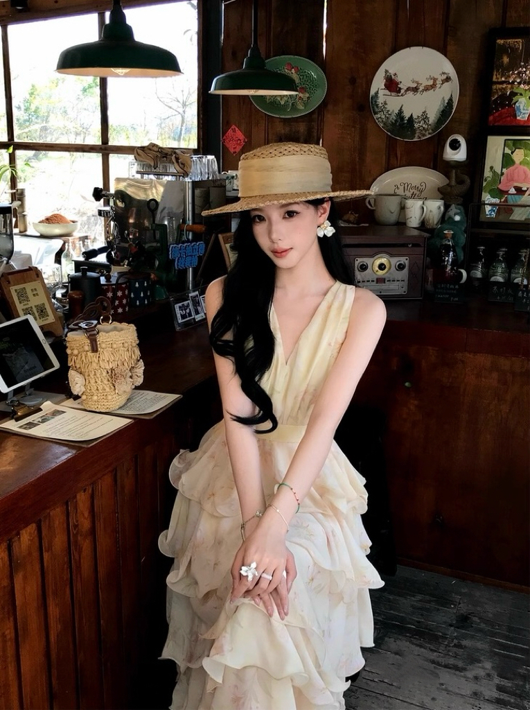 【庄园假日】度假风收腰蛋糕裙v领吊带连衣裙
